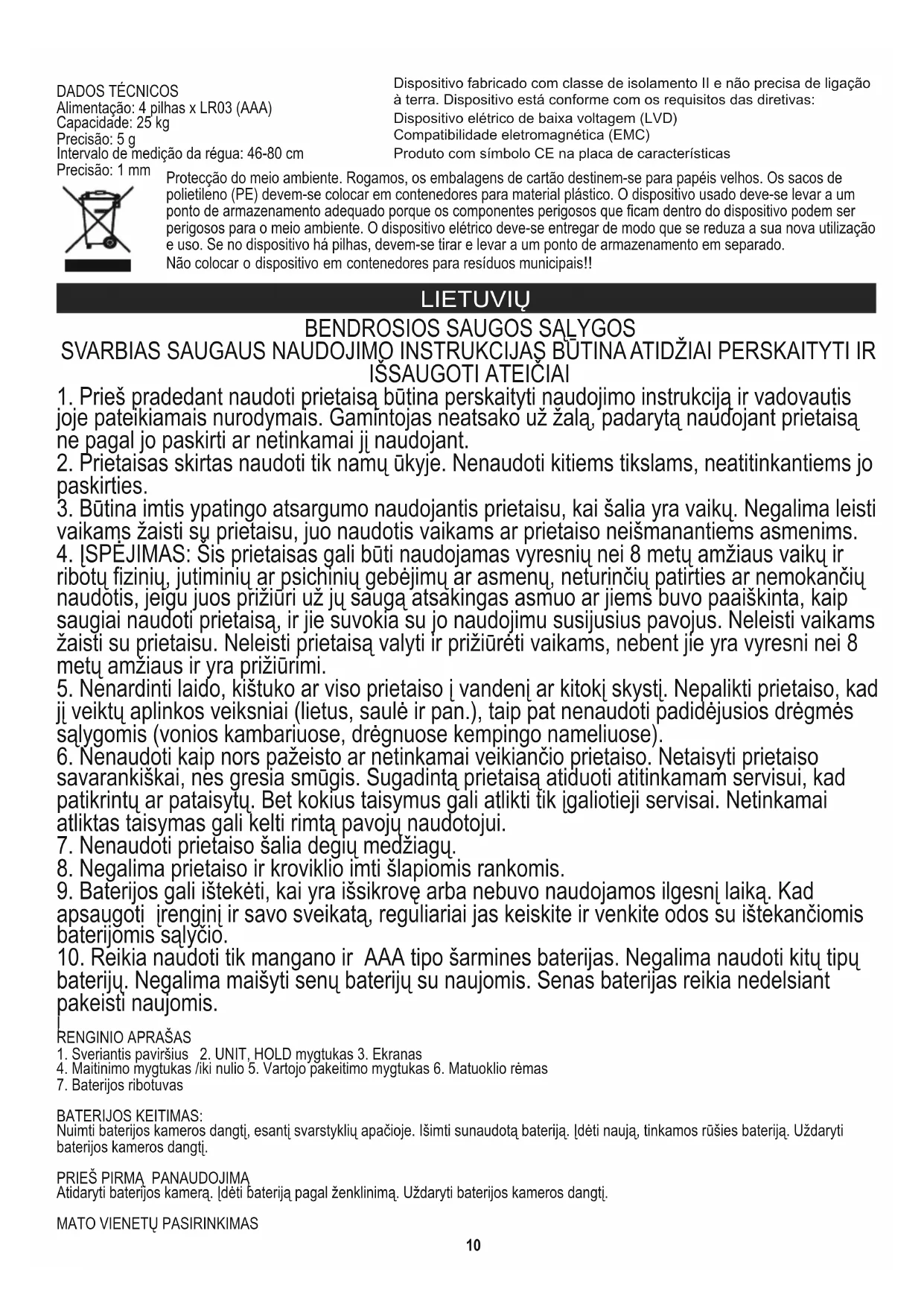 - Valyti švelniai sausu arba lengvai drėgnu skudurėliu. PRANEŠIMAI 5 simbolis - žemas baterijos prikrovimo lygis EEEE - per didelė svarstyklių apkrova TECHNINIAI DUOMENYS Maitinimas: 4 tipo baterija x LR03 (AAA) Apkrova: 25 kg Tikslumas: 5 g Matuoklio apimtis: 46-80 cm Tikslumas 1 mm Rūpinantis aplinka. Kartono pakuotes atiduoti į makulatūrą. Polietileno (PE) maišelius mesti į plastikui skirtą konteinerį. Susidėvėjusį prietaisą atiduoti į atitinkamą atliekų surinkimo vietą, nes prietaise esančios pavojingos medžiagos gali kelti grėsmę aplinkai. Elektrinį prietaisą atiduoti tokį, kad nebūtų galima jo pakartotinai naudoti ir panaudoti. Jeigu prietaise yra baterijos, būtina jas išimti ir atskirai atiduoti į atliekų surinkimo vietą. Nemesti prietaiso į buitinių atliekų konteinerį! LATVIEŠU Prietaisas yra II izoliacijos klasės ir nereikia jo įžeminti. Prietaisas atitinka šių direktyvų reikalavimus: Elektrinis žemos įtampos prietaisas (LVD) Elektromagnetinis suderinamumas (EMC) Prietaisas turi CE ženklą vardinėje lentelėje.