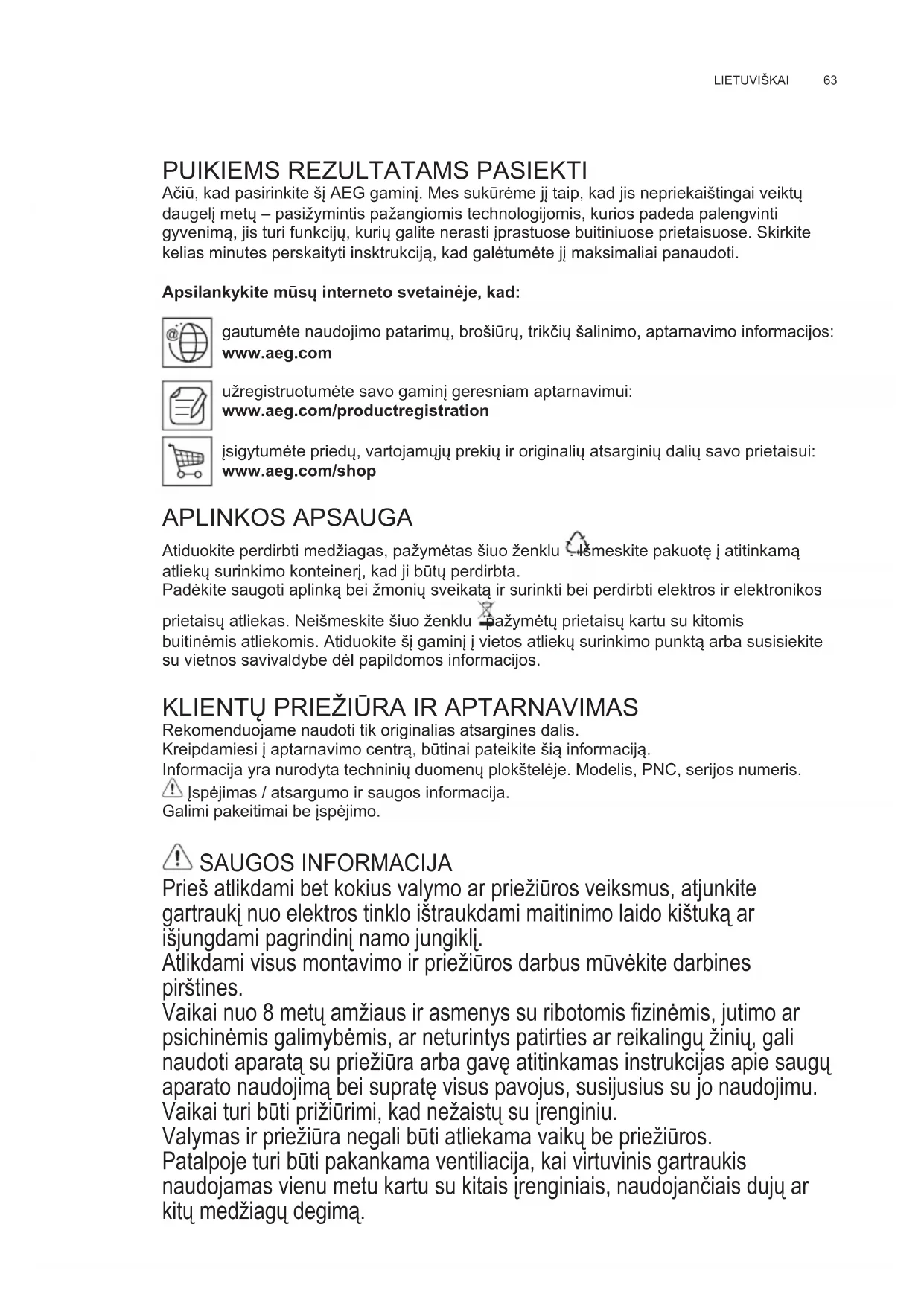 Ačiū, kad pasirinkite šį AEG gaminį. Mes sukūrėme jį taip, kad jis nepriekaištingai veiktų daugelį metų – pasižymintis pažangiomis technologijomis, kurios padeda palengvinti gyvenimą, jis turi funkcijų, kurių galite nerasti įprastuose buitiniuose prietaisuose. Skirkite kelias minutes perskaityti insktrukciją, kad galėtumėte jį maksimaliai panaudoti. Apsilankykite mūsų interneto svetainėje, kad: gautumėte naudojimo patarimų, brošiūrų, trikčių šalinimo, aptarnavimo informacijos: www.aeg.com užregistruotumėte savo gaminį geresniam aptarnavimui: www.aeg.com/productregistration įsigytumėte priedų, vartojamųjų prekių ir originalių atsarginių dalių savo prietaisui: www.aeg.com/shop APLINKOS APSAUGA Atiduokite perdirbti medžiagas, pažymėtas šiuo ženklu . Išmeskite pakuotę į atitinkamą atliekų surinkimo konteinerį, kad ji būtų perdirbta. Padėkite saugoti aplinką bei žmonių sveikatą ir surinkti bei perdirbti elektros ir elektronikos prietaisų atliekas. Neišmeskite šiuo ženklu pažymėtų prietaisų kartu su kitomis buitinėmis atliekomis. Atiduokite šį gaminį į vietos atliekų surinkimo punktą arba susisiekite su vietnos savivaldybe dėl papildomos informacijos.