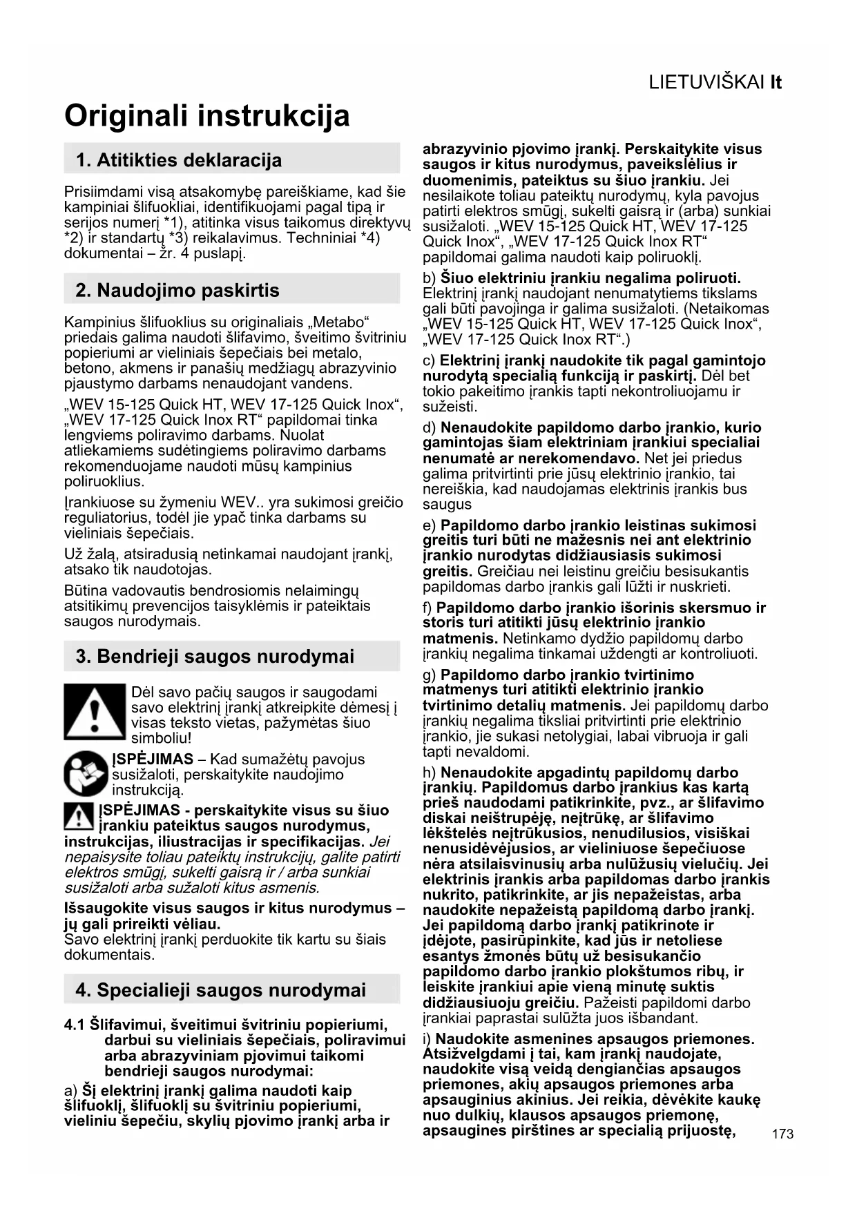 Originali instrukcija Prisiimdami visą atsakomybę pareiškiame, kad šie kampiniai šlifuokliai, identifikuojami pagal tipą ir serijos numerį *1), atitinka visus taikomus direktyvų *2) ir standartų *3) reikalavimus. Techniniai *4) dokumentai – žr. 4 puslapį. Kampinius šlifuoklius su originaliais „Metabo“ priedais galima naudoti šlifavimo, šveitimo švitriniu popieriumi ar vieliniais šepečiais bei metalo, betono, akmens ir panašių medžiagų abrazyvinio pjaustymo darbams nenaudojant vandens. „WEV 15-125 Quick HT, WEV 17-125 Quick Inox“, „WEV 17-125 Quick Inox RT“ papildomai tinka lengviems poliravimo darbams. Nuolat atliekamiems sudėtingiems poliravimo darbams rekomenduojame naudoti mūsų kampinius poliruoklius. Įrankiuose su žymeniu WEV.. yra sukimosi greičio reguliatorius, todėl jie ypač tinka darbams su vieliniais šepečiais. Už žalą, atsiradusią netinkamai naudojant įrankį, atsako tik naudotojas. Būtina vadovautis bendrosiomis nelaimingų atsitikimų prevencijos taisyklėmis ir pateiktais saugos nurodymais. Dėl savo pačių saugos ir saugodami savo elektrinį įrankį atkreipkite dėmesį į visas teksto vietas, pažymėtas šiuo simboliu! ĮSPĖJIMAS – Kad sumažėtų pavojus susižaloti, perskaitykite naudojimo instrukciją. ĮSPĖJIMAS - perskaitykite visus su šiuo įrankiu pateiktus saugos nurodymus, instrukcijas, iliustracijas ir specifikacijas. Jei nepaisysite toliau pateiktų instrukcijų, galite patirti elektros smūgį, sukelti gaisrą ir / arba sunkiai susižaloti arba sužaloti kitus asmenis. Išsaugokite visus saugos ir kitus nurodymus – jų gali prireikti vėliau. Savo elektrinį įrankį perduokite tik kartu su šiais dokumentais.