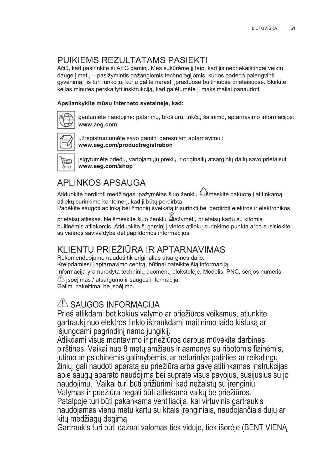 Ačiū, kad pasirinkite šį AEG gaminį. Mes sukūrėme jį taip, kad jis nepriekaištingai veiktų daugelį metų – pasižymintis pažangiomis technologijomis, kurios padeda palengvinti gyvenimą, jis turi funkcijų, kurių galite nerasti įprastuose buitiniuose prietaisuose. Skirkite kelias minutes perskaityti insktrukciją, kad galėtumėte jį maksimaliai panaudoti. Apsilankykite mūsų interneto svetainėje, kad: gautumėte naudojimo patarimų, brošiūrų, trikčių šalinimo, aptarnavimo informacijos: www.aeg.com užregistruotumėte savo gaminį geresniam aptarnavimui: www.aeg.com/productregistration įsigytumėte priedų, vartojamųjų prekių ir originalių atsarginių dalių savo prietaisui: www.aeg.com/shop APLINKOS APSAUGA Atiduokite perdirbti medžiagas, pažymėtas šiuo ženklu . Išmeskite pakuotę į atitinkamą atliekų surinkimo konteinerį, kad ji būtų perdirbta. Padėkite saugoti aplinką bei žmonių sveikatą ir surinkti bei perdirbti elektros ir elektronikos prietaisų atliekas. Neišmeskite šiuo ženklu pažymėtų prietaisų kartu su kitomis buitinėmis atliekomis. Atiduokite šį gaminį į vietos atliekų surinkimo punktą arba susisiekite su vietnos savivaldybe dėl papildomos informacijos.