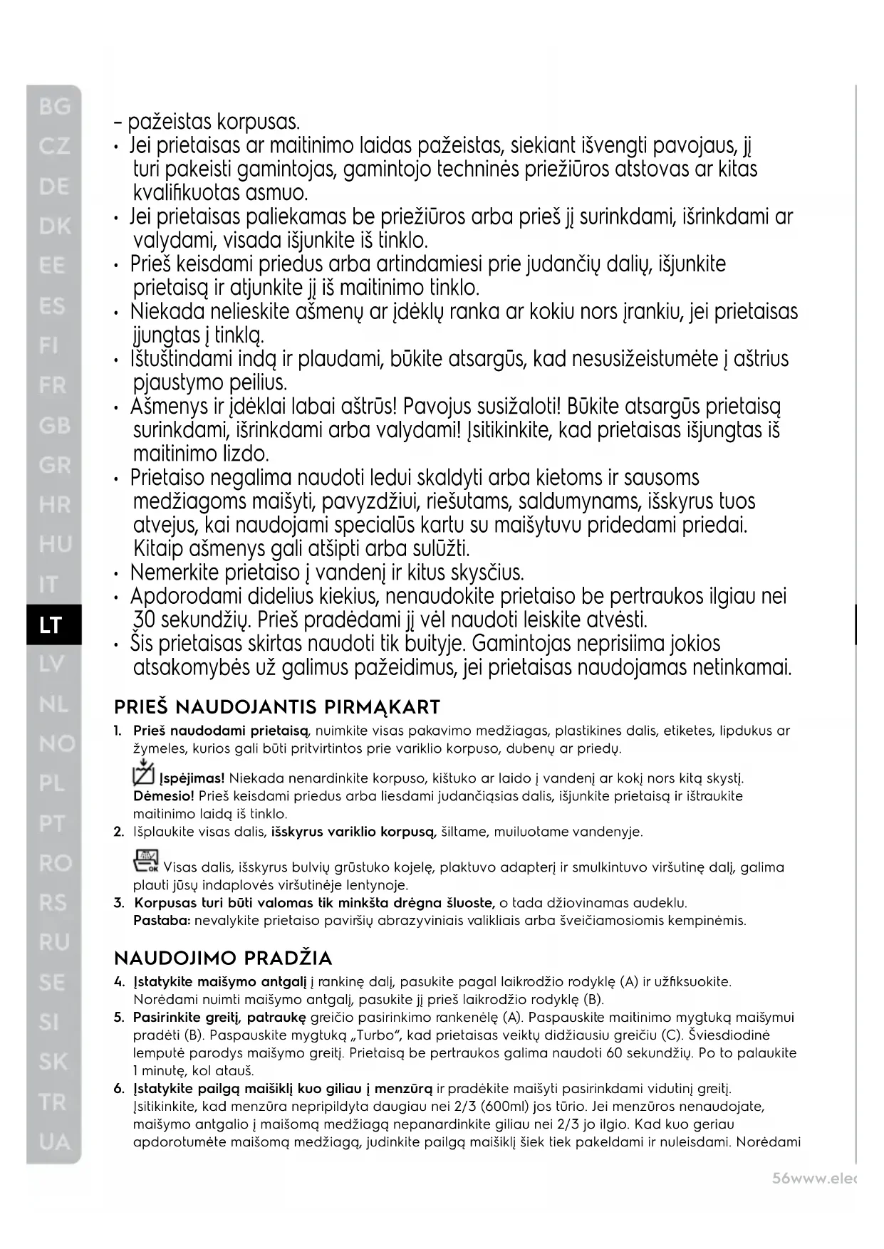 J. Smulkinimo dubuo* K. Smulkinimo dubens dangtis* L. Smulkinimo dubens peilis* M. Bulvių grūstukas* *priklauso nuo modelio SAUGOS PATARIMAS Prieš pirmą kartą naudodami prietaisą atidžiai perskaitykite toliau pateiktas instrukcijas.