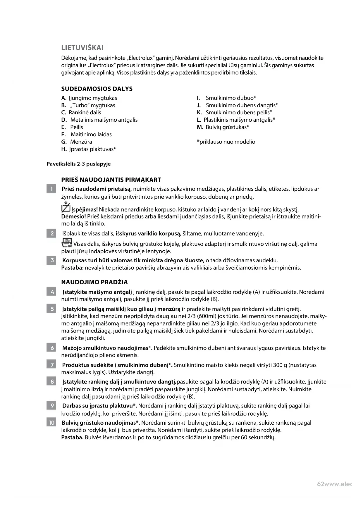 J. Smulkinimo dubens dangtis* K. Smulkinimo dubens peilis* L. Plastikinis maišymo antgalis* M. Bulvių grūstukas* *priklauso nuo modelio Paveikslėlis 2-3 puslapyje