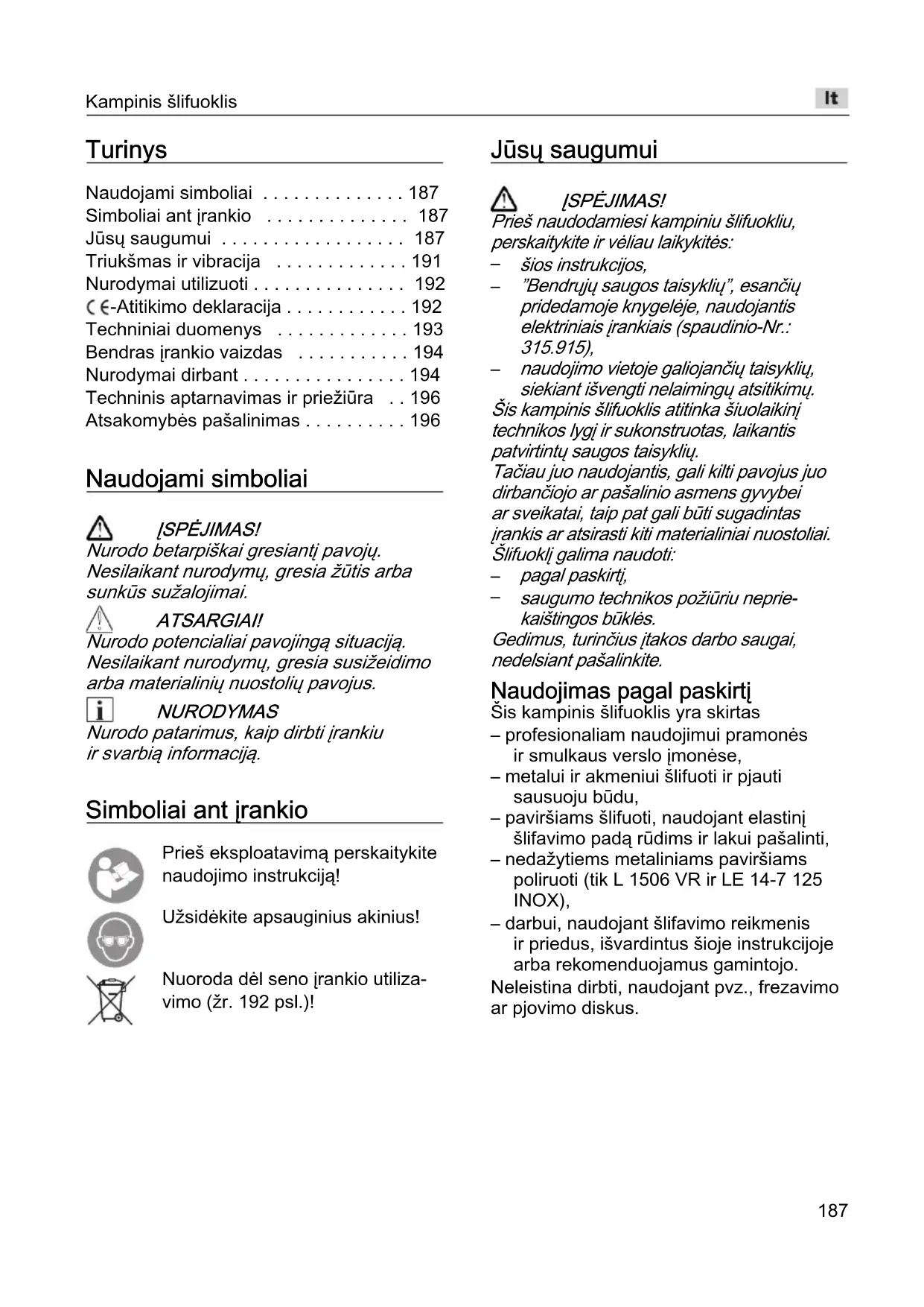 - Atsakomybės pašalinimas Naudojami simboliai ĮSPĖJIMAS! Nurodo betarpiškai gresiantį pavojų. Nesilaikant nurodymų, gresia žūtis arba sunkūs sužalojimai. ATSARGIAI! Nurodo potencialiai pavojingą situaciją. Nesilaikant nurodymų, gresia susižeidimo arba materialinių nuostolių pavojus. NURODYMAS Nurodo patarimus, kaip dirbti įrankiu ir svarbią informaciją. Simboliai ant įrankio Prieš eksploatavimą perskaitykite naudojimo instrukciją! Užsidėkite apsauginius akinius! Nuoroda dėl seno įrankio utiliza- vimo (žr. 192 psl.)! Jūsų saugumui ĮSPĖJIMAS! Prieš naudodamiesi kampiniu šlifuokliu, perskaitykite ir vėliau laikykitės: p. 196