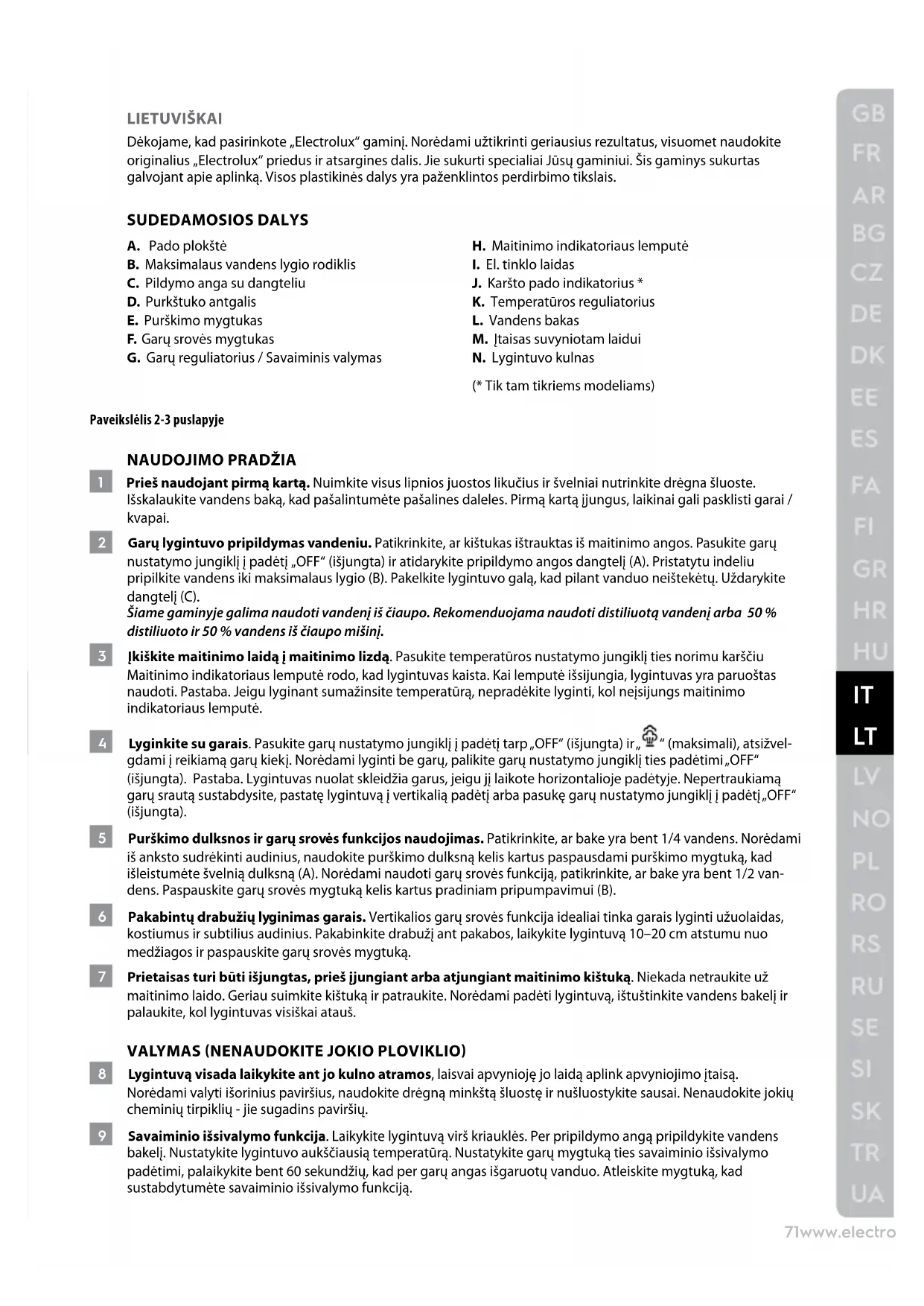 LIETUVIŠKAI Dėkojame, kad pasirinkote „Electrolux“ gaminį. Norėdami užtikrinti geriausius rezultatus, visuomet naudokite originalius „Electrolux“ priedus ir atsargines dalis. Jie sukurti specialiai Jūsų gaminiui. Šis gaminys sukurtas galvojant apie aplinką. Visos plastikinės dalys yra paženklintos perdirbimo tikslais. SUDEDAMOSIOS DALYS A. Pado plokštė B. Maksimalaus vandens lygio rodiklis C. Pildymo anga su dangteliu D. Purkštuko antgalis E. Purškimo mygtukas F. Garų srovės mygtukas G. Garų reguliatorius / Savaiminis valymas H. Maitinimo indikatoriaus lemputė