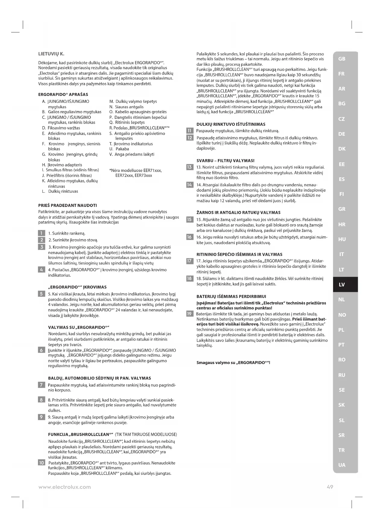 UALIETUVIŲ K. Dėkojame, kad pasirinkote dulkių siurblį „Electrolux ERGORAPIDO®“. Norėdami pasiekti geriausių rezultatų , visada naudokite tik originalius „Electrolux“ priedus ir atsargines dalis. Jie pagaminti specialiai šiam dulkių siurbliui. Šis gaminys sukurtas atsižvelgiant į aplinkosaugos reikalavimus. Visos plastikinės dalys yra pažymėtos kaip tinkamos perdirbti.