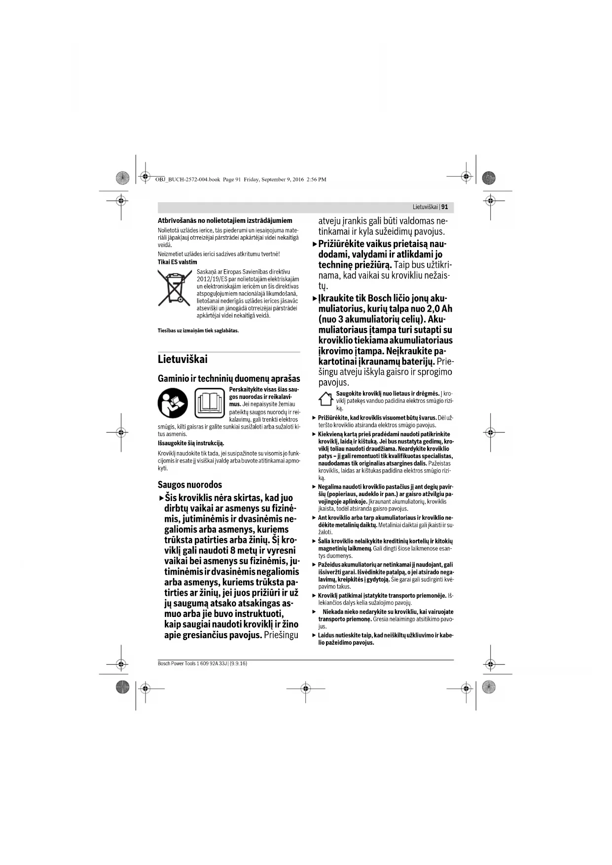 OBJ_BUCH-2572-004.book Page 92 Friday, September 9, 2016 2:56 PM한국어 | 93 Bosch Power Tools 1 609 92A 33J | (9.9.16) Darbo patarimai Nuolat veikdamas arba be pertraukos vieną po kito krauda- mas kelis akumuliatorius, kroviklis gali įkaisti. Tai yra normalu ir nereiškia kroviklio techninio gedimo. Pastebimas įkrauto akumuliatoriaus veikimo laiko sutrumpėji- mas rodo, kad akumuliatorius susidėvėjo ir jį reikia pakeisti. Gedimai – priežastys ir pašalinimas Priežiūra ir servisas Jei nepaisant kruopščios gamybos ir patikrinimo kroviklis su- gestų, jo remontas turi būti atliekamas įgaliotose Bosch elek- trinių įrankių remonto dirbtuvėse. Klientų aptarnavimo skyrius ir naudotojų konsul- tavimo tarnyba Klientų aptarnavimo skyriuje gausite atsakymus į klausimus, susijusius su jūsų gaminio remontu, technine priežiūra bei at- sarginėmis dalimis. Detalius brėžinius ir informaciją apie at- sargines dalis rasite čia: www.bosch-pt.com Bosch naudotojų konsultavimo tarnybos specialistai mielai at- sakys į klausimus apie mūsų gaminius ir papildomą įrangą. Ieškant informacijos ir užsakant atsargines dalis prašome bū- tinai nurodyti dešimtženklį gaminio numerį, esantį firminėje lentelėje. Lietuva Bosch įrankių servisas Informacijos tarnyba: (037) 713350 ļrankių remontas: (037) 713352 Faksas: (037) 713354 El. paštas: service-pt@lv.bosch.com Šalinimas Krovikliai, papildoma įranga ir pakuotės turi būti ekologiškai utilizuojami. Nemeskite kroviklių į buitinių atliekų konteinerius! Tik ES šalims: Pagal ES direktyvą 2012/19/ES dėl naudotų elektrinių ir elektroninių prietaisų utilizavimo ir pagal vietinius šalies įstatymus naudoti ne- betinkami elektriniai įrankiai turi būti suren- kami atskirai ir gabenami į antrinių žaliavų tvarkymo vietas, kur jie turi būti sunaikinami arba perdirbami aplinkai nekenksmingu būdu. Galimi pakeitimai.
