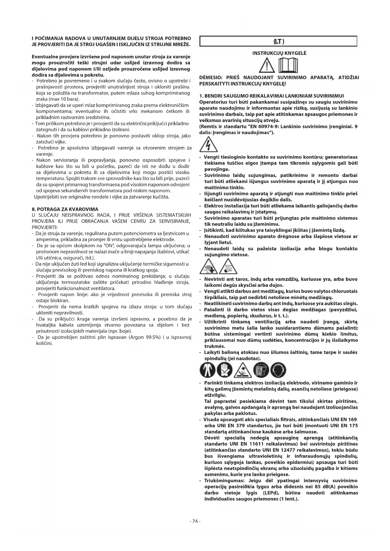 - SUVIRINIMO OPERACIJOS: - Aplinkoje su padidinta elektros smūgio rizika; - Uždarose patalpose; - Esant degioms ar sprogstamoms medžiagoms. TURI BŪTI iš anksto įvertintos ”Įgaliotojo specialisto” ir visada atliekamos dalyvaujant kitiems asmenims, pasirengusiems intervencijai avarijos atveju. PRIVALOMA pritaikyti technines apsaugos priemones, aprašytas standarto “EN 60974-9: Lankinio suvirinimo įrenginiai. 9 dalis: Įrengimas ir naudojimas” 7.10; A.8; A.10 skyriuose. - TURI BŪTI draudžiama atlikti suvirinimo darbus, jei operatorius yra pakeltas auksčiau žemės, išskyrus atvejus, kai naudojamos apsauginės pakylos. - ĮTAMPA TARP ELEKTRODŲ LAIKIKLIŲ ARBA DEGIKLIŲ: virinant vieną gaminį keliais suvirinimo aparatais arba su kelis gaminius, sujungtus elektra, tarp skirtingų elektrodų laikiklių arba degiklių gali susidaryti pavojinga tuščios eigos įtampų suma, kurios dydis gali du kartus viršyti leistinas ribas. Reikia, kad patyręs koordinatorius atliktų instrumentinį matavimą, siekdamas nustatyti, ar yra pavojus ir ar galima pritaikyti tinkamas apsaugos priemones, kaip nurodoma standarto “EN 60974-9: Lankinio suvirinimo įrenginiai. 9 dalis: Įrengimas ir naudojimas”
