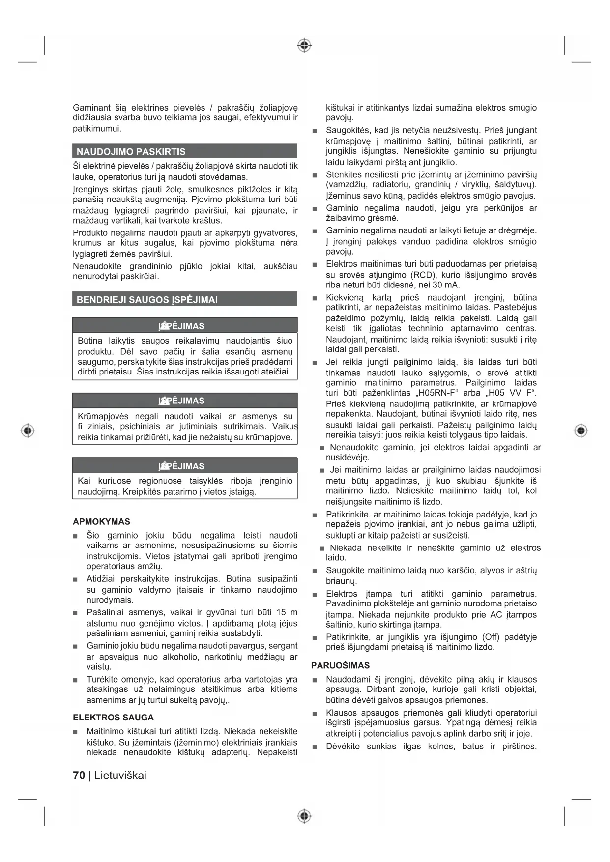 Pievienojiet enerģijas avotam Atvienojiet no enerģijas avota Atsevišķi nopērkamās daļas vai piederumi Piezīme Brīdinājums70 | Lietuviškai Gaminant šią elektrines pievelės / pakraščių žoliapjovę didžiausia svarba buvo teikiama jos saugai, efektyvumui ir patikimumui. NAUDOJIMO PASKIRTIS Ši elektrinė pievelės / pakraščių žoliapjovė skirta naudoti tik lauke, operatorius turi ją naudoti stovėdamas. Įrenginys skirtas pjauti žolę, smulkesnes piktžoles ir kitą panašią neaukštą augmeniją. Pjovimo plokštuma turi būti maždaug lygiagreti pagrindo paviršiui, kai pjaunate, ir maždaug vertikali, kai tvarkote kraštus. Produkto negalima naudoti pjauti ar apkarpyti gyvatvores, krūmus ar kitus augalus, kai pjovimo plokštuma nėra lygiagreti žemės paviršiui. Nenaudokite grandininio pjūklo jokiai kitai, aukščiau nenurodytai paskirčiai.