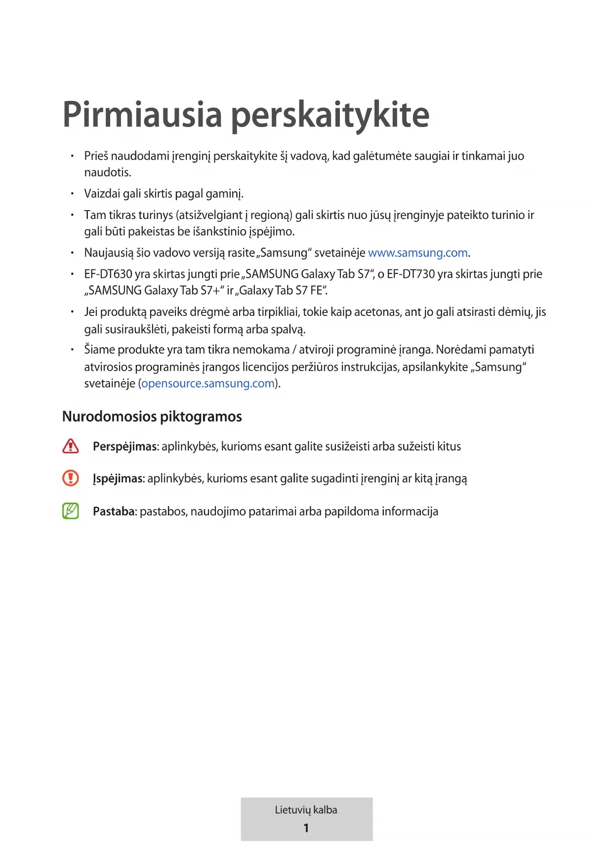 Šiame produkte yra tam tikra nemokama / atviroji programinė įranga. Norėdami pamatyti atvirosios programinės įrangos licencijos peržiūros instrukcijas, apsilankykite „Samsung“ svetainėje (opensource.samsung.com). Nurodomosios piktogramos Perspėjimas: aplinkybės, kurioms esant galite susižeisti arba sužeisti kitus Įspėjimas: aplinkybės, kurioms esant galite sugadinti įrenginį ar kitą įrangą Pastaba: pastabos, naudojimo patarimai arba papildoma informacija2 Lietuvių kalba Darbo pradžia Pakuotės turinys