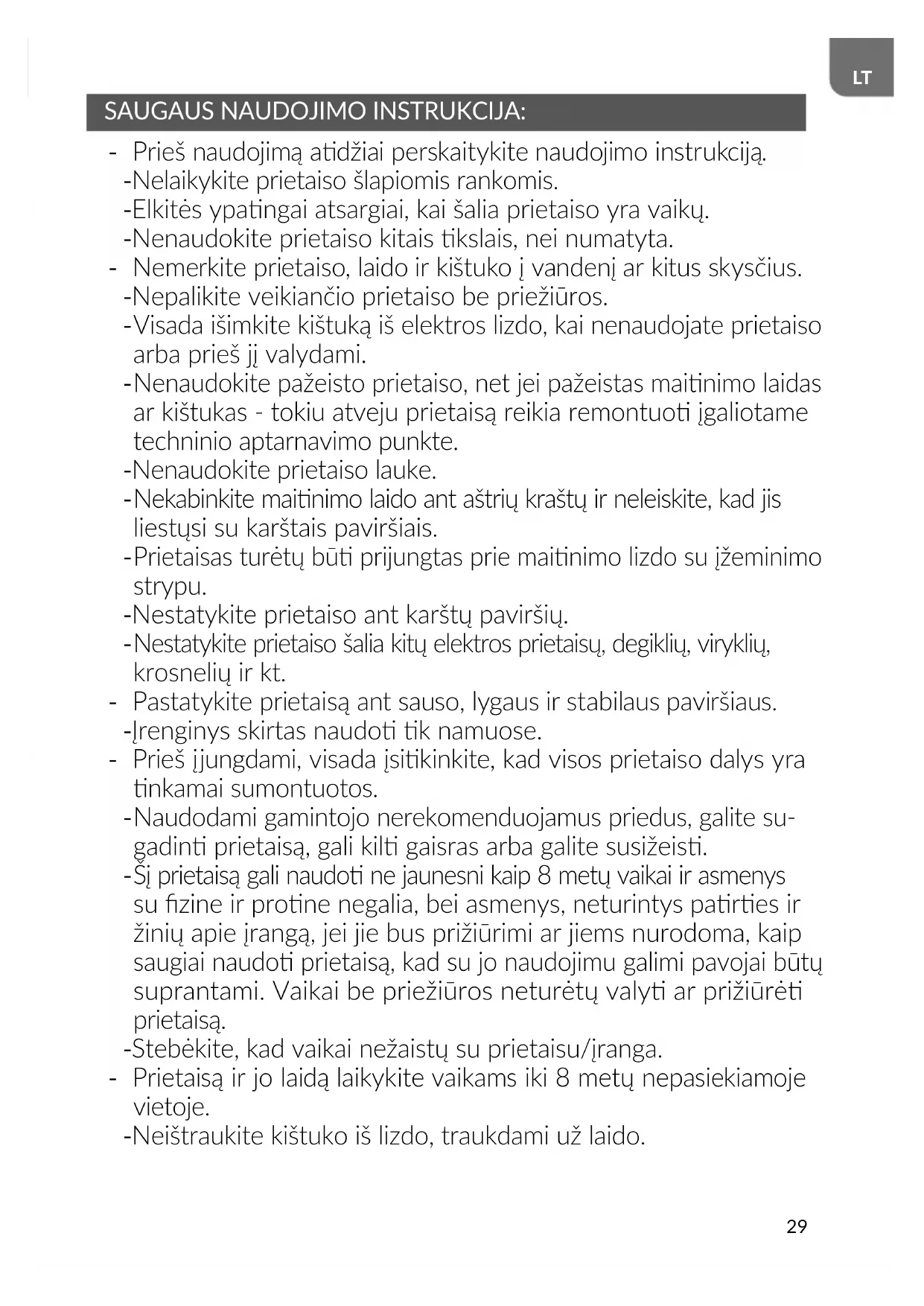 Šį prietaisą gali naudo ne jaunesni kaip 8 metų vaikai ir asmenys su zine ir prone negalia, bei asmenys, neturintys pares ir žinių apie įrangą, jei jie bus prižiūrimi ar jiems nurodoma, kaip saugiai naudo prietaisą, kad su jo naudojimu galimi pavojai būtų suprantami. Vaikai be priežiūros neturėtų valy ar prižiūrė prietaisą. - Stebėkite, kad vaikai nežaistų su prietaisu/įranga. - Prietaisą ir jo laidą laikykite vaikams iki 8 metų nepasiekiamoje vietoje. - Neištraukite kištuko iš lizdo, traukdami už laido.30