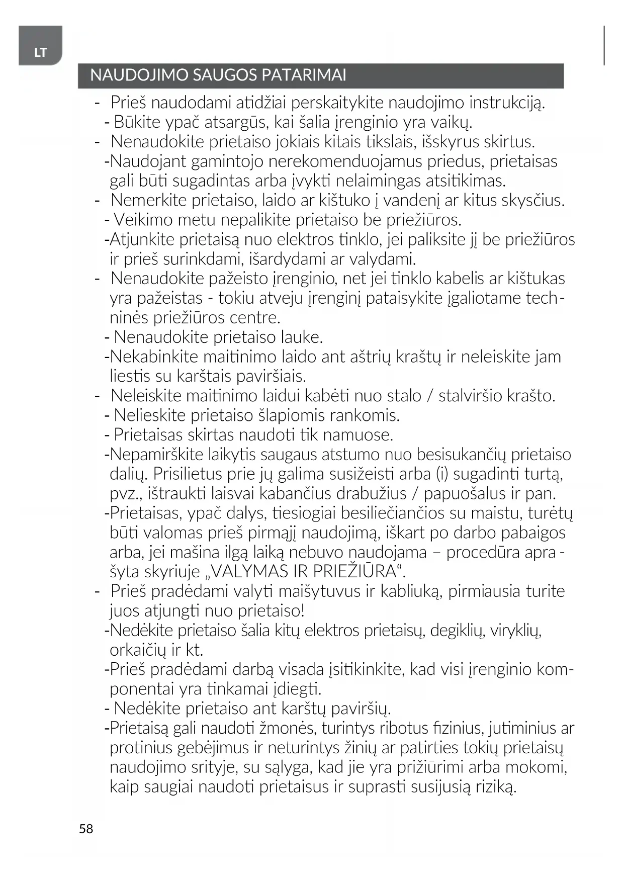 - Prieš naudodami adžiai perskaitykite naudojimo instrukciją. - Būkite ypač atsargūs, kai šalia įrenginio yra vaikų. - Nenaudokite prietaiso jokiais kitais kslais, išskyrus skirtus.
