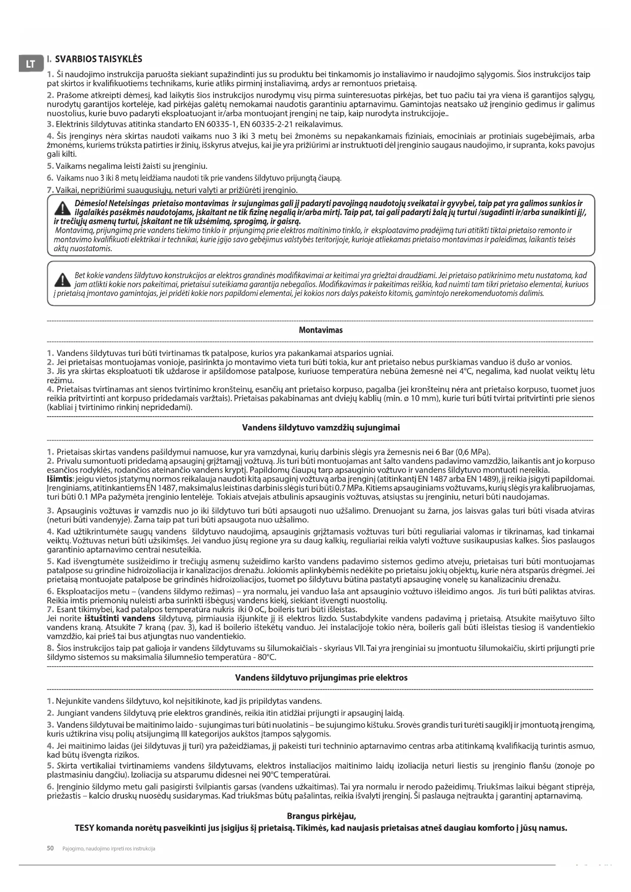 3. Vandens šildytuvai be maitinimo laido - sujungimas turi būti nuolatinis – be sujungimo kištuku. Srovės grandis turi turėti saugiklį ir įmontuotą įrengimą, kuris užtikrina visų polių atsijungimą III kategorijos aukštos įtampos sąlygomis. 4. Jei maitinimo laidas (jei šildytuvas jį turi) yra pažeidžiamas, jį pakeisti turi techninio aptarnavimo centras arba atitinkamą kvalikaciją turintis asmuo, kad būtų išvengta rizikos. 5. Skirta vertikaliai tvirtinamiems vandens šildytuvams, elektros instaliacijos maitinimo laidų izoliacija neturi liestis su įrenginio flanšu (zonoje po plastmasiniu dangčiu). Izoliacija su atsparumu didesnei nei 90°C temperatūrai. 6. Įrenginio šildymo metu gali pasigirsti švilpiantis garsas (vandens užkaitimas). Tai yra normalu ir nerodo pažeidimų. Triukšmas laikui bėgant stiprėja, priežastis – kalcio druskų nuosėdų susidarymas. Kad triukšmas būtų pašalintas, reikia išvalyti įrenginį. Ši paslauga neįtraukta į garantinį aptarnavimą. Brangus pirkėjau, TESY komanda norėtų pasveikinti jus įsigijus šį prietaisą. Tikimės, kad naujasis prietaisas atneš daugiau komforto į jūsų namus.Pajogimo, naudojimo irpreti ros instrukcija 51Lietuvių