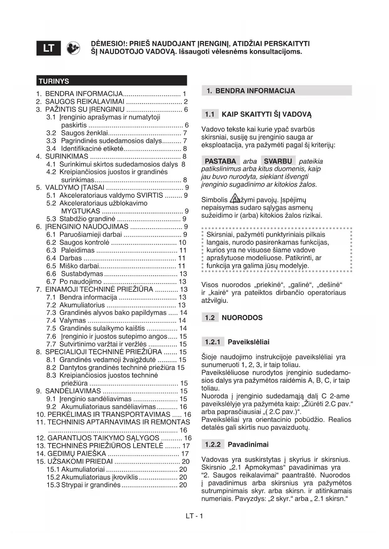 Lentelėje dėl tinkamo strypo ir grandinės suderinimo yra išvardyti visi galimi strypo ir grandinės deriniai. Ta pati lentelė pateikia ir kiekvienam įrenginiu patvirtintų grandinių ir juostų techninius duomenis. Atsarginėms dalims naudoti tik lentelėje paminėtas juostas ir grandines. Nepatvirtintų derinių naudojimas gali sukelti asmens sužalojimų ir sugadinti įrenginį. Atsižvelgiant į tai, kad juostos ir grandi- nės pritaikymas ir naudojimas yra veiksmai, kuriuos apsprendžia pats naudotojas savo paties pasirinkimu, to pasekoje jam tenka ir visa atsakomybė už bet kokios rūšies nuos- tolius, susijusius su šiais veiksmais. Abejo- jant ar trūkstant žinių apie kiekvienos juostos arba grandinės speciką, patartina susisiekti su pardavėju arba su specializuotu sodo cen- tru.LV - 1 UZMANĪBU! PIRMS MAŠĪNAS LIETOŠANAS RŪPĪGI IZLASIET ŠO INSTRUKCIJU. Saglabājiet, jo tā var noderēt arī nākotnē.