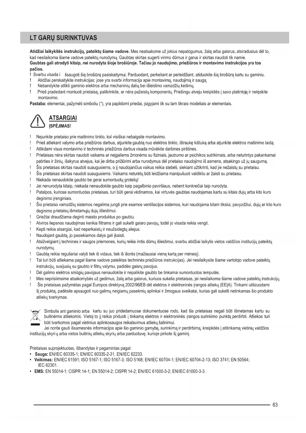 Atidžiai laikykitės instrukcijų, pateiktų šiame vadove. Mes neatsakome už jokius nepatogumus, žalą arba gaisrus, atsiradusius dėl to, kad nesilaikoma šiame vadove pateiktų nurodymų. Gaubtas skirtas sugerti virimo dūmus ir garus ir skirtas naudoti tik namie. Gaubtas gali atrodyti kitaip, nei nurodyta šioje brošiūroje. Tačiau jo naudojimo, priežiūros ir montavimo instrukcijos yra tos pačios. ! Svarbu visada i šsaugoti šią brošiūrą pasiskaitymui. Parduodant, perkeliant ar perleidžiant, atiduokite šią brošiūrą kartu su gaminiu. ! Atidžiai perskaitykite instrukcijas: jose yra svarbi informacija apie montavimą, naudojimą ir saugą. ! Nebandykite atlikti gaminio elektros arba mechaninių dalių bei išleidimo vamzdžių keitimų. ! Prieš pradedant montuoti prietaisą, patikrinkite, ar nėra pažeistų komponentų. Priešingu atveju kreipkitės į savo platintoją ir netęskite montavimo. Pastaba: elementai, pažymėti simboliu (*), yra papildomi priedai, įsigyjami tik su tam tikrais modeliais ar elementais. ATSARGIAI ĮSPĖJIMAS! ! Nejunkite prietaiso prie maitinimo tinklo, kol visiškai nebaigsite montavimo. ! Prieš atliekant valymo arba priežiūros darbus, atjunkite gaubtą nuo elektros tinklo, ištraukę kištuką arba atjunkite elektros maitinimo laidą. ! Atlikdami visus montavimo ir techninės priežiūros darbus visada mūvėkite darbines pirštines. ! Prietaisas nėra skirtas naudoti vaikams ar neįgaliems žmonėms su fiziniais, jautrumo ar psichikos sutrikimais, arba neturintys pakankamai patirties ir žinių, išskyrus atvejus, kai jie dirba prižiūrimi arba nurodymus dėl prietaiso naudojimo iš asmens, atsakingo už jų saugumą. ! Šis prietaisas skirtas naudoti suaugusiems, o jį naudojančius vaikus reikia stebėti, siekiant užtikrinti, kad jie nežaistų su prietaisu. ! Šis prietaisas skirtas naudoti suaugusiems. Vaikams neturėtų būti leidžiama manipuliuoti valdikliu ar žaisti su prietaisu. ! Niekada nenaudokite gaubto be gerai sumontuotų grotelių! ! Jei nenurodyta kitaip, niekada nenaudokite gaubto kaip pagalbinio paviršiaus, nebent konkrečiai taip nurodyta. ! Patalpos, kuriose sumontuotas prietaisas, turi būti gerai vėdinamos, kai virtuvės gaubtas naudojamas kartu su kitais dujų arba kito kuro deginimo įrenginiais. ! Šio prietaiso vamzdžių sistemos negalima jungti prie esamos ventiliacijos sistemos, kuri naudojama kitam tikslui, pavyzdžiui, dujų ar kito kuro deginimo p rietaisų išmetamųjų dujų išleidimui. ! Griežtai draudžiama deginti maisto produktus po gaubtu. ! Atviros liepsnos naudojimas kenkia filtrams ir gali sukelti gaisro pavojų, todėl jo visada reikia vengti. ! Kepti reikia atsargiai, kad neperkaistų ir neužsidegtų aliejus. ! Naudojant gaubtą, jo pasiekiamos dalys gali įkaisti. ! Atsižvelgiant į technines ir saugos priemones, kurių reikia imtis dūmų išleidimui, svarbu atidžiai laikytis vietos valdžios institucijų pateiktų nurodymų. ! Gaubtą reikia reguliariai valyti tiek iš vidaus, tiek iš išorės (mažiausiai vieną kartą per mėnesį). ! Tai turi būti atliekama pagal šiame vadove pateiktas techninės priežiūros instrukcijas). Jei nesilaikysite šiame vartotojo vadove pateiktų instrukcijų, susijusių su gaubto ir filtrų valymu, padidės gaisrų pavojus. ! Dėl galimo elektros smūgių pavojaus nenaudokite ir nepalikite gaubto be tinkamai sumontuotos lemputės. ! Mes neprisiimsime atsakomybės už gedimus, žalą arba gaisrus, kuriuos sukelia prietaisas, jei nesilaikoma šiame vadove pateiktų instrukcijų. ! Šis prietaisas pažymėtas pagal Europos direktyvą 2002/96/EB dėl elektros ir elektroninės įrangos atliekų (EEĮA). Tinkami utilizuodami šį produktą, padėsite apsaugoti nuo galimų neigiamų pasekmių aplinkai ir žmogaus sveikatai, kurias gali sukelti netinkamas šio produkto atliekų tvarkymas. Simbolis ant gaminio arba kartu su juo pridedamuose dokumentuose rodo, kad šis prietaisas negali būti išmetamas kartu su buitinėmis atliekomis. Vietoj to jį reikia priduoti į tinkamą elektros ir elektroninės įrangos surinkimo punktą perdirbti. Atliekos turi būti tvarkomos pagal vietinius aplinkosaugos reikalavimus atliekų šalinimui. Jei norite gauti išsamesnės informacijos apie šio gaminio gamybą, surinkimą ir perdirbimą, kreipkitės į atitinkamą vietinių valdžios institucijų skyri ų arba vietos buitinių atliekų skyrių arba parduotuvę, kurioje pirkote šį gaminį. Prietaisas suprojektuotas, išbandytas ir pagamintas pagal: