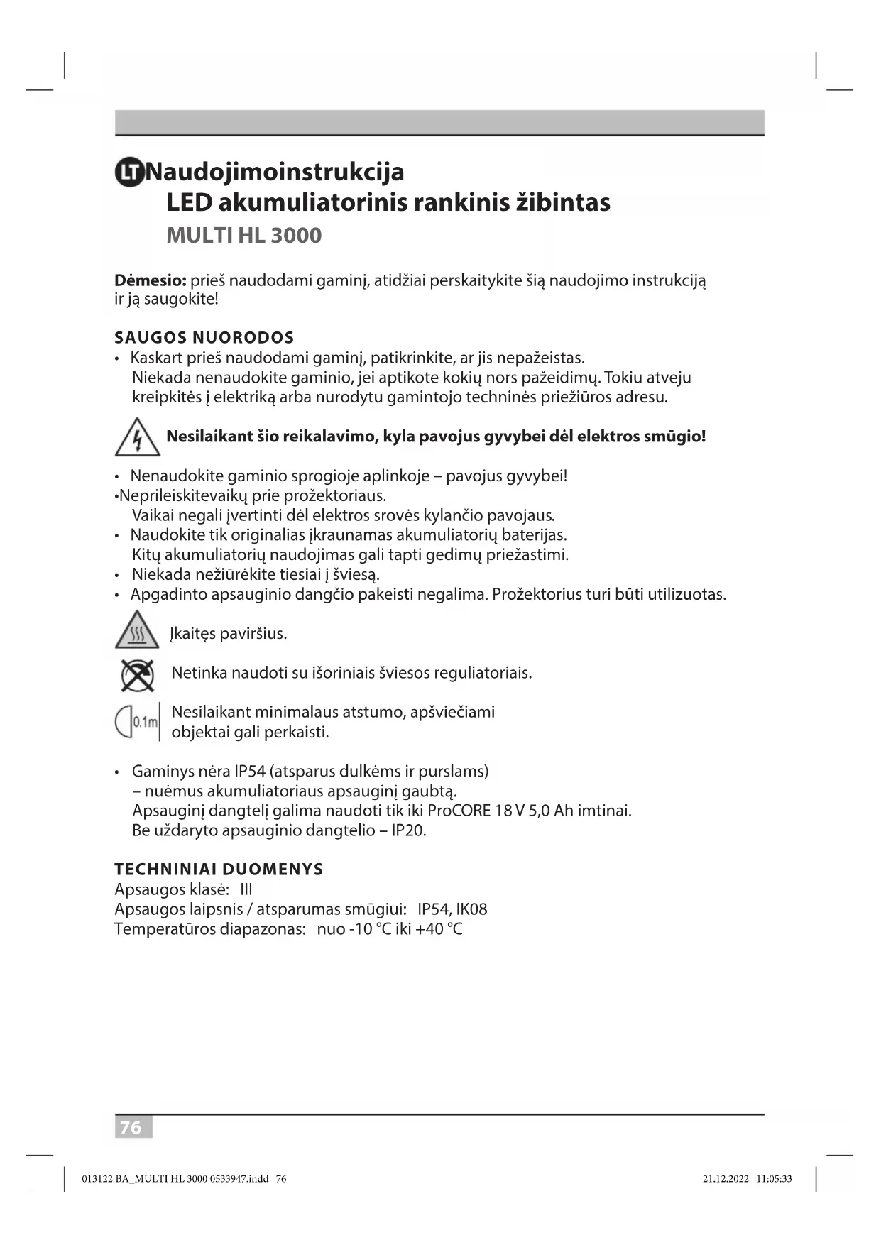 - Gaminys nėra IP54 (atsparus dulkėms ir purslams) – nuėmus akumuliatoriaus apsauginį gaubtą. Apsauginį dangtelį galima naudoti tik iki ProCORE 18 V 5,0 Ah imtinai. Be uždaryto apsauginio dangtelio – IP20. TECHNINIAI DUOMENYS Apsaugos klasė: III Apsaugos laipsnis / atsparumas smūgiui: IP54, IK08 Temperatūros diapazonas: nuo -10 °C iki +40 °C 013122 BA_MULTI HL 3000 0533947.indd 76013122 BA_MULTI HL 3000 0533947.indd 76 21.12.2022 11:05:3321.12.2022 11:05:3377 MULTI HL 3000 Naudojimo instrukcija Tipas: MULTI HL 3000 Suderinami akumuliatorių tipai: Visų turimų adapterių ir atitinkamų akumuliatorių apžvalgą rasite mūsų tinklalapyje www.brennenstuhl.com Maks. projekcinis plotas: 183,63 cm