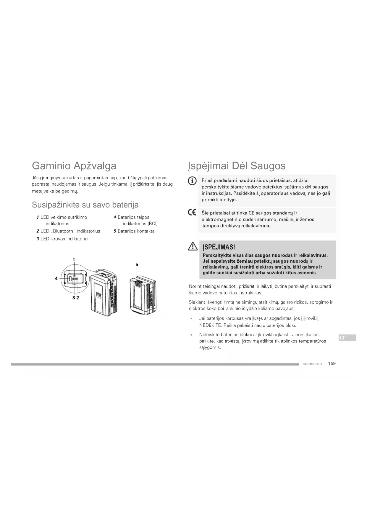 - Neleiskite baterijos blokui ar įkrovikliui įkaisti. Jiems įkaitus, palikite, kad atvėstų. Įkrovimą atlikite tik aplinkos temperatūros sąlygomis.160 cramer.eu
