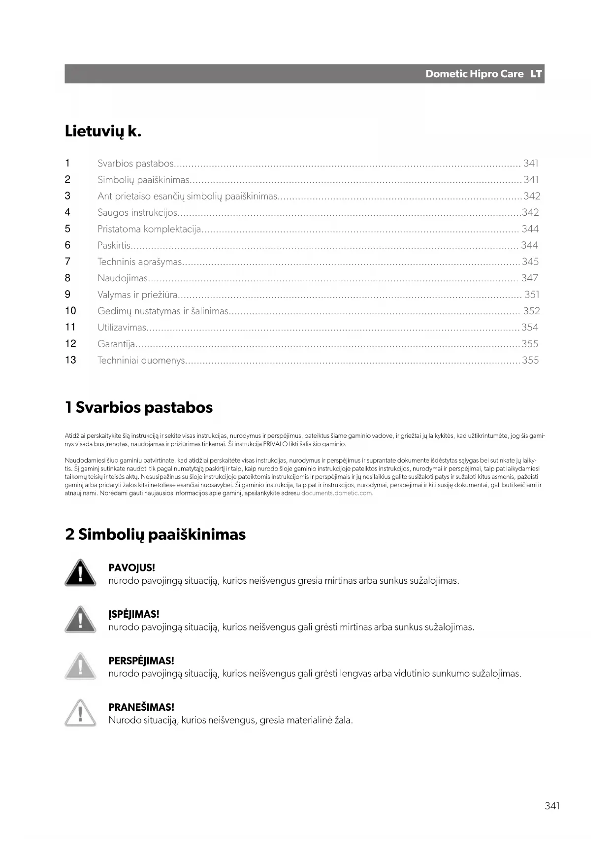 Techniniai duomenys...................................................................................................................355 1 Svarbios pastabos Atidžiai perskaitykite šią instrukciją ir sekite visas instrukcijas, nurodymus ir perspėjimus, pateiktus šiame gaminio vadove, ir griežtai jų laikykitės, kad užtikrintumėte, jog šis gami- nys visada bus įrengtas, naudojamas ir prižiūrimas tinkamai. Ši instrukcija PRIVALO likti šalia šio gaminio. Naudodamiesi šiuo gaminiu patvirtinate, kad atidžiai perskaitėte visas instrukcijas, nurodymus ir perspėjimus ir suprantate dokumente išdėstytas sąlygas bei sutinkate jų laiky- tis. Šį gaminį sutinkate naudoti tik pagal numatytąją paskirtį ir taip, kaip nurodo šioje gaminio instrukcijoje pateiktos instrukcijos, nurodymai ir perspėjimai, taip pat laikydamiesi taikomų teisių ir teisės aktų. Nesusipažinus su šioje instrukcijoje pateiktomis instrukcijomis ir perspėjimais ir jų nesilaikius galite susižaloti patys ir sužaloti kitus asmenis, pažeisti gaminį arba pridaryti žalos kitai netoliese esančiai nuosavybei. Ši gaminio instrukcija, taip pat ir instrukcijos, nurodymai, perspėjimai ir kiti susiję dokumentai, gali būti keičiami ir atnaujinami. Norėdami gauti naujausios informacijos apie gaminį, apsilankykite adresu documents.dometic.com. 2 Simbolių paaiškinimas PAVOJUS! nurodo pavojingą situaciją, kurios neišvengus gresia mirtinas arba sunkus sužalojimas. ĮSPĖJIMAS! nurodo pavojingą situaciją, kurios neišvengus gali grėsti mirtinas arba sunkus sužalojimas. PERSPĖJIMAS! nurodo pavojingą situaciją, kurios neišvengus gali grėsti lengvas arba vidutinio sunkumo sužalojimas. PRANEŠIMAS! Nurodo situaciją, kurios neišvengus, gresia materialinė žala. 341LTDometic Hipro Care PASTABA Papildoma informacija apie gaminio eksploatavimą. 3 Ant prietaiso esančių simbolių paaiškinimas Gaisro / degių medžiagų rizika 4 Saugos instrukcijos Bendroji sauga ĮSPĖJIMAS! Elektros srovės pavojus