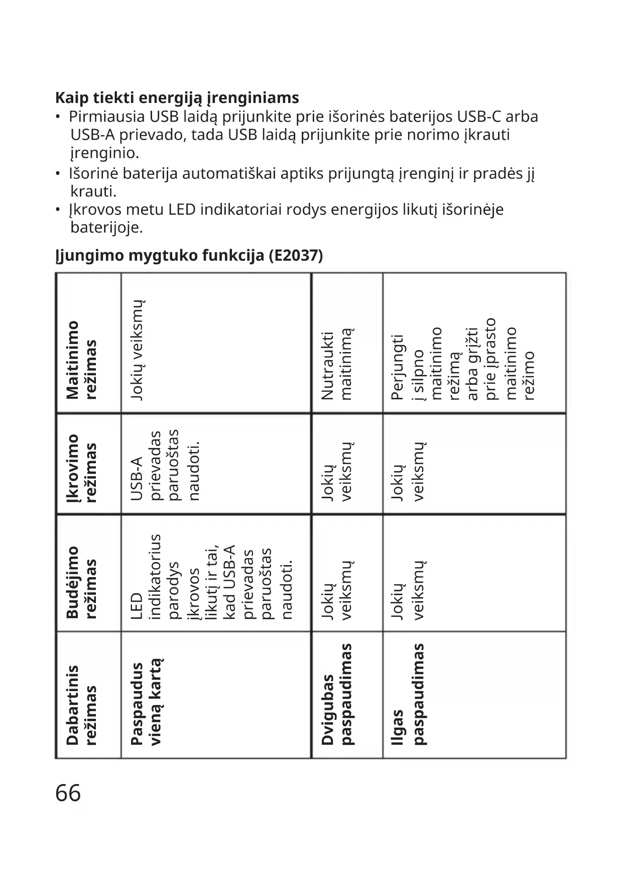 - Įkrovos metu LED indikatoriai rodys energijos likutį išorinėje baterijoje. Įjungimomygtukofunkcija(E2037) Maitinimo režimas Jokių veiksmų Nutraukti maitinimą Perjungti į silpno maitinimo režimą arba grįžti prie įprasto maitinimo režimo Įkrovimo režimas USB-A prievadas paruoštas naudoti. Jokių veiksmų Jokių veiksmų Budėjimo režimas LED indikatorius parodys įkrovos likutį ir tai, kad USB-A prievadas paruoštas naudoti. Jokių veiksmų Jokių veiksmų Dabartinis režimas Paspaudus vienąkartą Dvigubas paspaudimas Ilgas paspaudimas67 Įkrovoslikutis