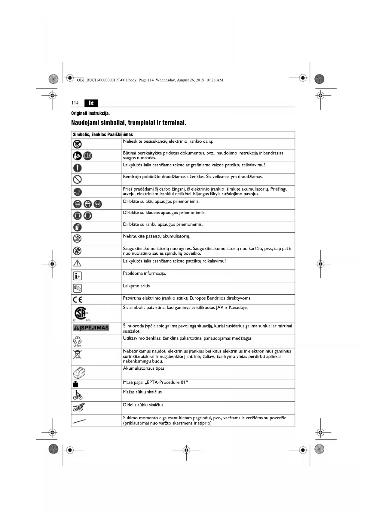 | [WK60] | Nebetinkamus naudoti elektrinius įrankius bei kitus elektrinius ir elektroninius gaminius surlinkite atskiral ir nugabenkite į antrinių žallavų tvarkymo vietas perdirbti aplinkai nekenksmingu būdu. |