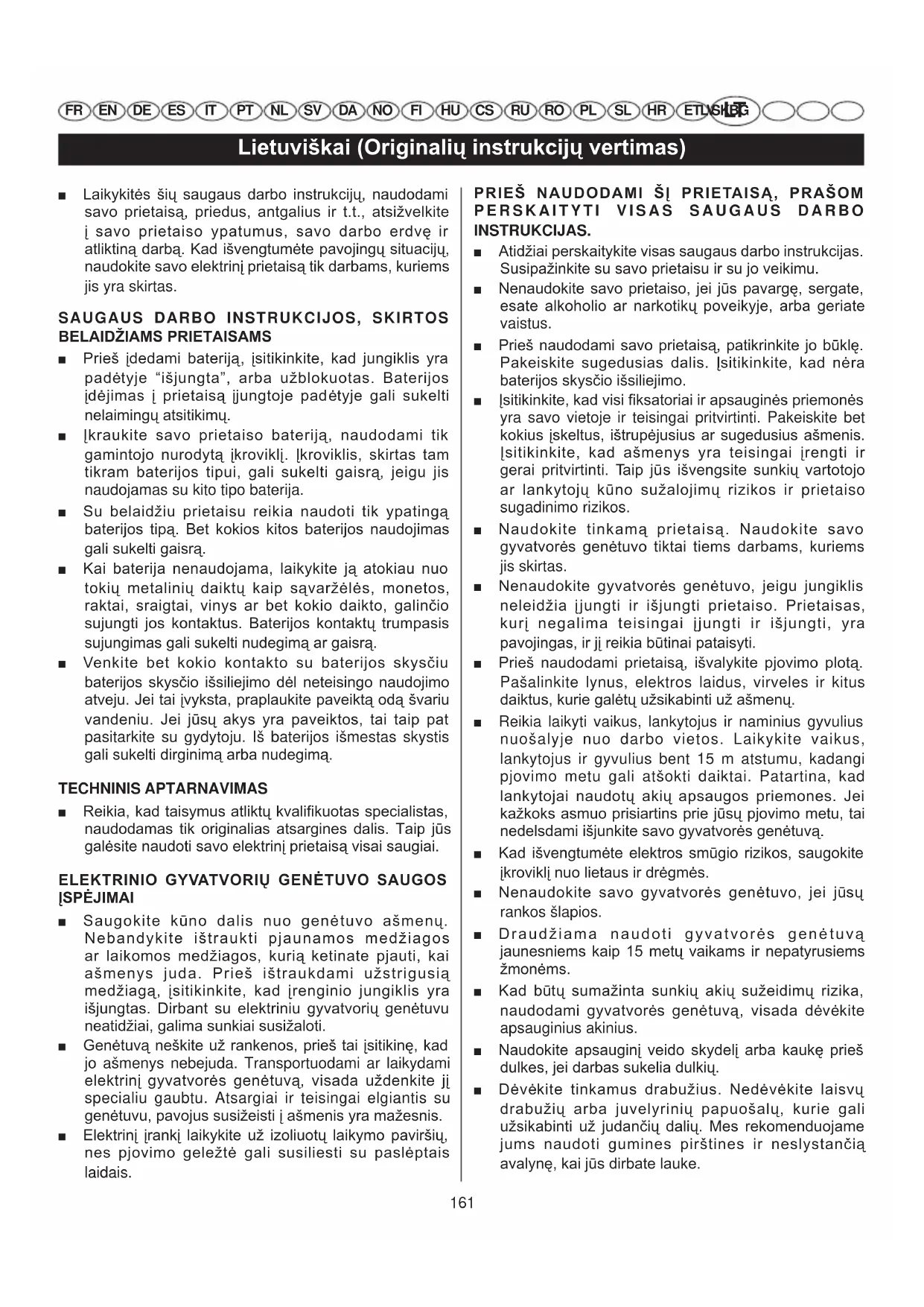INSTRUKCIJAS. ■ Atidžiai perskaitykite visas saugaus darbo instrukcijas. Susipažinkite su savo prietaisu ir su jo veikimu. ■ Nenaudokite savo prietaiso, jei jūs pavargę, sergate, esate alkoholio ar narkotikų poveikyje, arba geriate vaistus. ■ Prieš naudodami savo prietaisą, patikrinkite jo būklę. Pakeiskite sugedusias dalis. Įsitikinkite, kad nėra baterijos skysčio išsiliejimo. ■ Įsitikinkite, kad visi fiksatoriai ir apsauginės priemonės yra savo vietoje ir teisingai pritvirtinti. Pakeiskite bet kokius įskeltus, ištrupėjusius ar sugedusius ašmenis. Įsitikinkite, kad ašmenys yra teisingai įrengti ir gerai pritvirtinti. Taip jūs išvengsite sunkių vartotojo ar lankytojų kūno sužalojimų rizikos ir prietaiso sugadinimo rizikos. ■ Naudokite tinkamą prietaisą. Naudokite savo gyvatvorės genėtuvo tiktai tiems darbams, kuriems jis skirtas. ■ Nenaudokite gyvatvorės genėtuvo, jeigu jungiklis neleidžia įjungti ir išjungti prietaiso. Prietaisas, kurį negalima teisingai įjungti ir išjungti, yra pavojingas, ir jį reikia būtinai pataisyti. ■ Prieš naudodami prietaisą, išvalykite pjovimo plotą. Pašalinkite lynus, elektros laidus, virveles ir kitus daiktus, kurie galėtų užsikabinti už ašmenų. ■ Reikia laikyti vaikus, lankytojus ir naminius gyvulius nuošalyje nuo darbo vietos. Laikykite vaikus, lankytojus ir gyvulius bent 15 m atstumu, kadangi pjovimo metu gali atšokti daiktai. Patartina, kad lankytojai naudotų akių apsaugos priemones. Jei kažkoks asmuo prisiartins prie jūsų pjovimo metu, tai nedelsdami išjunkite savo gyvatvorės genėtuvą. ■ Kad išvengtumėte elektros smūgio rizikos, saugokite įkroviklį nuo lietaus ir drėgmės. ■ Nenaudokite savo gyvatvorės genėtuvo, jei jūsų rankos šlapios. ■ Draudžiama naudoti gyvatvorės genėtuvą jaunesniems kaip 15 metų vaikams ir nepatyrusiems žmonėms. ■ Kad būtų sumažinta sunkių akių sužeidimų rizika, naudodami gyvatvorės genėtuvą, visada dėvėkite apsauginius akinius. ■ Naudokite apsauginį veido skydelį arba kaukę prieš dulkes, jei darbas sukelia dulkių. ■ Dėvėkite tinkamus drabužius. Nedėvėkite laisvų drabužių arba juvelyrinių papuošalų, kurie gali užsikabinti už judančių dalių. Mes rekomenduojame jums naudoti gumines pirštines ir neslystančią avalynę, kai jūs dirbate lauke. 161Lietuviškai (Originalių instrukcijų vertimas) FR EN DE ES IT PT NL SV DA NO FI HU CS RU RO PL SL HR
