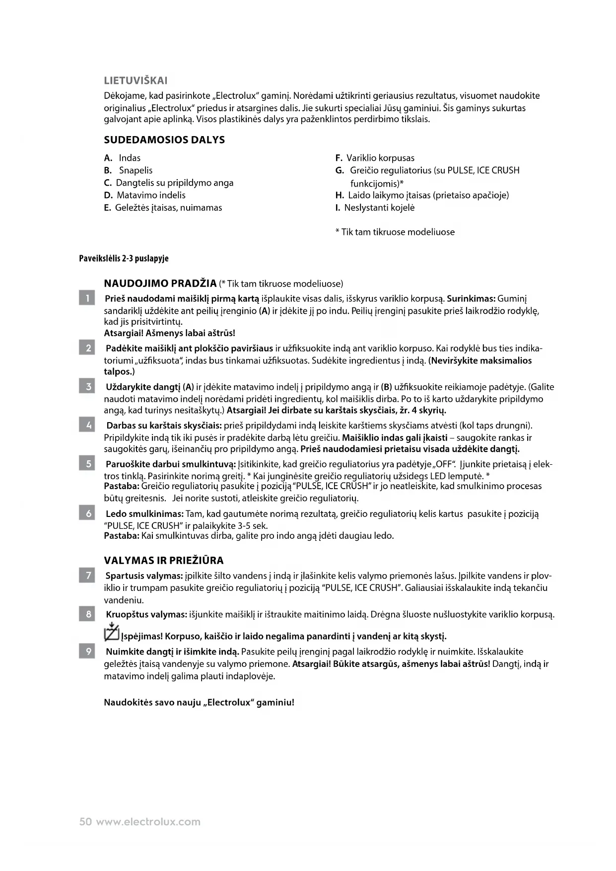7 Spartusis valymas: įpilkite šilto vandens į indą ir įlašinkite kelis valymo priemonės lašus. Įpilkite vandens ir plov- iklio ir trumpam pasukite greičio reguliatorių į poziciją “PULSE, ICE CRUSH”. Galiausiai išskalaukite indą tekančiu vandeniu. 8 Kruopštus valymas: išjunkite maišiklį ir ištraukite maitinimo laidą. Drėgna šluoste nušluostykite variklio korpusą. Įspėjimas! Korpuso, kaiščio ir laido negalima panardinti į vandenį ar kitą skystį. 9 Nuimkite dangtį ir išimkite indą. Pasukite peilų įrenginį pagal laikrodžio rodyklę ir nuimkite. Išskalaukite geležtės įtaisą vandenyje su valymo priemone. Atsargiai! Būkite atsargūs, ašmenys labai aštrūs! Dangtį, indą ir matavimo indelį galima plauti indaplovėje. Naudokitės savo nauju „Electrolux“ gaminiu!51www.electrolux.com
