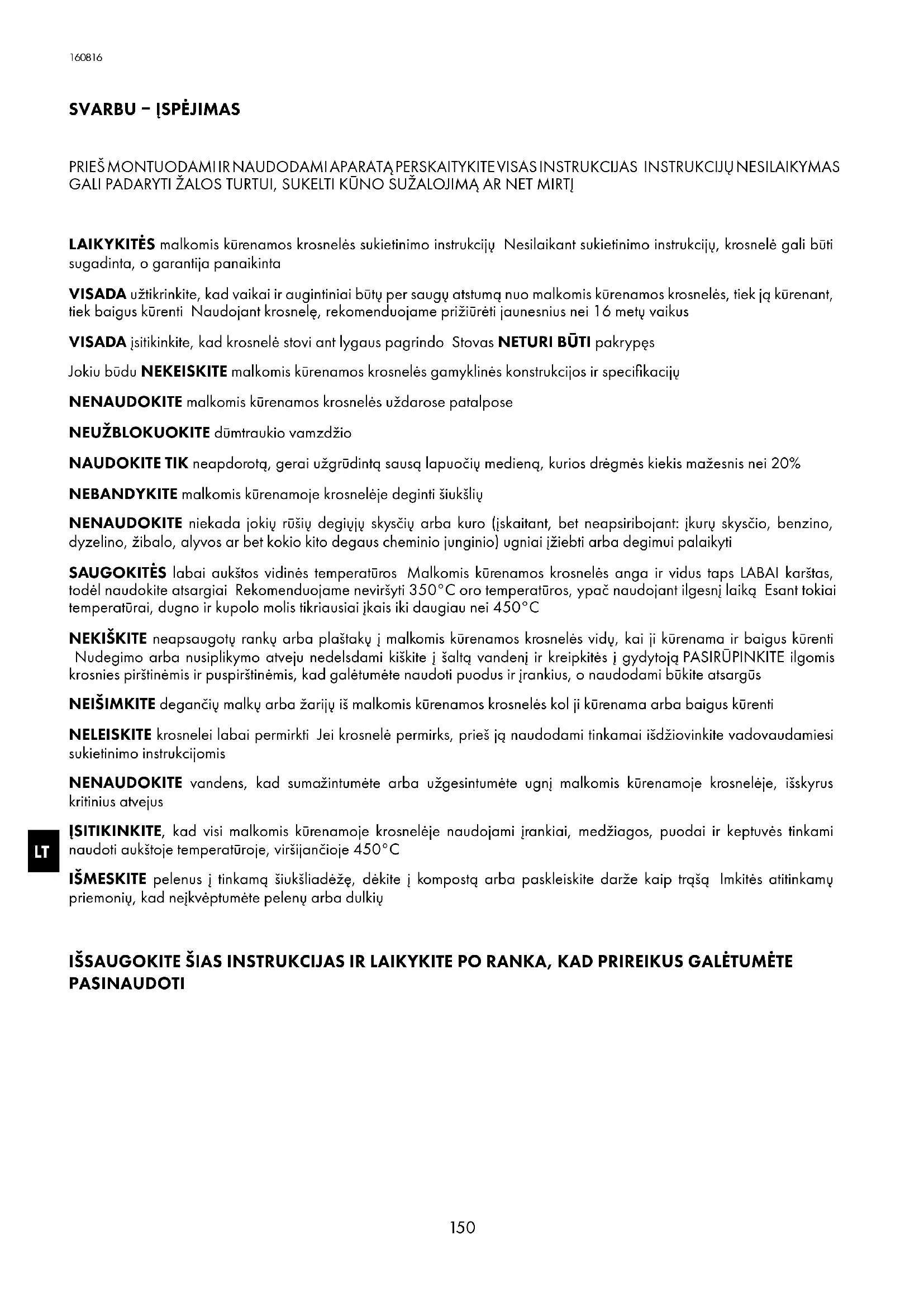 PRIEŠ MONTUODAMI IR NAUDODAMI APARATĄ PERSKAITYKITE VISAS INSTRUKCIJAS INSTRUKCIJŲ NESILAIKYMAS GALI PADARYTI ŽALOS TURTUI, SUKELTI KŪNO SUŽALOJIMĄ AR NET MIRTĮ LAIKYKITĖS malkomis kūrenamos krosnelės sukietinimo instrukcijų Nesilaikant sukietinimo instrukcijų, krosnelė gali būti sugadinta, o garantija panaikinta VISADA užtikrinkite, kad vaikai ir augintiniai būtų per saugų atstumą nuo malkomis kūrenamos krosnelės, tiek ją kūrenant, tiek baigus kūrenti Naudojant krosnelę, rekomenduojame prižiūrėti jaunesnius nei 16 metų vaikus VISADA įsitikinkite, kad krosnelė stovi ant lygaus pagrindo Stovas NETURI BŪTI pakrypęs Jokiu būdu NEKEISKITE malkomis kūrenamos krosnelės gamyklinės konstrukcijos ir specifikacijų NENAUDOKITE malkomis kūrenamos krosnelės uždarose patalpose NEUŽBLOKUOKITE dūmtraukio vamzdžio NAUDOKITE TIK neapdorotą, gerai užgrūdintą sausą lapuočių medieną, kurios drėgmės kiekis mažesnis nei 20% NEBANDYKITE malkomis kūrenamoje krosnelėje deginti šiukšlių NENAUDOKITE niekada jokių rūšių degiųjų skysčių arba kuro (įskaitant, bet neapsiribojant: įkurų skysčio, benzino, dyzelino, žibalo, alyvos ar bet kokio kito degaus cheminio junginio) ugniai įžiebti arba degimui palaikyti SAUGOKITĖS labai aukštos vidinės temperatūros Malkomis kūrenamos krosnelės anga ir vidus taps LABAI karštas, todėl naudokite atsargiai Rekomenduojame neviršyti 350°C oro temperatūros, ypač naudojant ilgesnį laiką Esant tokiai temperatūrai, dugno ir kupolo molis tikriausiai įkais iki daugiau nei 450°C NEKIŠKITE neapsaugotų rankų arba plaštakų į malkomis kūrenamos krosnelės vidų, kai ji kūrenama ir baigus kūrenti Nudegimo arba nusiplikymo atveju nedelsdami kiškite į šaltą vandenį ir kreipkitės į gydytojąPASIRŪPINKITE ilgomis krosnies pirštinėmis ir puspirštinėmis, kad galėtumėte naudoti puodus ir įrankius, o naudodami būkite atsargūs NEIŠIMKITE degančių malkų arba žarijų iš malkomis kūrenamos krosnelės kol ji kūrenama arba baigus kūrenti NELEISKITE krosnelei labai permirkti Jei krosnelė permirks, prieš ją naudodami tinkamai išdžiovinkite vadovaudamiesi sukietinimo instrukcijomis NENAUDOKITE vandens, kad sumažintumėte arba užgesintumėte ugnį malkomis kūrenamoje krosnelėje, išskyrus kritinius atvejus ĮSITIKINKITE, kad visi malkomis kūrenamoje krosnelėje naudojami įrankiai, medžiagos, puodai ir keptuvės tinkami naudoti aukštoje temperatūroje, viršijančioje 450°C IŠMESKITE pelenus į tinkamą šiukšliadėžę, dėkite į kompostą arba paskleiskite darže kaip trąšą Imkitės atitinkamų priemonių, kad neįkvėptumėte pelenų arba dulkių IŠSAUGOKITE ŠIAS INSTRUKCIJAS IR LAIKYKITE PO RANKA, KAD PRIREIKUS GALĖTUMĖTE PASINAUDOTI