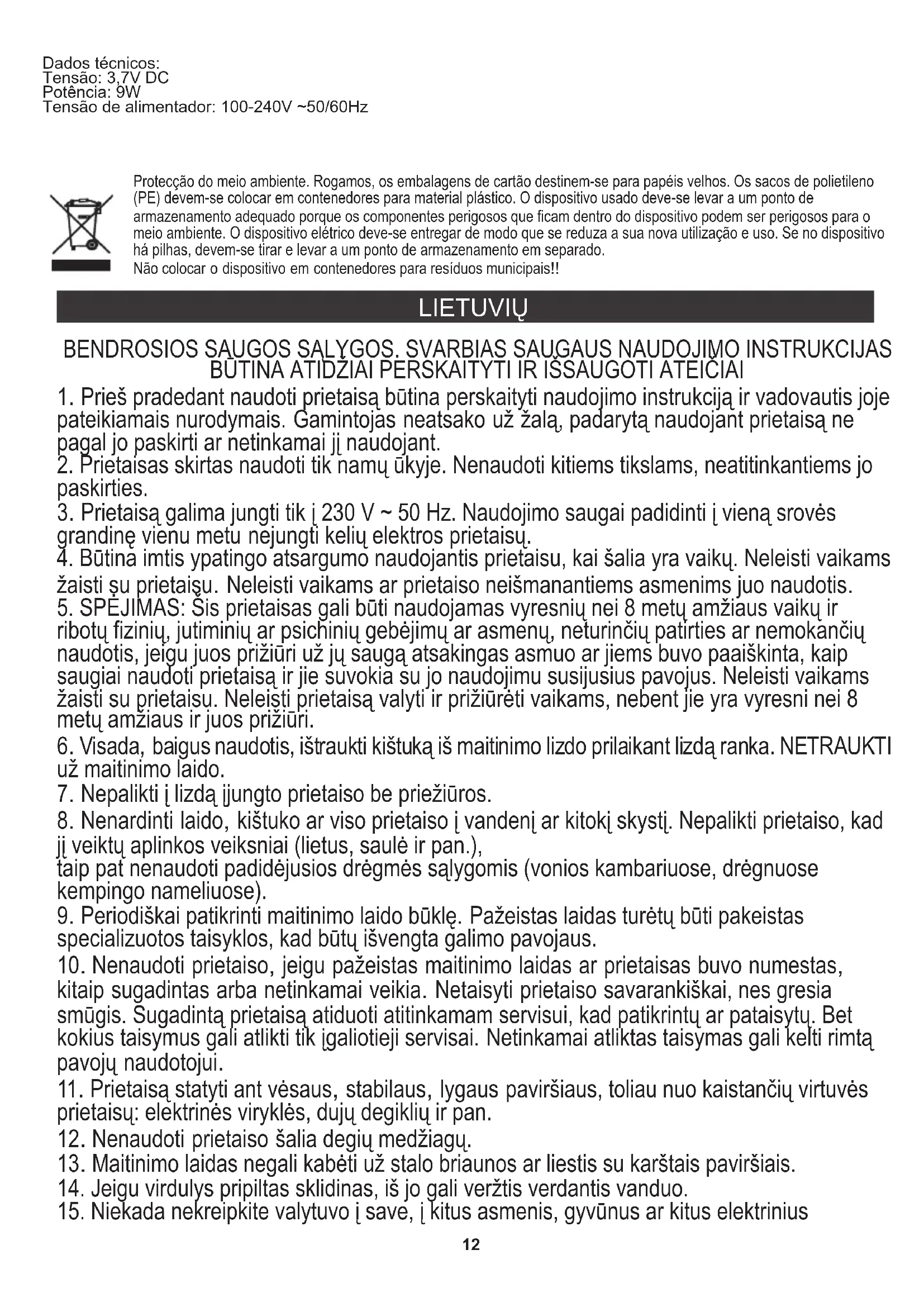 - Pries pradedant naudoti prietaisă butina perskaityti naudojimo instrukcijar ir vadovautis joje pateikiamais nurodymais. Gamintojas neatsako už Žalá, padaryta naudojant prietaisă ne pagal jo paskirti ar netinkamai jj naudojant.