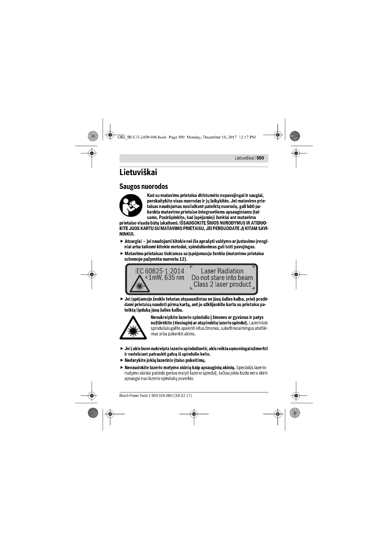 OBJ_BUCH-2450-006.book Page 521 Monday, December 18, 2017 12:17 PM522 | Lietuviškai 1 609 92A 48U | (18.12.17) Bosch Power Tools Norėdami pakeisti matavimo vienetus, paspauskite mygtuką 3 [+] arba mygtuką 8 [–]. Norėdami išeiti iš meniu punkto, paspauskite įjungimo-išjungimo mygtuką 5 []. Matavimo prietaisą išjungus, pasirinktas nustatymas išsaugomas. Bluetooth® sąsaja Duomenų perdavimas į kitus prietaisus Matavimo prietaisas yra su Bluetooth® moduliu, kuris radijo bangomis leidžia perduoti duomenis į tam tikrus mobiliuosius galinius prietaisus su Bluetooth® sąsaja (pvz., iš- maniuosius telefonus, planšetinius kompiuterius). Informaciją apie sistemai keliamas sąlygas Bluetooth® ryšiui sukurti rasite Bosch in- ternetiniame puslapyje www.bosch-pt.com Daugiau informacijos rasite Bosch gaminių puslapyje, žr. QR kodą, 8 psl. Perduodant duomenis per Bluetooth®, tarp galinio prietaiso ir matavimo prietaiso gali būti laiko uždelsa. Tai gali būti dėl atstumo tarp abiejų prietaisų arba dėl paties mata- vimo objekto. Bluetooth® sąsajos suaktyvinimas duomenų perdavimui į mobilųjį galinį prietaisą Norėdami suaktyvinti Bluetooth® sąsają, paspauskite matavimo prietaiso Bluetooth® mygtuką 6. Norėdami suaktyvinti Bluetooth® signalą, dar kartą paspauskite Blue- tooth® mygtuką 6 arba mygtuką 3 [+]. Įsitikinkite, kad yra suaktyvinta jūsų mobiliojo galinio prietaiso Bluetooth® sąsaja. Norint praplėsti mobiliojo galinio prietaiso funkcijas ir supaprastinti duomenų apdo- rojimą, galima naudotis specialiomis Bosch programėlėmis. Jas, priklausomai nuo ga- linio prietaiso, galima parsisiųsti į atminties įtaisus. Įjungus Bosch programėlę, sukuriamas ryšys tarp mobiliojo galinio prietaiso ir mata- vimo prietaiso. Jei surandami keli aktyvūs matavimo prietaisai, pagal serijos numerį išsirinkite tinkamą matavimo prietaisą. Ryšio būsena bei aktyvi jungtis (a) rodoma matavimo prietaiso būsenos eilutėje (h). Bluetooth® sąsajos deaktyvinimas Norėdami deaktyvinti Bluetooth® ryšį, paspauskite Bluetooth® mygtuką 6. Norėdami suaktyvinti Bluetooth® signalą, dar kartą paspauskite Bluetooth® mygtuką 6, mygtuką 8 [–] arba išjunkite matavimo prietaisą. Darbo patarimai Daugiau informacijos rasite Bosch gaminių puslapyje, žr. QR kodą, 8 psl. OBJ_BUCH-2450-006.book Page 522 Monday, December 18, 2017 12:17 PMLietuviškai | 523 Bosch Power Tools 1 609 92A 48U | (18.12.17) Matavimo prietaisas yra su radijo sąsaja. Būtina laikytis vietinių eksploatavi- mo apribojimų, pvz., lėktuvuose ar ligoninėse. Bendrosios nuorodos Priėmimo lęšio 14 ir lazerio spindulio išėjimo angos 15 matuojant negalima uždengti. Matavimo prietaiso matuojant judinti negalima. Todėl matavimo prietaisą priglauskite prie kaip galima tvirtesnės atramos ar atraminio paviršiaus. Įtaka matavimo diapazonui Matavimo diapazonas priklauso nuo apšvietimo sąlygų ir taikinio paviršiaus atspin- džio. Esant ryškiam pašalinės šviesos šaltiniui, kad geriau matytumėte lazerio spindu- lį, naudokite akinius lazerio matomumui pagerinti 18 (papildoma įranga) ir lazerio tai- kinio lentelę 17 (papildoma įranga), arba nusitaikymo plote sudarykite šešėlį. Įtaka matavimo rezultatams Dėl fizikinių veiksnių, matuojant įvairių paviršių plotus, matavimai gali būti klaidingi. Tai gali pasitaikyti, matuojant: – permatomus paviršius (pvz., stiklą, vandenį), – veidrodinius paviršius (pvz., poliruotą metalą, stiklą), – akytus paviršius (pvz., izoliacines medžiagas), –struktūrinius paviršius (pvz., struktūrinį tinką, natūralų akmenį). Jei reikia, matuodami šiuos paviršius naudokite lazerio nusitaikymo lentelę 17 (papil- doma įranga). Matavimo rezultatai gali būti klaidingi taip pat, jei kreivai nusitaikoma į nusitaikymo paviršių. Matavimo vertei įtakos taip pat gali padaryti skirtingų temperatūrų oro sluoksniai arba netiesiogiai sugauti atspindžiai. Posvyrio matavimo tikslumo tikrinimas ir kalibravimas (žr. pav. G) Reguliariai tikrinkite posvyrio matavimo tikslumą. Tai atliekama dviem matavimais. Tuo tikslus, matavimo prietaisą padėkite ant stalo ir išmatuokite posvyrį. Matavimo prietaisą pasukite 180 ° kampu ir dar kartą išmatuokite posvyrį. Parodytų verčių skir- tumas turi būti ne didesnis kaip 0,3 °. Esant didesniems nuokrypiams, matavimo prietaisą turite iš naujo sukalibruoti. Tuo tikslu pasirinkite . Sekite nurodymus ekrane. Po didelių temperatūros svyravimų ir smūgių rekomenduojame atlikti matavimo prie- taiso tikslumo patikrą ir, jei reikia, sukalibruoti. Pasikeitus temperatūrai, prieš atlie- kant kalibravimą reikia palaukti, kol susivienodins matavimo prietaiso ir aplinkos tem- peratūra. CAL OBJ_BUCH-2450-006.book Page 523 Monday, December 18, 2017 12:17 PM524 | Lietuviškai 1 609 92A 48U | (18.12.17) Bosch Power Tools Tikslumo tikrinimas atstumo matavimu Matavimo prietaiso tikslumą galite patikrinti kaip aprašyta toliau: – Pasirinkite nekintamą, maždaug nuo 3 iki 10 m ilgio matavimo atkarpą, kurios ilgis jums tiksliai žinomas (pvz., patalpos plotis, durų anga). Matavimą reikia atlikti ge- romis sąlygomis, t. y., matuojama atkarpa turi būti patalpos viduje, matavimo nu- sitaikymo paviršius lygus ir gerai atspindintis. – Išmatuokite šią atkarpą 10 kartų iš eilės. Matuojant geromis sąlygomis, visoje atkarpoje atskirų matavimų nuokrypis nuo vidu- tinės vertės turi būti ne didesnis kaip ±4 mm. Užregistruokite matavimo rezultatus protokole, kad ir vėliau galėtumėte palyginti tikslumą. Naudojimas su trikoju stovu (pap. įranga) Stovas ypač reikalingas matuojant dideliu atstumu. Matavimo prietaisą 1/4" sriegiu 13 prisukite prie stovo 19 greitojo keitimo plokštelės arba prie standartinio trikojo stovo. Tvirtai užveržkite greitojo keitimo plokštės fiksuojamuoju varžtu. Spausdami mygtuką 4 atitinkamai nustatykite bazinę matavimo plokštumą, ka