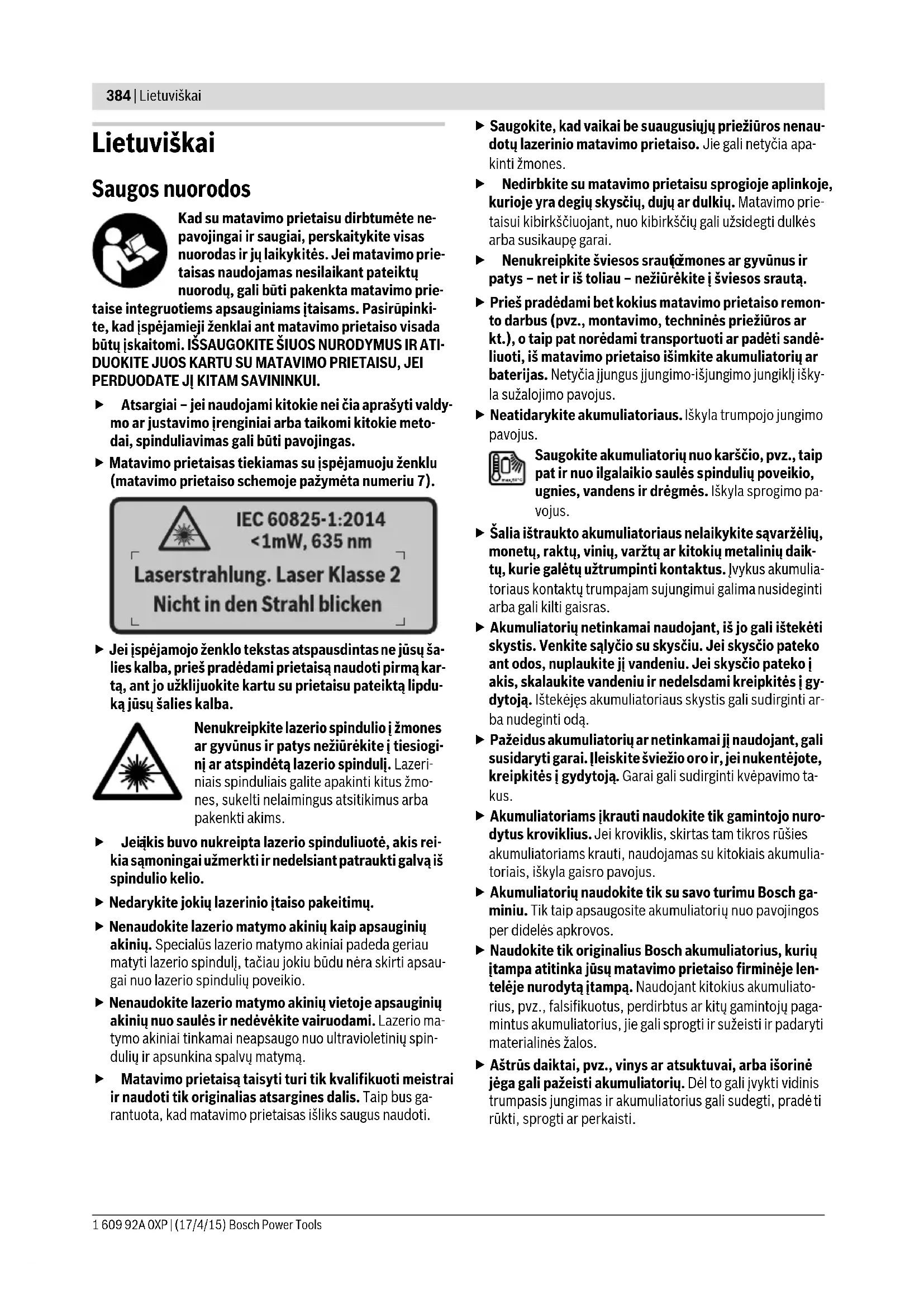 rinstrumenta korpusa iekšpusē. Izbīdiet bufera akumulatoru no tu- rētāja un utilizējiet apkārtējai vi- dei nekaitīgā veidā. Tiesības uz izmaiņām tiek saglabātas. OBJ_BUCH-2270-002.book Page 383 Friday, April 17, 2015 9:48 AM384 | Lietuviškai 1 609 92A 0XP | (17/4/15) Bosch Power Tools Lietuviškai Saugos nuorodos Kad su matavimo prietaisu dirbtumėte ne- pavojingai ir saugiai, perskaitykite visas nuorodas ir jų laikykitės. Jei matavimo prie- taisas naudojamas nesilaikant pateiktų nuorodų, gali būti pakenkta matavimo prie- taise integruotiems apsauginiams įtaisams. Pasirūpinki- te, kad įspėjamieji ženklai ant matavimo prietaiso visada būtų įskaitomi. IŠSAUGOKITE ŠIUOS NURODYMUS IR ATI- DUOKITE JUOS KARTU SU MATAVIMO PRIETAISU, JEI PERDUODATE JĮ KITAM SAVININKUI. Atsargiai – jei naudojami kitokie nei čia aprašyti valdy- mo ar justavimo įrenginiai arba taikomi kitokie meto- dai, spinduliavimas gali būti pavojingas. Matavimo prietaisas tiekiamas su įspėjamuoju ženklu (matavimo prietaiso schemoje pažymėta numeriu 7). Jei įspėjamojo ženklo tekstas atspausdintas ne jūsų ša- lies kalba, prieš pradėdami prietaisą naudoti pirmą kar- tą, ant jo užklijuokite kartu su prietaisu pateiktą lipdu- ką jūsų šalies kalba. Nenukreipkite lazerio spindulio į žmones ar gyvūnus ir patys nežiūrėkite į tiesiogi- nį ar atspindėtą lazerio spindulį. Lazeri- niais spinduliais galite apakinti kitus žmo- nes, sukelti nelaimingus atsitikimus arba pakenkti akims. Jei į akis buvo nukreipta lazerio spinduliuotė, akis rei- kia sąmoningai užmerkti ir nedelsiant patraukti galvą iš spindulio kelio. Nedarykite jokių lazerinio įtaiso pakeitimų. Nenaudokite lazerio matymo akinių kaip apsauginių akinių. Specialūs lazerio matymo akiniai padeda geriau matyti lazerio spindulį, tačiau jokiu būdu nėra skirti apsau- gai nuo lazerio spindulių poveikio. Nenaudokite lazerio matymo akinių vietoje apsauginių akinių nuo saulės ir nedėvėkite vairuodami. Lazerio ma- tymo akiniai tinkamai neapsaugo nuo ultravioletinių spin- dulių ir apsunkina spalvų matymą. Matavimo prietaisą taisyti turi tik kvalifikuoti meistrai ir naudoti tik originalias atsargines dalis. Taip bus ga- rantuota, kad matavimo prietaisas išliks saugus naudoti. Saugokite, kad vaikai be suaugusiųjų priežiūros nenau- dotų lazerinio matavimo prietaiso. Jie gali netyčia apa- kinti žmones. Nedirbkite su matavimo prietaisu sprogioje aplinkoje, kurioje yra degių skysčių, dujų ar dulkių. Matavimo prie- taisui kibirkščiuojant, nuo kibirkščių gali užsidegti dulkės arba susikaupę garai. Nenukreipkite šviesos srauto į žmones ar gyvūnus ir patys – net ir iš toliau – nežiūrėkite į šviesos srautą. Prieš pradėdami bet kokius matavimo prietaiso remon- to darbus (pvz., montavimo, techninės priežiūros ar kt.), o taip pat norėdami transportuoti ar padėti sandė- liuoti, iš matavimo prietaiso išimkite akumuliatorių ar baterijas. Netyčia įjungus įjungimo-išjungimo jungiklį išky- la sužalojimo pavojus. Neatidarykite akumuliatoriaus. Iškyla trumpojo jungimo pavojus. Saugokite akumuliatorių nuo karščio, pvz., taip pat ir nuo ilgalaikio saulės spindulių poveikio, ugnies, vandens ir drėgmės. Iškyla sprogimo pa- vojus. Šalia ištraukto akumuliatoriaus nelaikykite sąvaržėlių, monetų, raktų, vinių, varžtų ar kitokių metalinių daik- tų, kurie galėtų užtrumpinti kontaktus. Įvykus akumulia- toriaus kontaktų trumpajam sujungimui galima nusideginti arba gali kilti gaisras. Akumuliatorių netinkamai naudojant, iš jo gali ištekėti skystis. Venkite sąlyčio su skysčiu. Jei skysčio pateko ant odos, nuplaukite jį vandeniu. Jei skysčio pateko į akis, skalaukite vandeniu ir nedelsdami kreipkitės į gy- dytoją. Ištekėjęs akumuliatoriaus skystis gali sudirginti ar- ba nudeginti odą. Pažeidus akumuliatorių ar netinkamai jį naudojant, gali susidaryti garai. Įleiskite šviežio oro ir, jei nukentėjote, kreipkitės į gydytoją. Garai gali sudirginti kvėpavimo ta- kus. Akumuliatoriams įkrauti naudokite tik gamintojo nuro- dytus kroviklius. Jei kroviklis, skirtas tam tikros rūšies akumuliatoriams krauti, naudojamas su kitokiais akumulia- toriais, iškyla gaisro pavojus. Akumuliatorių naudokite tik su savo turimu Bosch ga- miniu. Tik taip apsaugosite akumuliatorių nuo pavojingos per didelės apkrovos. Naudokite tik originalius Bosch akumuliatorius, kurių įtampa atitinka jūsų matavimo prietaiso firminėje len- telėje nurodytą įtampą. Naudojant kitokius akumuliato- rius, pvz., falsifikuotus, perdirbtus ar kitų gamintojų paga- mintus akumuliatorius, jie gali sprogti ir sužeisti ir padaryti materialinės žalos. Aštrūs daiktai, pvz., vinys ar atsuktuvai, arba išorinė jėga gali pažeisti akumuliatorių. Dėl to gali įvykti vidinis trumpasis jungimas ir akumuliatorius gali sudegti, pradė