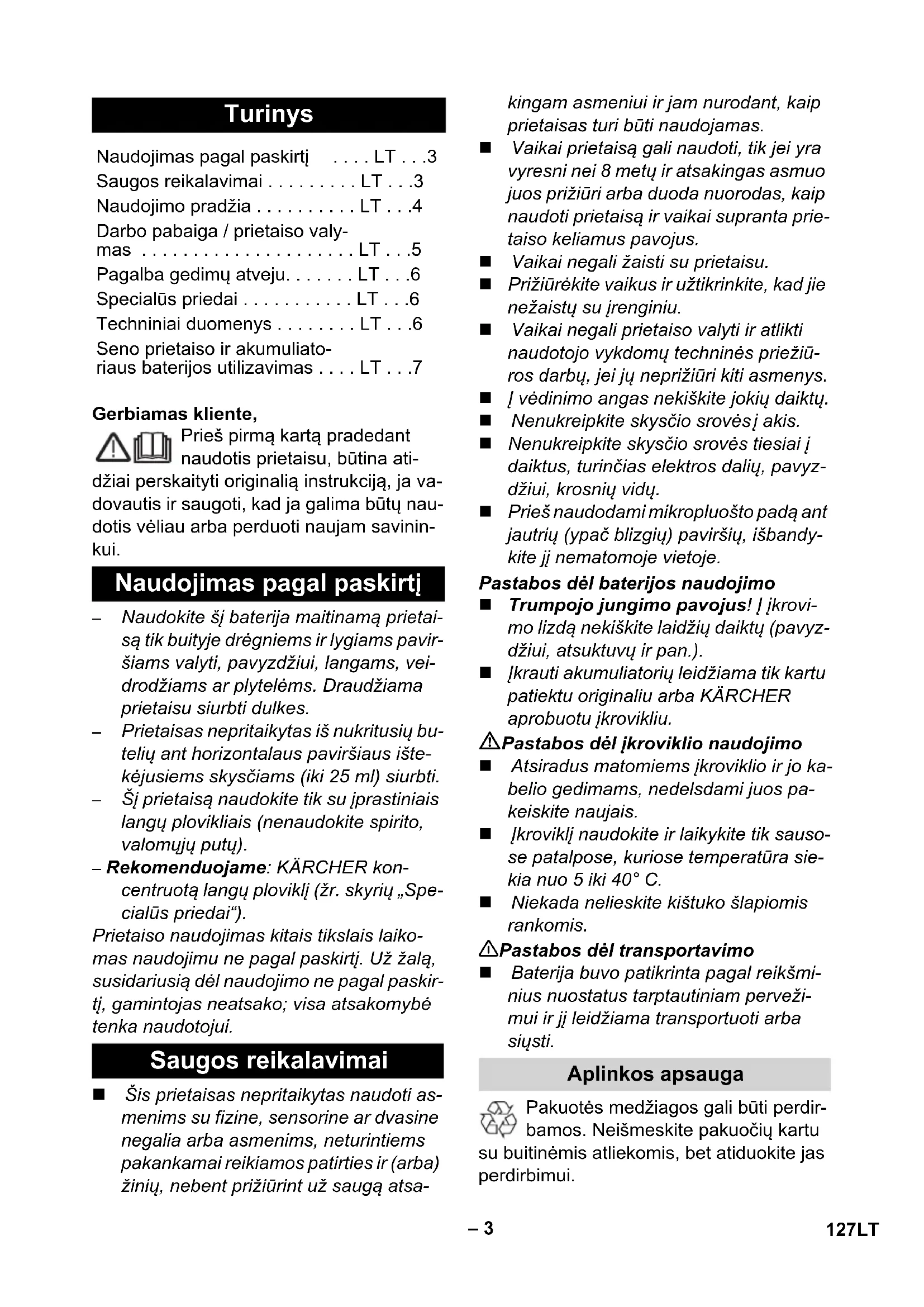 mesio: Pagrindinėje prietaiso dalyje yra elektros dalių, todėl neplaukite jos tekančio vandens srove! Nuimkite užteršto vandens baką ir pa- sukite bei ištraukite kamštį. Ištuštinkite baką ir išskalaukite jį vande- niu. Vėl užkimškite baką. Nuimkite nuo purkštuvo šluostę ir iš- plaukite po tekančiu vandeniu. Šluostę galite plauti ir skalbimo mašinoje iki 60 °C temperatūroje (nenaudokite minkštiklio). Prieš surinkdami išvalytą prietaisą, pa- laukite, kol jis išdžius. Akumuliatoriaus įkrovimas. Prietaisą laikykite pastatytą sausoje pa- talpoje. Darbo pradžia Valymas su purkštuvu ir plaunamuoju antgaliu Valymas be purkštuvo Darbo nutraukimas Talpyklos ištuštinimas dirbant Darbo pabaiga / prietaiso valymas Prietaiso laikymas 129LT– 6 Pripildykite valymo priemonių. Sugedusi purkštuvo pompa, kreipkitės į pardavėją. Patikrinkite įkrovos lygio / darbo režimo in- dikatorių: visai nežiba arba iš lėto mirkčioja: įkrau- kite bateriją. Jei mirksi dažnai: kreipkitės į pardavėją. Išvalykite nubrauktuvą. Apsukite susidėvėjusį nubrauktuvą: Silikoninį nubrauktuvą ištraukite į šoną. Silikoninį nubrauktuvą suapvalinimo zo- noje sudrėkinkite vandeniu arba plovi- kliu. Atvirkštine tvarka vėl įstumkite silikoninį nubrauktuvą į laikiklį. Jei reikia, pakeiskite nubrauktuvą: Jei po silikoninio nubrauktuvo apverti- mo yra susidėvėjusios abi briaunos, pa- keiskite jį nauju. Silikoninį nubrauktuvą pakeiskite, kaip aprašyta aukščiau. Patikrinkite valomosios priemonės do- zavimą. Ištuštinkite užteršto vandens baką (iki 100 ml). Koncentruotas langų ploviklis (4 x 20 ml) Užsakymo Nr. 6.295-302.0 Mikropluošto padas (2 Vnt.) Užsakymo Nr. 2.633-100.0 Nubrauktuvas, platus (2 vnt.) Užsakymo Nr. 2.633-005.0 Siauras nubrauktuvas (2 vnt.) Užsakymo Nr. 2.633-104.0 Gamintojas pasilieka teisę keisti techni- nius duomenis! Pagalba gedimų atveju Purkštuvas nepurškia Prietaisas neįsijungia Nuvalius lieka dryžiai Iš vėdinimo angų teka vanduo Specialūs priedai Techniniai duomenys Saugiklio rūšis IP X4 Užteršto vandens bako talpa 100 ml Darbo trukmė su visiškai įkrauta baterija 20 min Akumuliatoriaus nomina- lioji įtampa 3,6 V Prietaiso nominalioji galia 12 W Pilnai išsikrovusio aku- muliatoriaus įkrovimo lai- kas