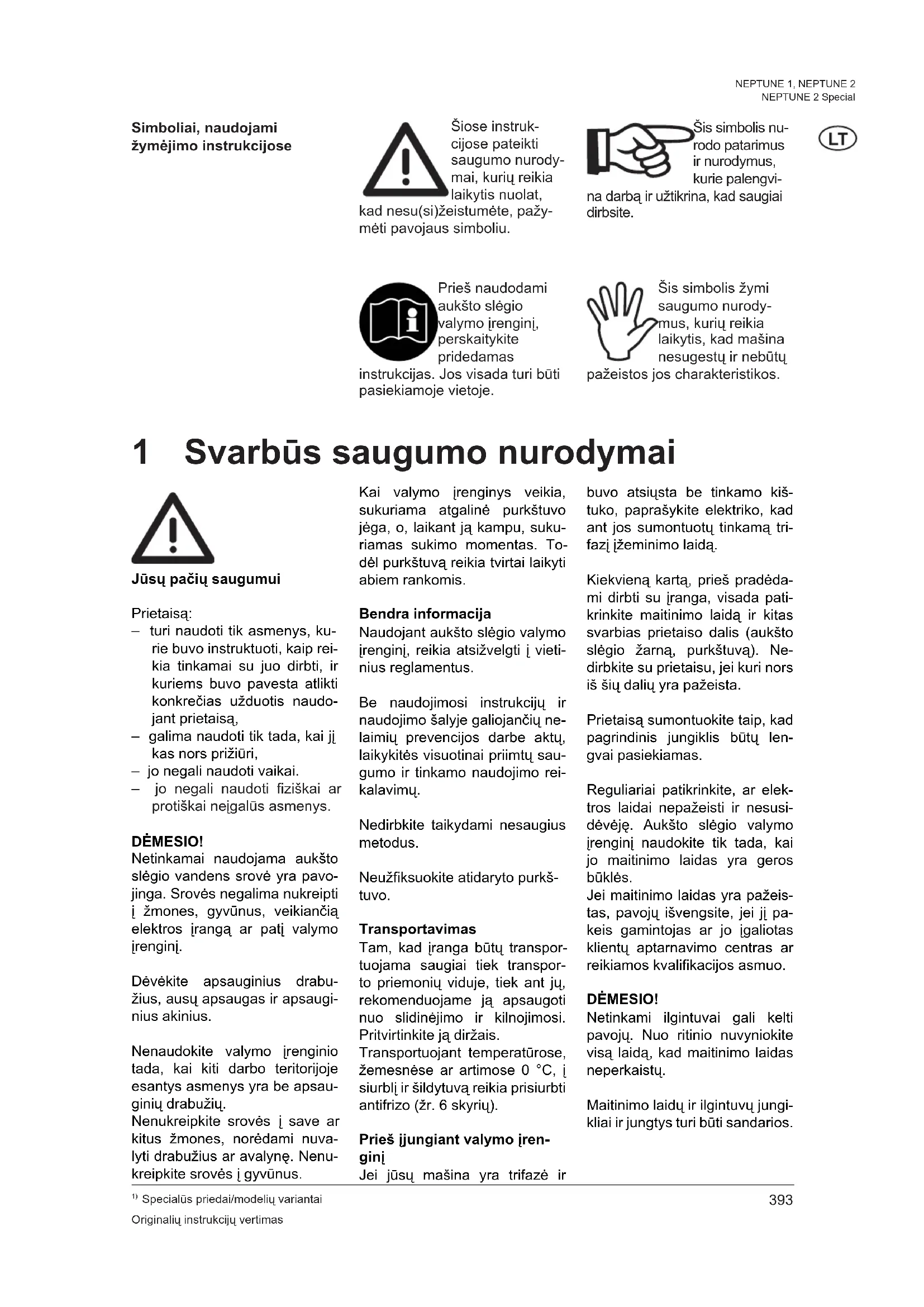 Specialūs priedai/modelių variantai Originalių instrukcijų vertimas NEPTUNE 1, NEPTUNE 2 NEPTUNE 2 Special 1 Svarbūs saugumo nurodymai Simboliai, naudojami žymėjimo instrukcijose Prieš naudodami aukšto slėgio valymo įrenginį, perskaitykite pridedamas instrukcijas. Jos visada turi būti pasiekiamoje vietoje. Jūsų pačių saugumui Prietaisą: – turi naudoti tik asmenys, ku- rie buvo instruktuoti, kaip rei- kia tinkamai su juo dirbti, ir kuriems buvo pavesta atlikti konkrečias užduotis naudo- jant prietaisą, – galima naudoti tik tada, kai jį kas nors prižiūri, – jo negali naudoti vaikai. – jo negali naudoti fiziškai ar protiškai neįgalūs asmenys. DĖMESIO! Netinkamai naudojama aukšto slėgio vandens srovė yra pavo- jinga. Srovės negalima nukreipti į žmones, gyvūnus, veikiančią elektros įrangą ar patį valymo įrenginį. Dėvėkite apsauginius drabu- žius, ausų apsaugas ir apsaugi- nius akinius. Nenaudokite valymo įrenginio tada, kai kiti darbo teritorijoje esantys asmenys yra be apsau- ginių drabužių. Nenukreipkite srovės į save ar kitus žmones, norėdami nuva- lyti drabužius ar avalynę. Nenu- kreipkite srovės į gyvūnus. Kai valymo įrenginys veikia, sukuriama atgalinė purkštuvo jėga, o, laikant ją kampu, suku- riamas sukimo momentas. To- dėl purkštuvą reikia tvirtai laikyti abiem rankomis. Bendra informacija Naudojant aukšto slėgio valymo įrenginį, reikia atsižvelgti į vieti- nius reglamentus. Be naudojimosi instrukcijų ir naudojimo šalyje galiojančių ne- laimių prevencijos darbe aktų, laikykitės visuotinai priimtų sau- gumo ir tinkamo naudojimo rei- kalavimų. Nedirbkite taikydami nesaugius metodus. Neužfiksuokite atidaryto purkš- tuvo. Transportavimas Tam, kad įranga būtų transpor- tuojama saugiai tiek transpor- to priemonių viduje, tiek ant jų, rekomenduojame ją apsaugoti nuo slidinėjimo ir kilnojimosi. Pritvirtinkite ją diržais. Transportuojant temperatūrose, žemesnėse ar artimose 0 °C, į siurblį ir šildytuvą reikia prisiurbti antifrizo (žr. 6 skyrių). Prieš įjungiant valymo įren- ginį Jei jūsų mašina yra trifazė ir buvo atsiųsta be tinkamo kiš- tuko, paprašykite elektriko, kad ant jos sumontuotų tinkamą tri- fazį įžeminimo laidą. Kiekvieną kartą, prieš pradėda- mi dirbti su įranga, visada pati- krinkite maitinimo laidą ir kitas svarbias prietaiso dalis (aukšto slėgio žarną, purkštuvą). Ne- dirbkite su prietaisu, jei kuri nors iš šių dalių yra pažeista. Prietaisą sumontuokite taip, kad pagrindinis jungiklis būtų len- gvai pasiekiamas. Reguliariai patikrinkite, ar elek- tros laidai nepažeisti ir nesusi- dėvėję. Aukšto slėgio valymo įrenginį naudokite tik tada, kai jo maitinimo laidas yra geros būklės. Jei maitinimo laidas yra pažeis- tas, pavojų išvengsite, jei jį pa- keis gamintojas ar jo įgaliotas klientų aptarnavimo centras ar reikiamos kvalifikacijos asmuo. DĖMESIO! Netinkami ilgintuvai gali kelti pavojų. Nuo ritinio nuvyniokite visą laidą, kad maitinimo laidas neperkaistų. Maitinimo laidų ir ilgintuvų jungi- kliai ir jungtys turi būti sandarios. Šiose instruk- cijose pateikti saugumo nurody- mai, kurių reikia laikytis nuolat, kad nesu(si)žeistumėte, pažy- mėti pavojaus simboliu. Šis simbolis žymi saugumo nurody- mus, kurių reikia laikytis, kad mašina nesugestų ir nebūtų pažeistos jos charakteristikos. Šis simbolis nu- rodo patarimus ir nurodymus, kurie palengvi- na darbą ir užtikrina, kad saugiai dirbsite.394