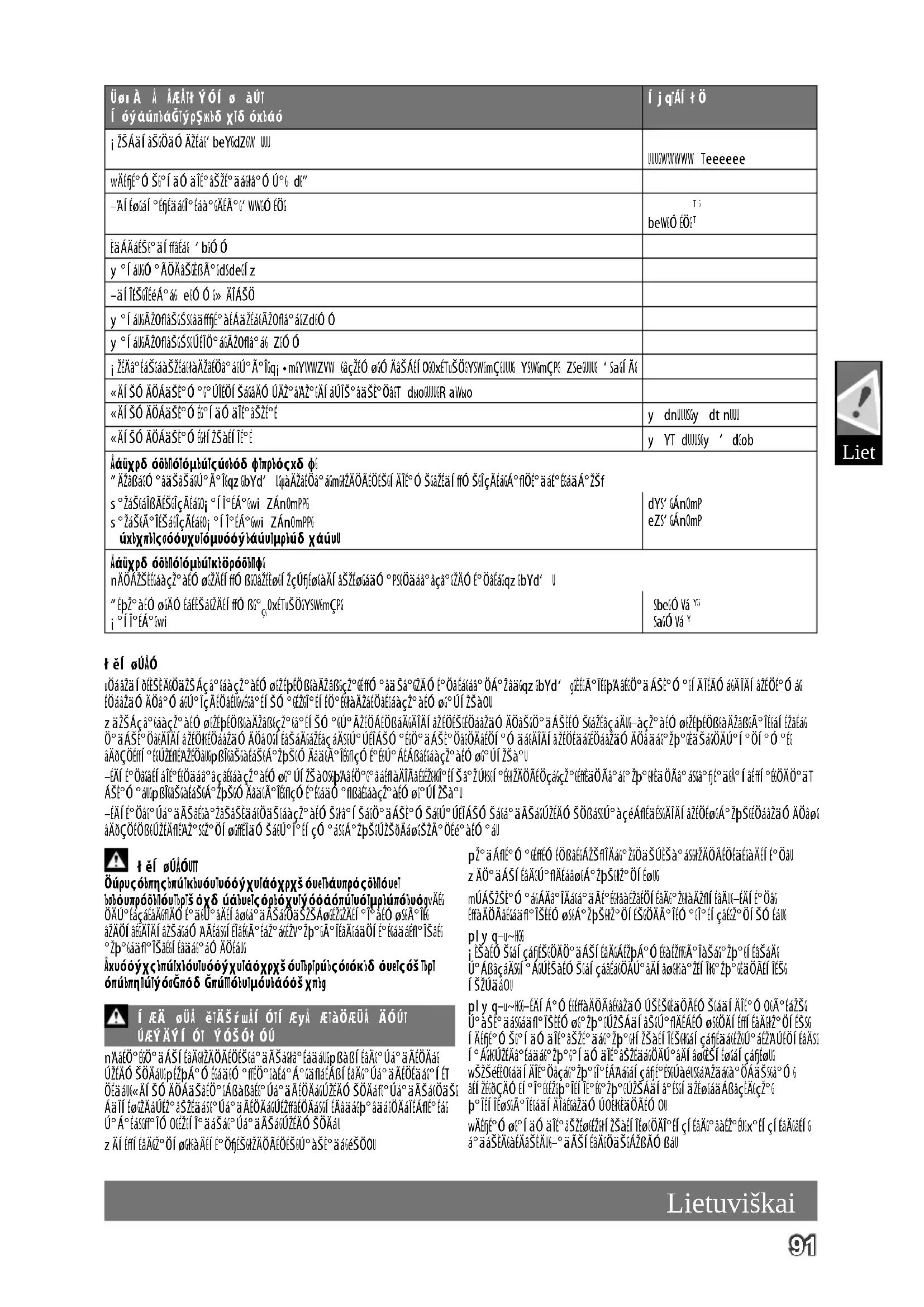 Techniniai duomenys, Ypatingos saugumo nuorodos, Naudojimas pagal paskirti, CE Atitikties pareiškimas, Elektros tinklo jungtis, Techninis aptarnavimas, Simboliai Prašome perskaityti ir neišmesti! Lietuviškai