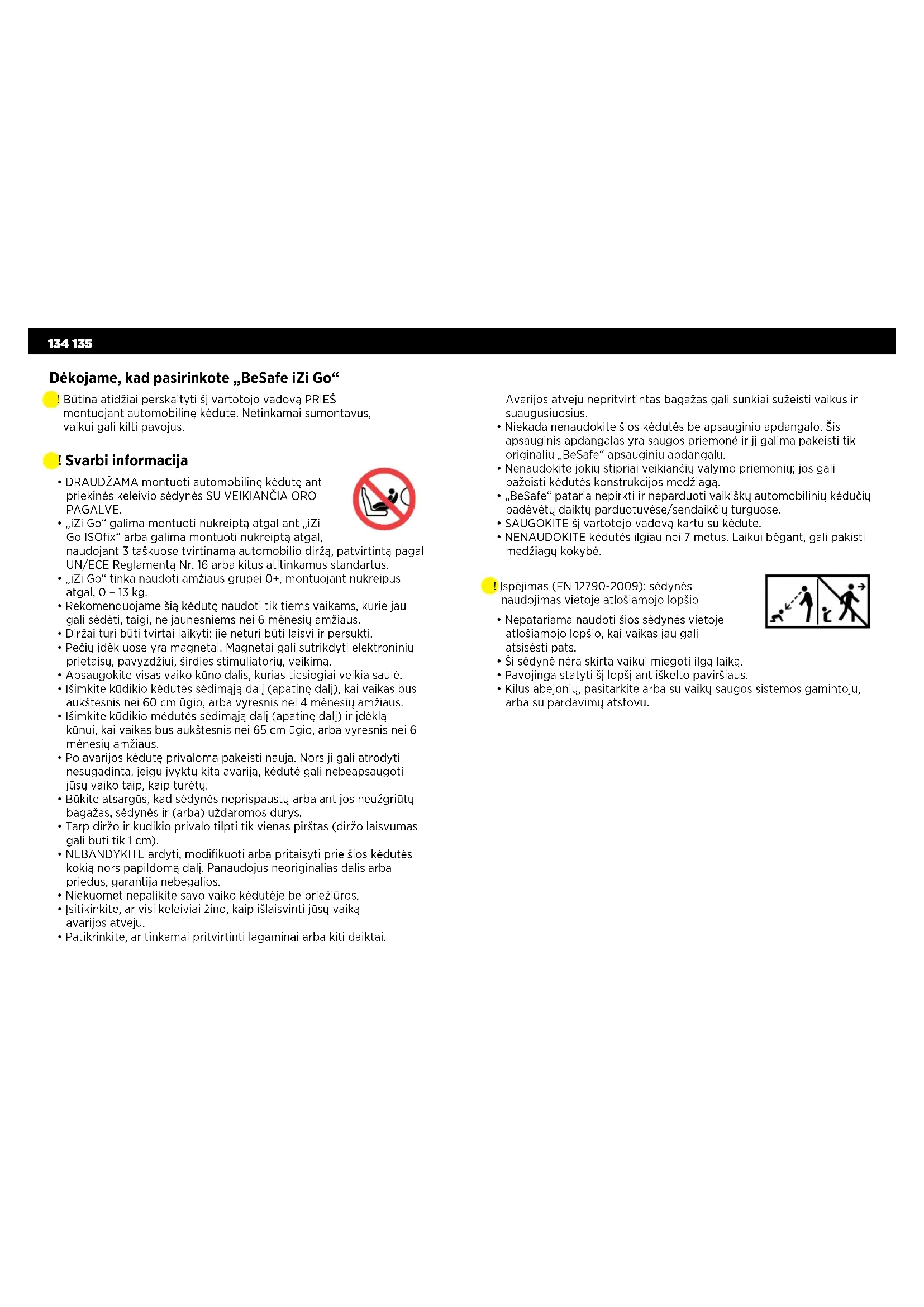 - Patikrinkite, ar tinkamai pritvirtinti lagaminai arba kiti daiktai. Dėkojame, kad pasirinkote „BeSafe iZi Go“ ! Būtina atidžiai perskaityti šį vartotojo vadovą PRIEŠ montuojant automobilinę kėdutę. Netinkamai sumontavus, vaikui gali kilti pavojus. ! Įspėjimas (EN 12790-2009): sėdynės naudojimas vietoje atlošiamojo lopšio Avarijos atveju nepritvirtintas bagažas gali sunkiai sužeisti vaikus ir suaugusiuosius.