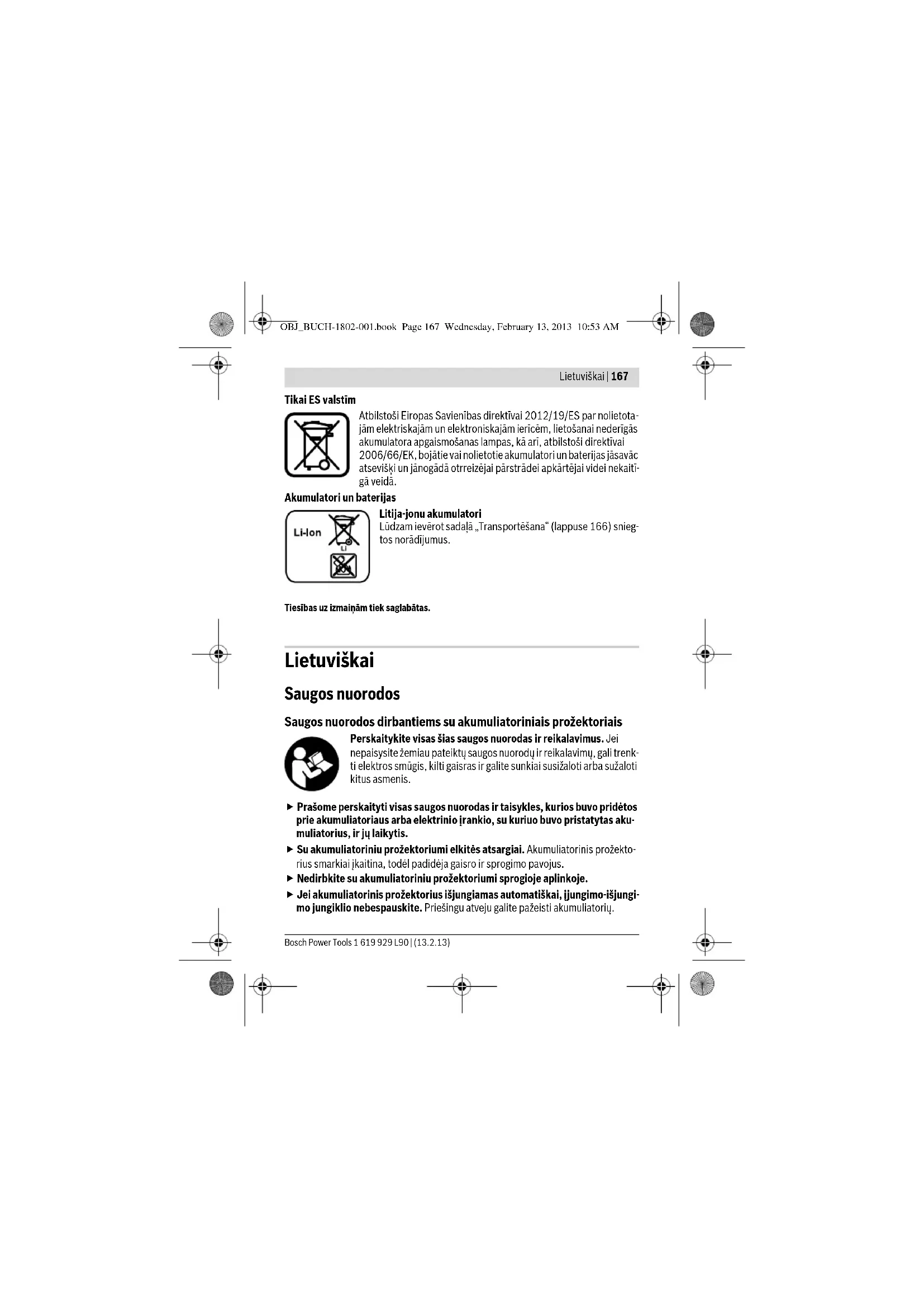 Norėdami akumuliatorinį prožektorių išjungti, įjungimo-išjungimo jungiklį 2 paspaus- kite dar kartą. Kad tausotumėte energiją, nenaudojamą akumuliatorinį prožektorių išjunkite. Priežiūra ir servisas Priežiūra ir valymas Jei akumuliatorius nebeveikia, prašome kreiptis į Bosch įgaliotą klientų aptarnavimo tarnybą. OBJ_BUCH-1802-001.book Page 170 Wednesday, February 13, 2013 10:53 AMLietuviškai | 171 Bosch Power Tools 1 619 929 L90 | (13.2.13) Akumuliatoriniam prožektoriui techninės priežiūros nereikia, jame nėra dalių, kurias reiktų keisti ar atlikti techninę priežiūrą. Akumuliatorinio prožektoriaus plastiko stiklą, kad jo nepažeistumėte, valykite sausu, minkštu skudurėliu. Nenaudokite valymo priemonių ir tirpiklių. Jei, nepaisant kruopščios gamybos ir patikrinimo, akumuliatorinis prožektorius su- gestų, jo remontas turi būti atliekamas įgaliotose Bosch elektrinių įrankių remonto dirbtuvėse. Ieškant informacijos ar užsakant atsargines dalis prašome būtinai nurodyti dešimt- ženklį gaminio numerį, esantį akumuliatorinio prožektoriaus firminėje lentelėje. Klientų aptarnavimo skyrius ir naudotojų konsultavimo tarnyba Klientų aptarnavimo skyriuje gausite atsakymus į klausimus, susijusius su jūsų gami- nio remontu, technine priežiūra bei atsarginėmis dalimis. Detalius brėžinius ir infor- maciją apie atsargines dalis rasite čia: www.bosch-pt.com Bosch naudotojų konsultavimo tarnybos specialistai mielai atsakys į klausimus apie mūsų gaminius ir papildomą įrangą. Lietuva Bosch įrankių servisas Informacijos tarnyba: (037) 713350 ļrankių remontas: (037) 713352 Faksas: (037) 713354 El. paštas: service-pt@lv.bosch.com Transportavimas Kartu pateikiamų ličio jonų akumuliatorių gabenimui taikomos pavojingų krovinių ga- benimą reglamentuojančių įstatymų nuostatos. Naudotojui akumuliatorius gabenti keliais leidžiama be jokių apribojimų. Jei siunčiant pasitelkiami tretieji asmenys (pvz., oro transportas, ekspedijavimo įmo- nė), būtina atsižvelgti į pakuotei ir ženklinimui taikomus ypatingus reikalavimus. Būti- na, kad rengiant siuntą dalyvautų pavojingų krovinių gabenimo specialistas. Siųskite tik tokius akumuliatorius, kurių nepažeistas korpusas. Apklijuokite kontaktus ir supakuokite akumuliatorių taip, kad jis pakuotėje nejudėtų. Taip pat laikykitės ir esamų papildomų nacionalinių taisyklių. OBJ_BUCH-1802-001.book Page 171 Wednesday, February 13, 2013 10:53 AM172 | Lietuviškai 1 619 929 L90 | (13.2.13) Bosch Power Tools Šalinimas Akumuliatoriniai prožektoriai, papildoma įranga ir pakuotės turi būti ekologiš- kai utilizuojami. Nemeskite akumuliatorinių prožektorių į buitinių atliekų konteinerius! Tik ES šalims: Pagal Europos direktyvą 2012/19/ES dėl elektros ir elektroninės įrangos atliekų, naudoti nebetinkami akumuliatoriniai prožektoriai ir, pagal Europos direktyvą 2006/66/EB, pažeisti ar išeikvoti aku- muliatoriai ir baterijos turi būti surenkami atskirai ir perdirbami aplinkai nekenksmingu būdu. Akumuliatoriai ir baterijos Ličio jonų: Prašome laikytis skyriuje „Transportavimas“, psl. 171 pateik- tų nuorodų. Galimi pakeitimai. OBJ_BUCH-1802-001.book Page 172 Wednesday, February 13, 2013 10:53 AM | 173 Bosch Power Tools 1 619 929 L90 | (13.2.13)