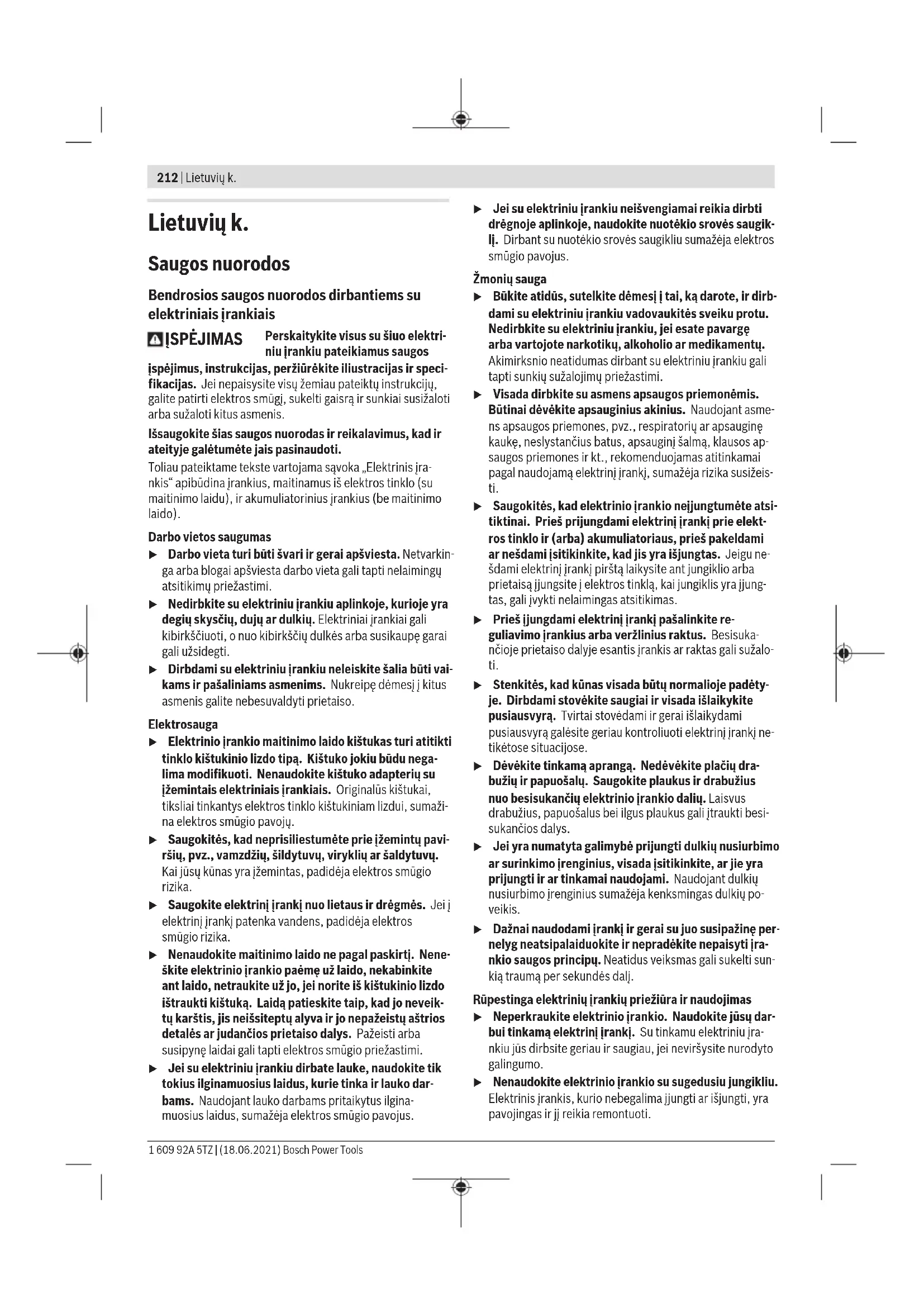 15,5 1,5 Šioje instrukcijoje pateiktas vibracijos lygis ir triukšmo emisi- ja buvo išmatuoti pagal standartizuotą matavimo metodą, ir juos galima naudoti elektriniams įrankiams palyginti. Jie taip pat skirti vibracijos ir triukšmo emisijai iš anksto įvertinti. Nurodytas vibracijos lygis ir triukšmo emisijos vertė atspindi pagrindinius elektrinio įrankio naudojimo atvejus. Tačiau jei- gu elektrinis įrankis naudojamas kitokiai paskirčiai, su kito- kiais darbo įrankiais arba jeigu jis nepakankamai techniškai prižiūrimas, vibracijos lygis ir triukšmo emisijos vertė gali ki- sti. Tokiu atveju vibracijos ir triukšmo emisija per visą darbo laikotarpį gali žymiai padidėti. Norint tiksliai įvertinti vibracijos ir triukšmo emisiją per tam tikrą darbo laiką, reikia atsižvelgti ir į laiką, per kurį elektrinis įrankis buvo išjungtas arba, nors ir veikė, bet nebuvo naudo- jamas. Tai įvertinus, vibracijos ir triukšmo emisija per visą darbo laiką žymiai sumažės. Dirbančiajam nuo vibracijos poveikio apsaugoti paskirkite papildomas apsaugos priemones, pvz.: elektrinių ir darbo įrankių techninę priežiūrą, rankų šildymą, darbo eigos orga- nizavimą. Montavimas u Prieš atliekant bet kokius elektrinio įrankio priežiūros darbus (atliekant techninę priežiūrą ar keičiant įrankį ir t. t.), o taip pat elektrinį įrankį transportuojant ir sandėliuojant, būtina iš jo išimti akumuliatorių. Priešingu atveju galite susižeisti, netyčia nuspaudę įjun- gimo-išjungimo jungiklį. Bosch Power Tools 1 609 92A 5TZ | (18.06.2021)216 | Lietuvių k. Akumuliatoriaus įkrovimas u Naudokite tik techninių duomenų skyriuje nurodytus kroviklius. Tik šie krovikliai yra priderinti prie Jūsų elekt- riniame įrankyje naudojamo ličio jonų akumuliatoriaus. Nuoroda: akumuliatorius pristatomas iš dalies įkrautas. Kad akumuliatorius veiktų visa galia, prieš pirmąjį naudojimą aku- muliatorių kroviklyje visiškai įkraukite. Ličio jonų akumuliatorių galima įkrauti bet kada, eksploatavi- mo trukmė dėl to nesutrumpėja. Krovimo proceso nutrauki- mas akumuliatoriui nekenkia. Celių apsaugos sistema „Electronic Cell Protection (ECP)“ saugo ličio jonų akumuliatorių nuo visiškos iškrovos. Kai aku- muliatorius išsikrauna, apsauginis išjungiklis išjungia elektri- nį įrankį, ir darbo įrankis nebesisuka. u Jeigu elektrinis įrankis išsijungė automatiškai, neban- dykite vėl spausti įjungimo-išjungimo jungiklio. Taip galite sugadinti ličio jonų akumuliatorių. Akumuliatoriaus išėmimas Akumuliatoriuje (12) yra dvi fiksavimo pakopos, kurios sau- go, kad netikėtai paspaudus akumuliatoriaus fiksavimo kla- višą (13), akumuliatorius neiškristų. Į elektrinį prietaisą įstatytą akumuliatorių tinkamoje padėtyje palaiko spyruoklė. Norėdami išimti akumuliatorių(12), paspauskite atblokavi- mo klavišą(13)ir išimkite akumuliatorių iš elektrinio įrankio. Traukdami nenaudokite jėgos. Akumuliatoriaus įkrovos būklės indikatorius Žali akumuliatoriaus įkrovos būklės indikatoriairodo akumu- liatoriausįkrovos būklę. Dėl saugumo, įkrovos būklę galima pažiūrėti tik tada, kai elektrinis įrankis neveikia. Jei norite, kad būtų parodyta įkrovos būklė, paspauskite įkrovos būklės mygtuką arba . Tai galima ir tada, kai akumuliatorius yra išimtas. Jei paspaudus mygtuką nešviečia nei vienas šviesadiodis in- dikatorius, vadinasi akumuliatorius yra pažeistas ir jį reikia pakeisti. Akumuliatoriaus tipas GBA 18V... LEDs Talpa Šviečia nuolat 3× žalias 60−100% Šviečia nuolat 2× žalias 30−60% Šviečia nuolat 1× žalias 5−30% Mirksi 1× žalias 0−5% Akumuliatoriaus tipas ProCORE18V... LEDs Talpa Šviečia nuolat 5× žalias 80−100% Šviečia nuolat 4× žalias 60−80% LEDs Talpa Šviečia nuolat 3× žalias 40−60 % Šviečia nuolat 2× žalias 20−40 % Šviečia nuolat 1× žalias 5−20 % Mirksi 1× žalias 0−5 % Pagalbinė rankena u Elektrinį įrankį naudokite tik su papildoma rankena (4). u Prieš pradėdami bet kokį darbą įsitikinkite, kad tvirtai užveržta papildoma rankena. Nesuvaldžius elektrinio įrankio, galima susižeisti. Atkreipkite dėmesį į tai, kad pa- pildoma rankena būtų užveržta tvirtinimo metodui skirtu sukimo momentu; papildomą rankeną ją prie elektrinio įrankio tvirtinkite taip, kad ji negalėtų judėti nei apie gręži- mo ašį, nei išilgai jos. Papildomos rankenos montavimas Norėdami papildomą rankeną atverti, sukite papildomos rankenos(4) apatinę dalį prieš laikrodžio rodyklę. Papildomos rankenos(5) intarpą patraukite atgal ir laikykite toje padėtyje. Norėdami papildomą rankeną pritvirtinti prie elektrinio įra- nkio, perkiškite ją per griebtuvą. Tada atleiskite intarpą(5). Vėl užveržkite papildomos rankenos(4)apatinę dalį, sukda- mi ją pagal laikrodžio rodyklę. Papildomos rankenos pasukimas Papildomą rankeną(4)galite pasukti taip, kad darbo padėtis būtų kuo saugesnė ir mažiausia varginanti. Papildomos rankenos(4) apatinę dalį pasukite prieš laik- rodžio rodyklę ir nustatykite papildomą rankeną(4) į norimą padėtį. Vėl užveržkite papildomos rankenos(4)apatinę dalį, sukdami ją pagal laikrodžio rodyklę. Gręžimo gylio nustatymas Gylio ribotuvu(3) galima nustatyti pageidaujamą gręžimo gylįX. Atsukite gylio ribotuvo nustatymo sparnuotąjį varžtą(6) ir į papildomą rankeną(4) įstatykite gylio ribotuvą. Ištraukite gylio ribotuvą(3) tiek, kad atstumas tarp grąžto vi- ršūnės ir gylio ribotuvo galo(3) būtų lygus norimam gręžimo gyliuiX. Vėl tvirtai užveržkite gylio ribotuvo nustatymo sparnuotąjį varžtą(6). Įrankio keitimas (žr. Apav.) u Prieš atliekant bet kokius elektrinio įrankio priežiūros darbus (atliekant techninę priežiūrą ar keičiant įrankį ir t. t.), o taip pat elektrinį įrankį transportuojant ir sandėliuojant, būtina iš jo išimti akumuliatorių. Prieš