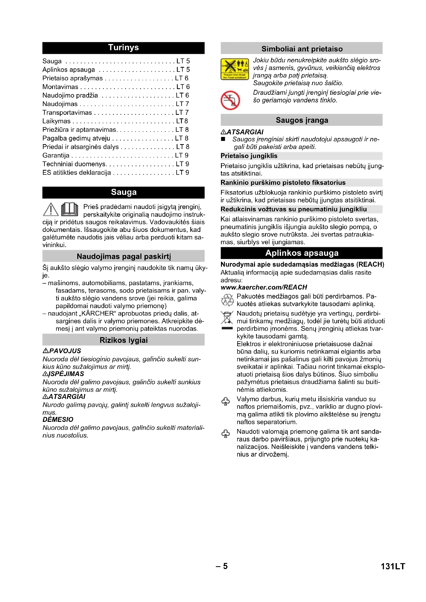 90 dB(A) Paturam tiesības veikt tehniskas izmaiņas. ES Atbilstības deklarācija Produkts: Augstspiediena tīrīšanas aparāts Tips: 1.676-xxx Attiecīgās ES direktīvas: 2000/14/EK 2014/30/ES 2006/42/EK (+2009/127/EK) 2011/65/ES Piemērotās harmonizētās normas: EN 50581 EN 55014–1: 2006+A1: 2009+A2: 2011 EN 55014–2: 2015 EN 60335–1 EN 60335–2–79 EN 61000–3–2: 2014 EN 61000–3–3: 2013 EN 62233: 2008 Atbilstibas novertešanas procedura: 2000/14/EK: V pielikums Skanas intensitates līmenis dB(A) Izmērītais: 88 Garantētais: 90 Winnenden, 2016/04/01 CEO Head of Approbation 130 LV– 5 Prieš pradėdami naudoti įsigytą įrenginį, perskaitykite originalią naudojimo instruk- ciją ir pridėtus saugos reikalavimus. Vadovaukitės šiais dokumentais. Išsaugokite abu šiuos dokumentus, kad galėtumėte naudotis jais vėliau arba perduoti kitam sa- vininkui. Šį aukšto slėgio valymo įrenginį naudokite tik namų ūky- je. – mašinoms, automobiliams, pastatams, įrankiams, fasadams, terasoms, sodo prietaisams ir pan. valy- ti aukšto slėgio vandens srove (jei reikia, galima papildomai naudoti valymo priemonę) – naudojant „KÄRCHER“ aprobuotas priedų dalis, at- sargines dalis ir valymo priemones. Atkreipkite dė- mesį į ant valymo priemonių pateiktas nuorodas. PAVOJUS Nuoroda dėl tiesioginio pavojaus, galinčio sukelti sun- kius kūno sužalojimus ar mirtį. 몇 ĮSPĖJIMAS Nuoroda dėl galimo pavojaus, galinčio sukelti sunkius kūno sužalojimus ar mirtį. 몇 ATSARGIAI Nurodo galimą pavojų, galintį sukelti lengvus sužaloji- mus. DĖMESIO Nuoroda dėl galimo pavojaus, galinčio sukelti materiali- nius nuostolius. 몇 ATSARGIAI Saugos įrenginiai skirti naudotojui apsaugoti ir ne- gali būti pakeisti arba apeiti. Prietaiso jungiklis užtikrina, kad prietaisas nebūtų įjung- tas atsitiktinai. Fiksatorius užblokuoja rankinio purškimo pistoleto svirtį ir užtikrina, kad prietaisas nebūtų įjungtas atsitiktinai. Kai atlaisvinamas rankinio purškimo pistoleto svertas, pneumatinis jungiklis išjungia aukšto slegio pompą, o aukšto slegio srove nutrūksta. Jei svertas patraukia- mas, siurblys vel ijungiamas. Nurodymai apie sudedamąsias medžiagas (REACH) Aktualią informaciją apie sudedamąsias dalis rasite adresu: www.kaercher.com/REACH Turinys Sauga . . . . . . . . . . . . . . . . . . . . . . . . . . . . . . LT 5 Aplinkos apsauga . . . . . . . . . . . . . . . . . . . . . LT 5 Prietaiso aprašymas . . . . . . . . . . . . . . . . . . . LT 6 Montavimas . . . . . . . . . . . . . . . . . . . . . . . . . . LT 6 Naudojimo pradžia . . . . . . . . . . . . . . . . . . . . LT 6 Naudojimas . . . . . . . . . . . . . . . . . . . . . . . . . . LT 7 Transportavimas . . . . . . . . . . . . . . . . . . . . . . LT 7 Laikymas . . . . . . . . . . . . . . . . . . . . . . . . . . . . LT 8 Priežiūra ir aptarnavimas. . . . . . . . . . . . . . . . LT 8 Pagalba gedimų atveju . . . . . . . . . . . . . . . . . LT 8 Priedai ir atsarginės dalys . . . . . . . . . . . . . . . LT 8 Garantija . . . . . . . . . . . . . . . . . . . . . . . . . . . . LT 9 Techniniai duomenys. . . . . . . . . . . . . . . . . . . LT 9 ES atitikties deklaracija . . . . . . . . . . . . . . . . . LT 9 Sauga Naudojimas pagal paskirtį Rizikos lygiai Simboliai ant prietaiso Jokiu būdu nenukreipkite aukšto slėgio sro- vės į asmenis, gyvūnus, veikiančią elektros įrangą arba patį prietaisą. Saugokite prietaisą nuo šalčio. Draudžiami jungti įrenginį tiesiogiai prie vie- šo geriamojo vandens tinklo. Saugos įranga Prietaiso jungiklis Rankinio purškimo pistoleto fiksatorius Redukcinis vožtuvas su pneumatiniu jungikliu Aplinkos apsauga Pakuotės medžiagos gali būti perdirbamos. Pa- kuotės atliekas sutvarkykite tausodami aplinką. Naudotų prietaisų sudėtyje yra vertingų, perdirbi- mui tinkamų medžiagų, todėl jie turėtų būti atiduoti perdirbimo įmonėms. Senų įrenginių atliekas tvar- kykite tausodami gamtą. Elektros ir elektroniniuose prietaisuose dažnai būna dalių, su kuriomis netinkamai elgiantis arba netinkamai jas pašalinus gali kilti pavojus žmonių sveikatai ir aplinkai. Tačiau norint tinkamai eksplo- atuoti prietaisą šios dalys būtinos. Šiuo simboliu pažymėtus prietaisus draudžiama šalinti su buiti- nėmis atliekomis. Valymo darbus, kurių metu išsiskiria vanduo su naftos priemaišomis, pvz., variklio ar dugno plovi- mą galima atlikti tik plovimo aikštelėse su įrengtu naftos separatorium. Naudoti valomąją priemonę galima tik ant sanda- raus darbo paviršiaus, prijungto prie nuotekų ka- nalizacijos. Neišleiskite į vandens vandens telki- nius ar dirvožemį. 131LT– 6 Šioje eksploatavimo instrukcijoje aprašoma maksimali įranga. Priklausomai nuo modelio gali skirtis tiekimo komplekto turinys (žr. pakuotę). Jūsų prietaiso tiekiamo komplekto sudėtis parodyta ant pakuotės. Išpakavę patikrinkite, ar yra visos prietaiso detalės. Jei trūksta priedų arba yra transportavimo pažeidimų, praneškite apie tai pardavėjui. Paveikslus rasite išlankstomame puslapyje! 1 Aukšto slėgio jungtis 2 Prietaiso jungiklis „0/IŠJ.“ / „I/ĮJ.“ 3 Elektros laido laikiklis 4 Aukšto slėgio žarnos laikiklis 5 Transportavimo rankena 6 Vandens čiaupas su įmontuotu filtru 7 Valomųjų priemonių siurbimo žarna su filtru ir dan- teliu 8 Valomųjų priemonių bakas 9 Movos dalis vandens prijungimo antgaliui 10 Purškimo antgalio laikiklis 11 Rankinio purškimo pistoleto laikiklis 12 Maitinimo laidas su kištuku 13 Transportavimo ratukas 14 Rankinis purkštuvas 15 Rankinio purškimo pistoleto fiksatorius 16 Aukšto slėgio žarnos sąvarža 17 Aukšto slėgio žarna 18 Purškimo antgalis ir slėgio reguliatoriumi (Vario Po- wer) Paprasčiausiems valymo darbams. Darbinį slėgį galima tolygiai nustatyti nuo žemiausio „Min“ iki aukščiausio „Max“. Kai nustatyta į padėtį „Mix“, gali būti pridedama valymo priemonės dozė. No