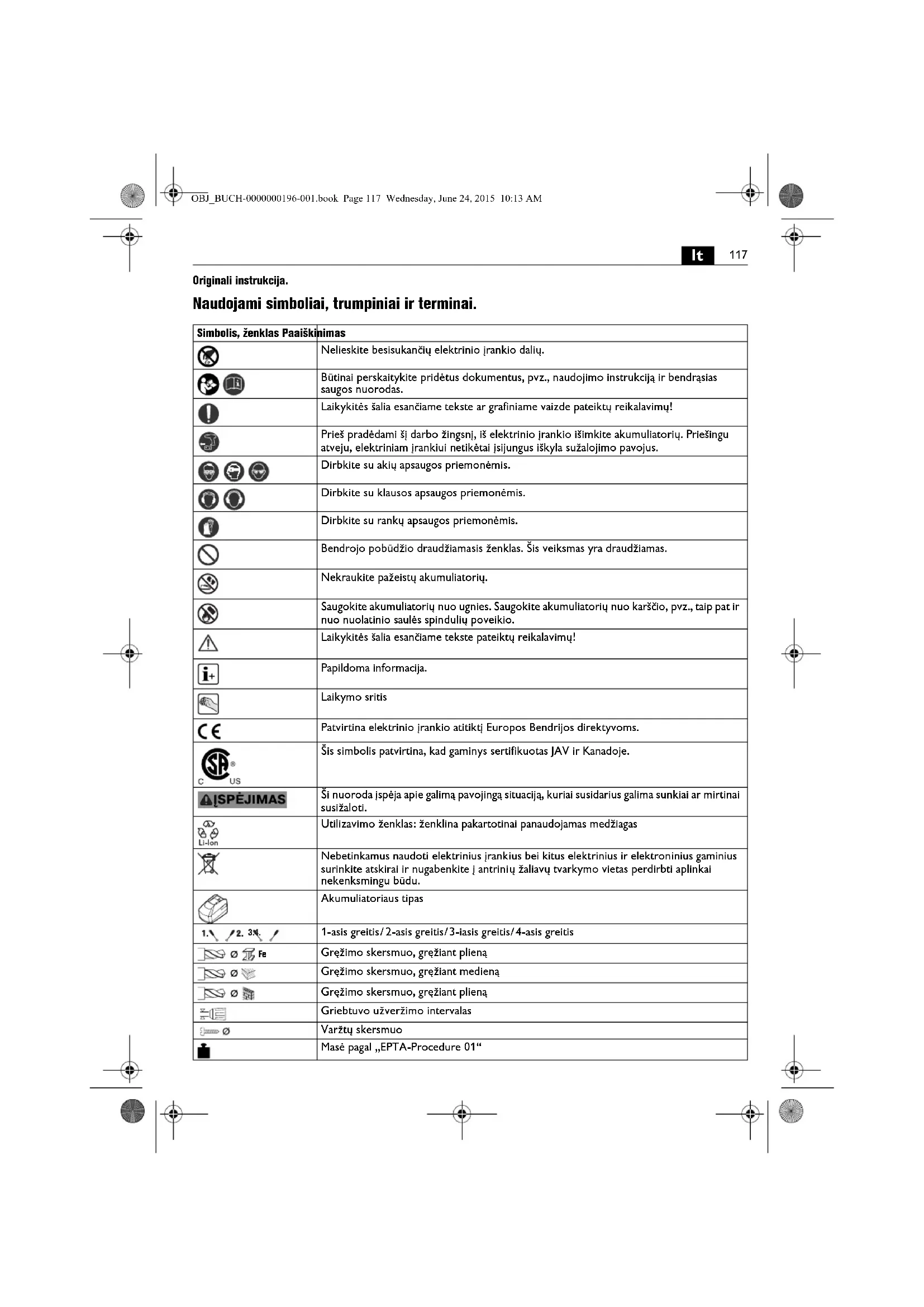 Originali instrukcija. Naudojami simboliai, trumpiniai ir terminai. Simbolis, ženklas Paaiškinimas Nelieskite besisukančių elektrinio įrankio dalių. Būtinai perskaitykite pridėtus dokumentus, pvz., naudojimo instrukciją ir bendrąsias saugos nuorodas. Laikykitės šalia esančiame tekste ar grafiniame vaizde pateiktų reikalavimų! Prieš pradėdami šį darbo žingsnį, iš elektrinio įrankio išimkite akumuliatorių. Priešingu atveju, elektriniam įrankiui netikėtai įsijungus iškyla sužalojimo pavojus. Dirbkite su akių apsaugos priemonėmis. Dirbkite su klausos apsaugos priemonėmis. Dirbkite su rankų apsaugos priemonėmis. Bendrojo pobūdžio draudžiamasis ženklas. Šis veiksmas yra draudžiamas. Nekraukite pažeistų akumuliatorių. Saugokite akumuliatorių nuo ugnies. Saugokite akumuliatorių nuo karščio, pvz., taip pat ir nuo nuolatinio saulės spindulių poveikio. Laikykitės šalia esančiame tekste pateiktų reikalavimų! Papildoma informacija. Laikymo sritis Patvirtina elektrinio įrankio atitiktį Europos Bendrijos direktyvoms. Šis simbolis patvirtina, kad gaminys sertifikuotas JAV ir Kanadoje. Ši nuoroda įspėja apie galimą pavojingą situaciją, kuriai susidarius galima sunkiai ar mirtinai susižaloti. Utilizavimo ženklas: ženklina pakartotinai panaudojamas medžiagas Nebetinkamus naudoti elektrinius įrankius bei kitus elektrinius ir elektroninius gaminius surinkite atskirai ir nugabenkite į antrini ų žaliavų tvarkymo vietas perdirbti aplinkai nekenksmingu būdu. Akumuliatoriaus tipas 1-asis greitis/ 2-asis greitis/3-iasis greitis/4-asis greitis Gręžimo skersmuo, gręžiant plieną Gręžimo skersmuo, gręžiant medieną Gręžimo skersmuo, gręžiant plieną Griebtuvo užveržimo intervalas Varžtų skersmuo Masė pagal „EPTA-Procedure 01“