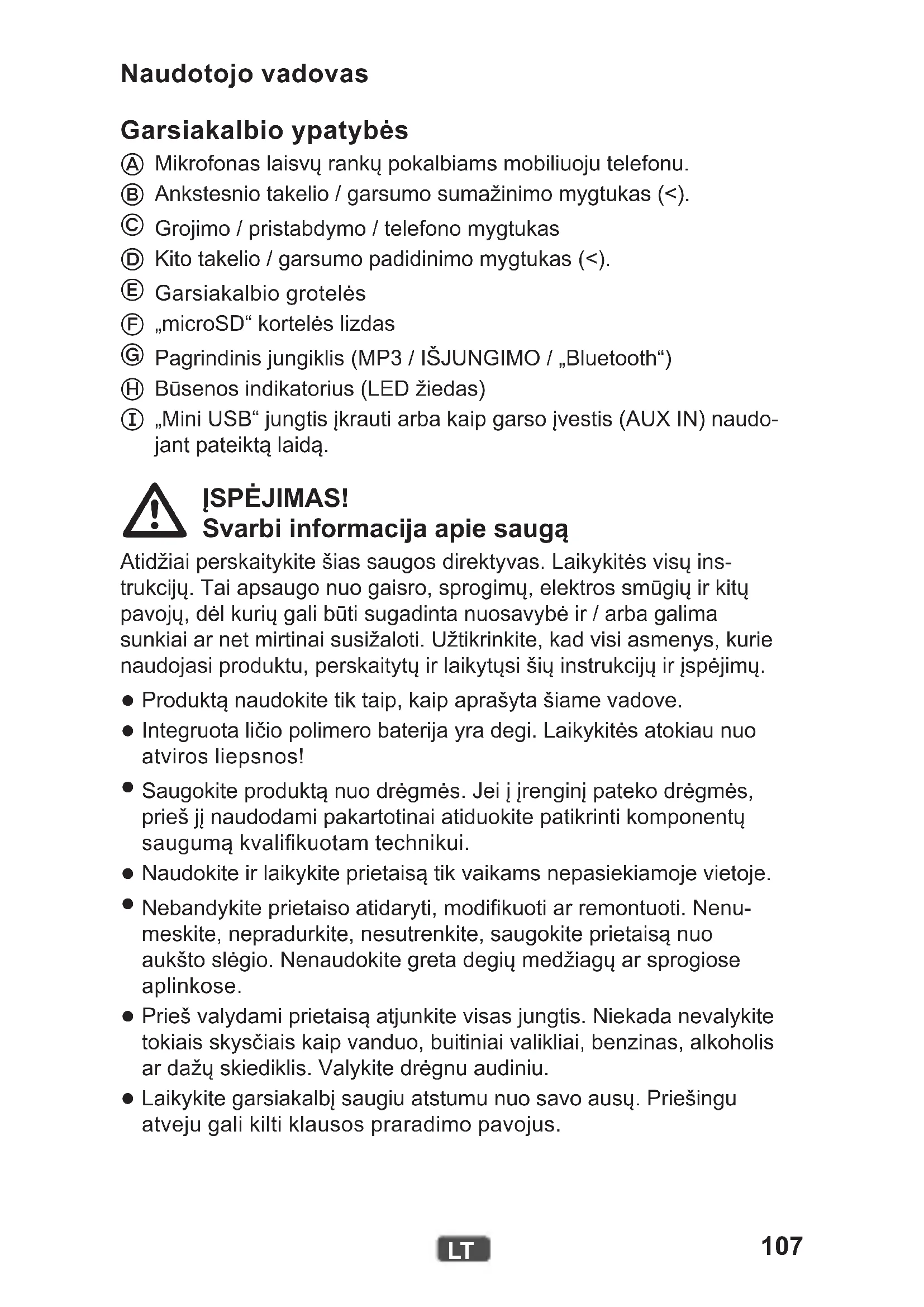 kompiuterio USB prievado arba pasirinktinio USB maitinimo adapterio. Įkrovimo metu būsenos indikatorius šviečia raudonai. Kai įkrovimo eigos procesas baigsis, indikatorius užges. Būsenos indikatoriaus reikšmė Spalva Būklė Reikšmė Žalia Mirksi “microSD” kortelė pasirinkta MP3 turiniui atkurti Šviečia nemirksėdami “microSD” atkūrimas pristabdytas arba aktyvi įvestis AUX IN Mėlyna Mirksi Nustatytas “Bluetooth” ryšys Mėlyna / raudona Mirksi Aktyvus “Bluetooth” suporavimo režimas Raudona Mirksi Akumuliatorius išsekęs Šviečia nemirksėdami Akumuliatorius įkraunamas Išjungti Akumuliatorius pilnai įkrautas109