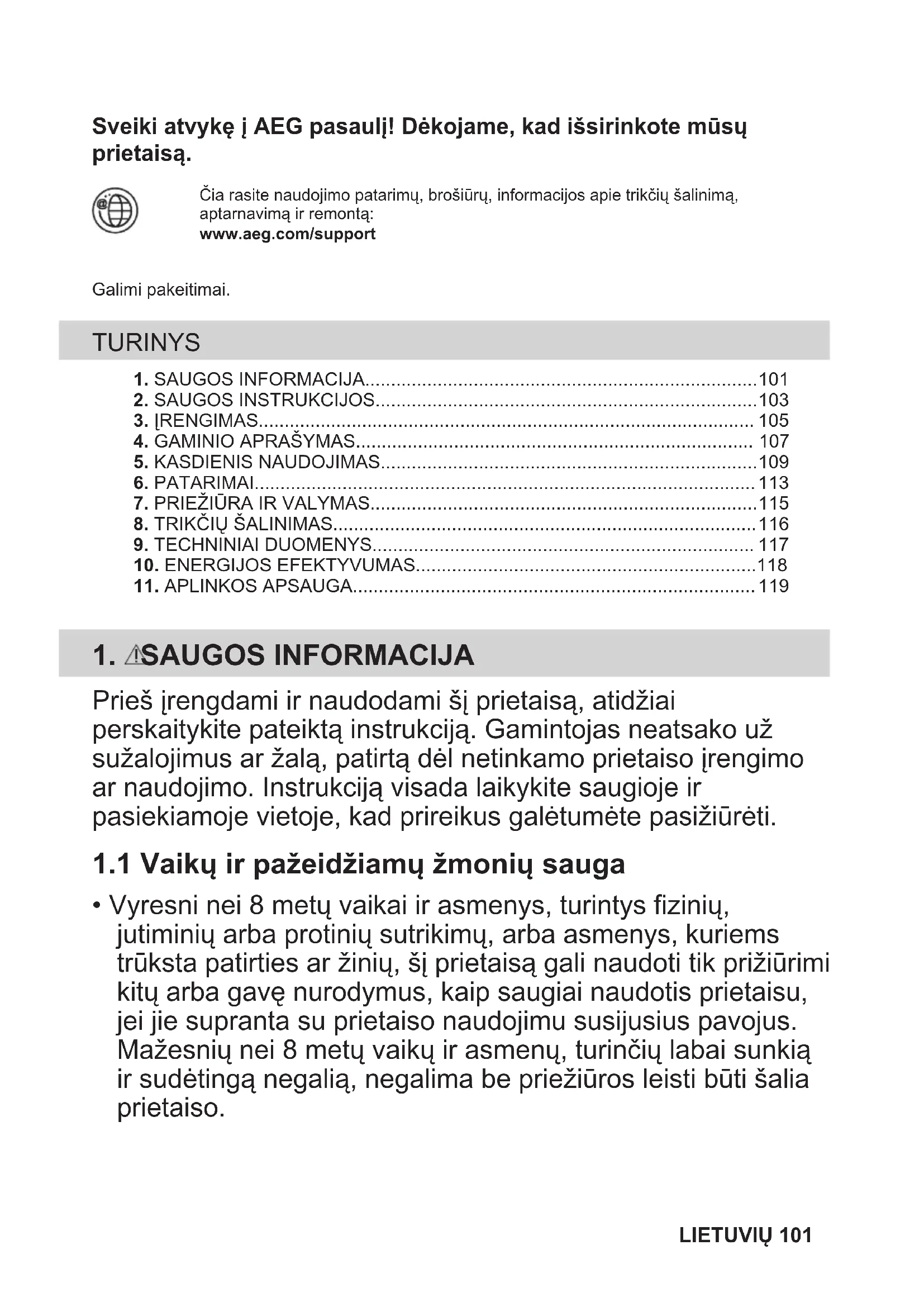 - Vyresni nei 8 metų vaikai ir asmenys, turintys fizinių, jutiminių arba protinių sutrikimų, arba asmenys, kuriems trūksta patirties ar žinių, šį prietaisą gali naudoti tik prižiūrimi kitų arba gavę nurodymus, kaip saugiai naudotis prietaisu, jei jie supranta su prietaiso naudojimu susijusius pavojus. Mažesnių nei 8 metų vaikų ir asmenų, turinčių labai sunkią ir sudėtingą negalią, negalima be priežiūros leisti būti šalia prietaiso. LIETUVIŲ 101• Nuolat prižiūrėkite vaikus ir pasirūpinkite, kad jie nežaistų su šiuo buitiniu prietaisu.
