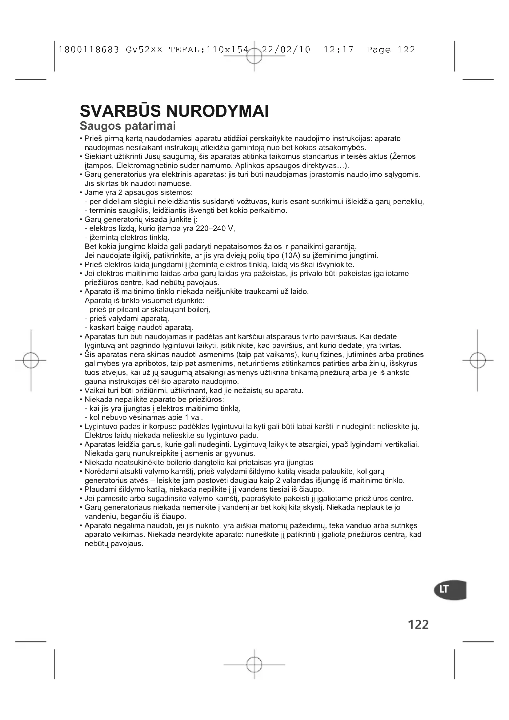 - Norėdami geriau išplauti katiliuką, procesą pakartokite. Iškilo problemų? Problemos Galimos priežastys Sprendimai Neužsidega garų generatoriaussignalas arba lygintuvo šviesossignalas.Nra aparatui reikiamos įtampos. Patikrinkite, ar aparatas gerai įjungtas į vei-kiantį elektros lizdą ir yra jam reikalingaįtampa.Vanduo teka per pado skylutes. Neteisingai nustatytas termosta-tas: temperatūra per žema. Kreipkits į įgaliotą priežiūros centrą.Naudojate garus, kai lygintuvasnra pakankamai įkaitęs.Patikrinkite, kaip nustatytas termostatas.Prieš įjungdami garų valdymo mygtuką pa-laukite, kol lygintuvo šviesos signalas užges.Vamzdeliuose susikondensavo van-duo, nes garus naudojate pirmą kartąarba kurį laiką jų nenaudojote.Garų valdymo mygtuką spauskite lygintuvąlaikydami toliau nuo lyginimo stalo, kol iš ly-gintuvo prads eiti garai.Niekada eatsukitegarų kati-liuko dangte- io, kol einagarai.Jeigu jūsų vanduo yrakietas, garų katiliukąskalaukite dažniau.Skalaudami niekadanenaudokite priemoniųkalkių nuosėdoms valyti,nes tai gali pakenktiprietaisui.Niekada nedėkite lygintuvo antmetalinės dangos, nes tai gali jįsugadinti. Lygintuvą dėkite antgeneratoriaus paviršiujeesančio lygintuvo padėklo suneslystančiu ir aukštaitemperatūrai atspariupaviršiumi. 1800118683 GV52XX TEFAL:110x154 22/02/10 12:17 Page 125126 Jei negalima nustatyti gedimo priežasties, kreipkitės į centrą, įgaliotą atlikti priežiūrą po pardavimo. Prisidėkime prie aplinkos apsaugos!