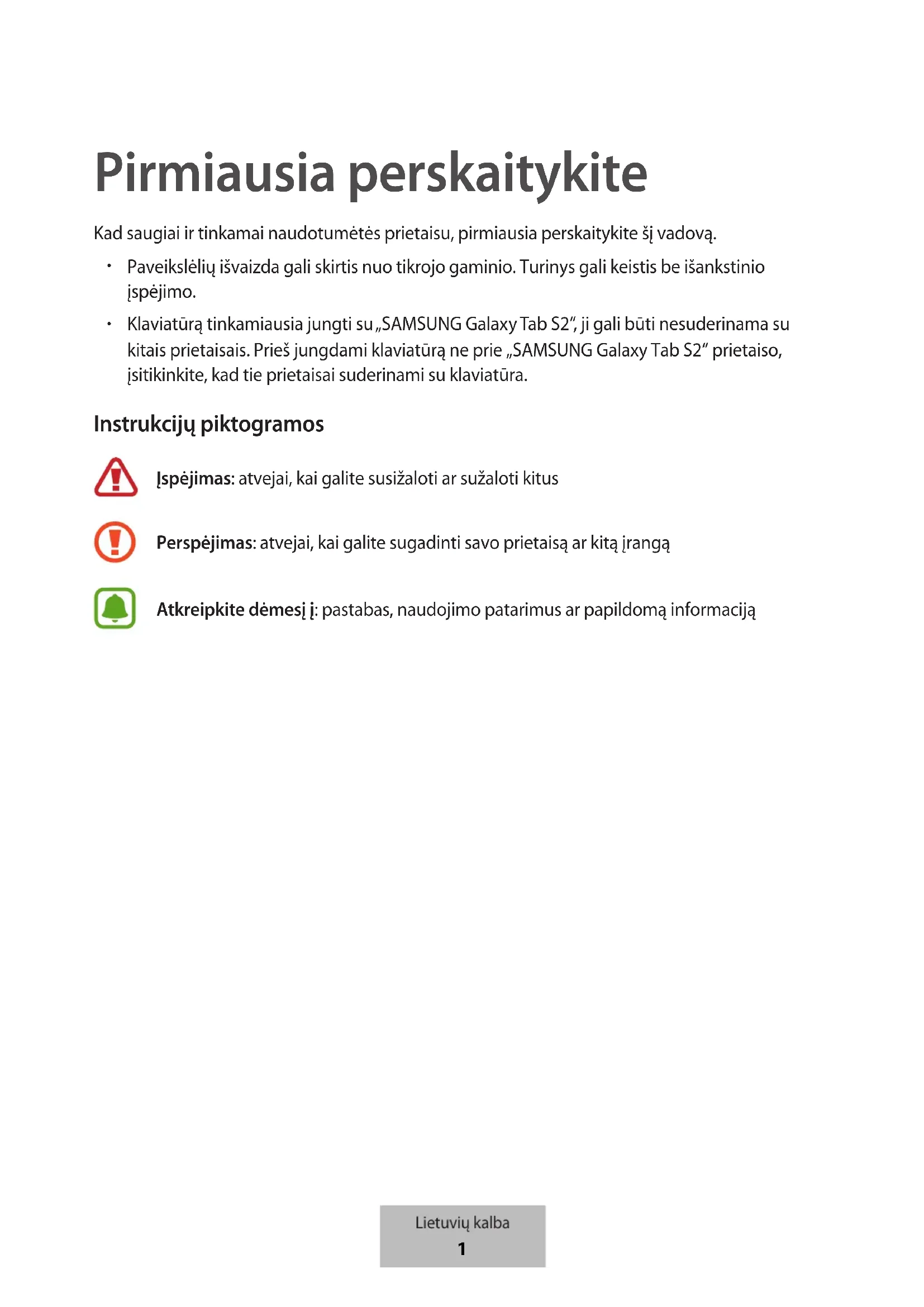 Klaviatūrą tinkamiausia jungti su „SAMSUNG Galaxy Tab S2“, ji gali būti nesuderinama su kitais prietaisais. Prieš jungdami klaviatūrą ne prie „SAMSUNG Galaxy Tab S2“ prietaiso, įsitikinkite, kad tie prietaisai suderinami su klaviatūra. Instrukcijų piktogramos Įspėjimas: atvejai, kai galite susižaloti ar sužaloti kitus Perspėjimas: atvejai, kai galite sugadinti savo prietaisą ar kitą įrangą Atkreipkite dėmesį į: pastabas, naudojimo patarimus ar papildomą informaciją Lietuvių kalba