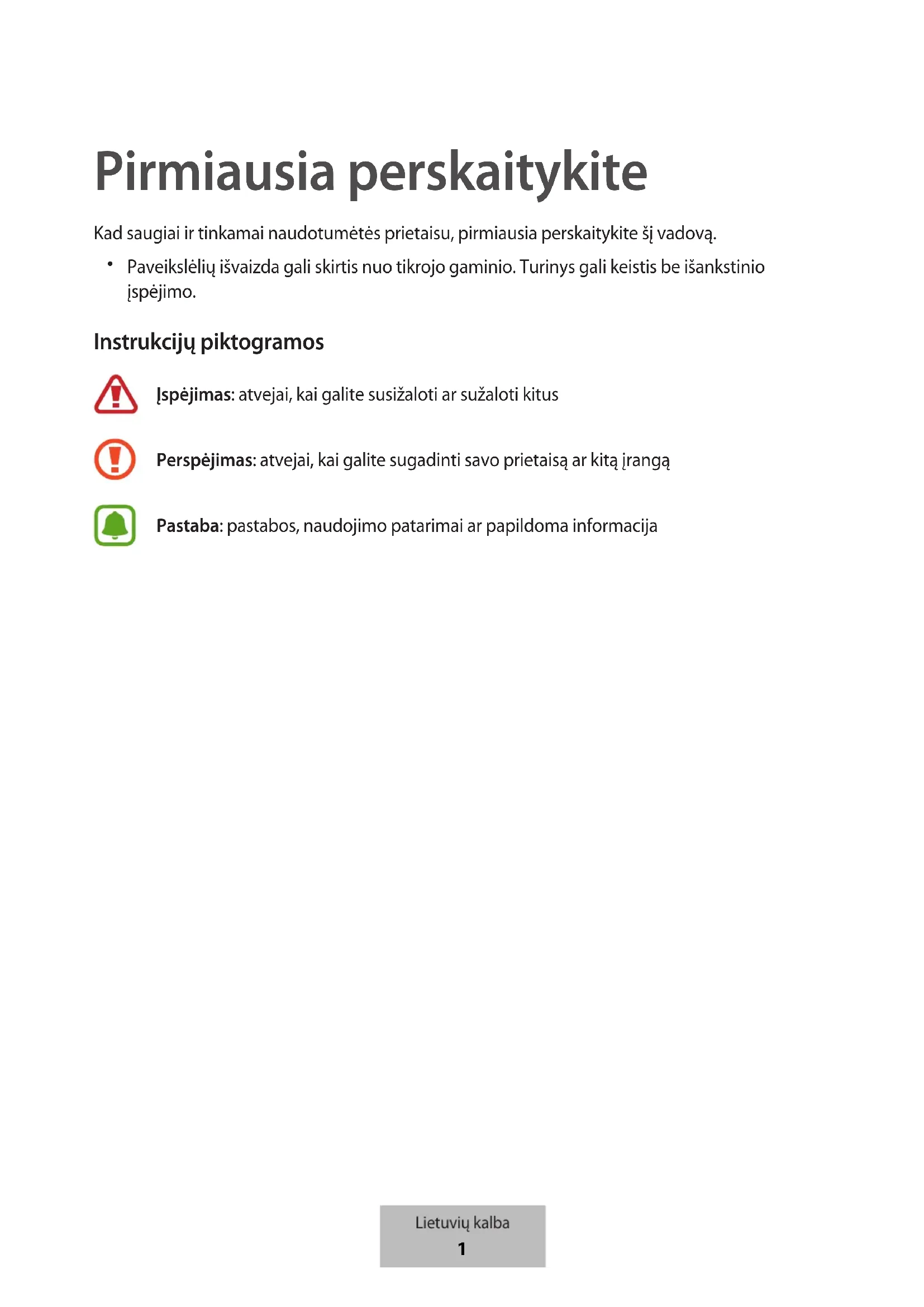 Paveikslėlių išvaizda gali skirtis nuo tikrojo gaminio. Turinys gali keistis be išankstinio įspėjimo. Instrukcijų piktogramos Įspėjimas: atvejai, kai galite susižaloti ar sužaloti kitus Perspėjimas: atvejai, kai galite sugadinti savo prietaisą ar kitą įrangą Pastaba: pastabos, naudojimo patarimai ar papildoma informacija Lietuvių kalba