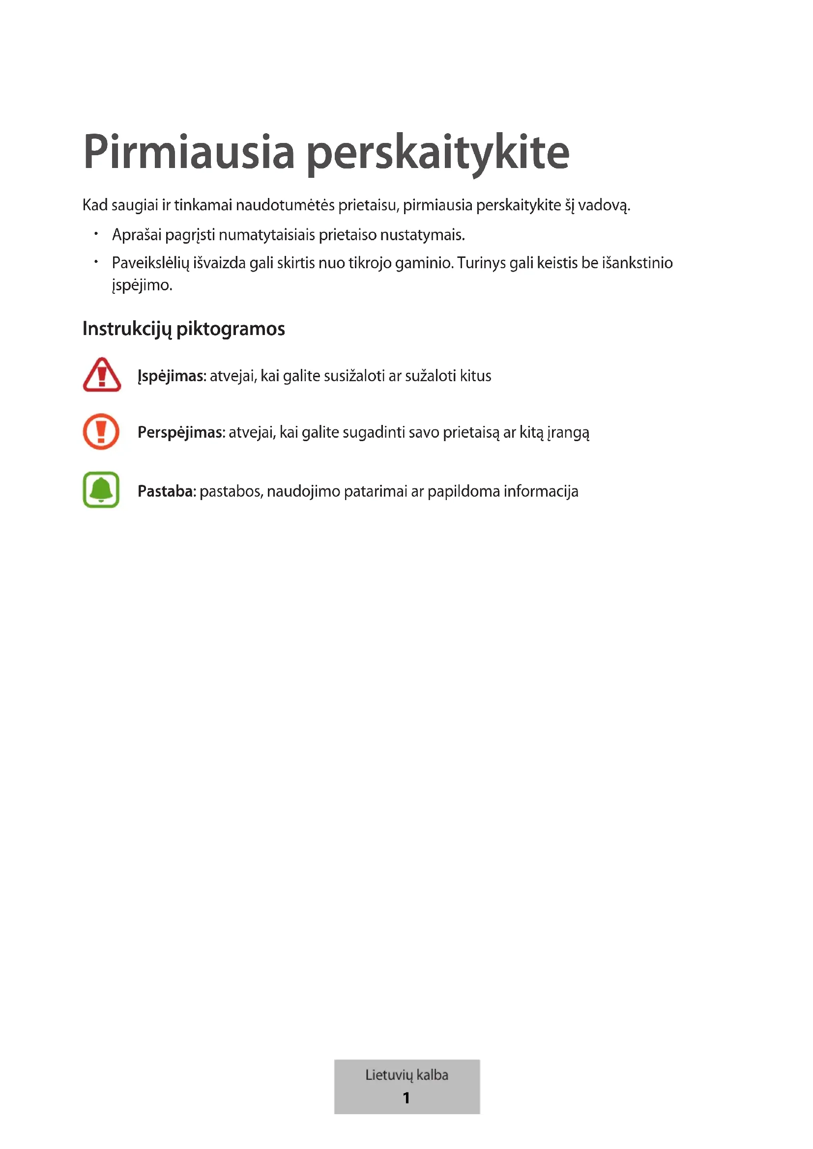 Paveikslėlių išvaizda gali skirtis nuo tikrojo gaminio. Turinys gali keistis be išankstinio įspėjimo. Instrukcijų piktogramos Įspėjimas: atvejai, kai galite susižaloti ar sužaloti kitus Perspėjimas: atvejai, kai galite sugadinti savo prietaisą ar kitą įrangą Pastaba: pastabos, naudojimo patarimai ar papildoma informacija Lietuvių kalba