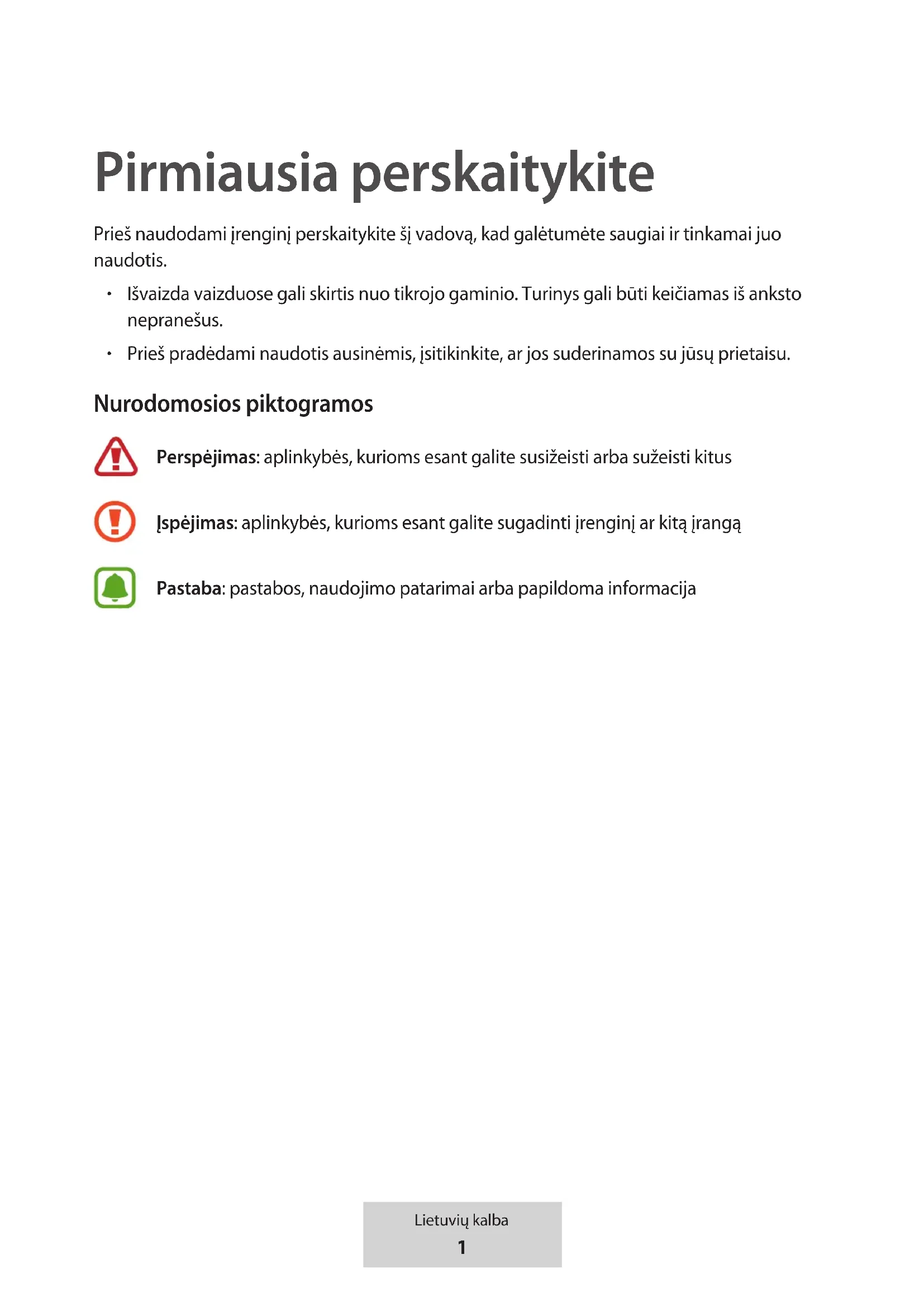 Citas neminētās preču zīmes un autortiesības pieder to īpašniekiem.1 Lietuvių kalba Pirmiausia perskaitykite Prieš naudodami įrenginį perskaitykite šį vadovą, kad galėtumėte saugiai ir tinkamai juo naudotis.