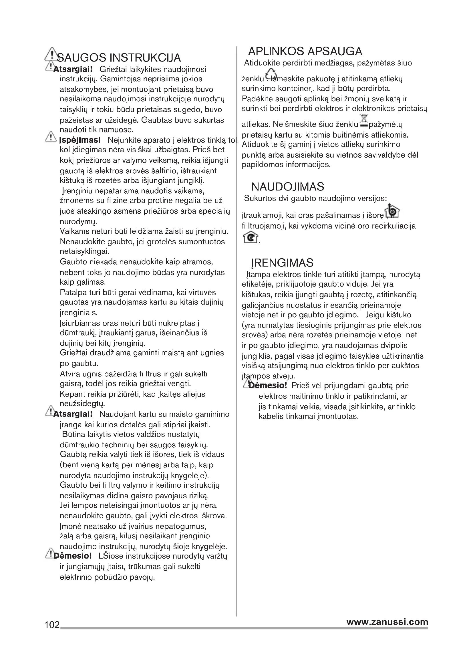 (5) iesūkšanas jauda. Izmantot augstāku ātrumu īpašas virtuves dūmu koncentrācijas gadījumā. Iesakām ieslēgt iesūkšanu 5 minūtes pirms ēdiena gatavošanas sākšanas un neslēgt to ārā vēl 15 minūtes pēc ēdiena gatavošanas pabeigšanas. APGAISMOJUMS Atvienot ierīci no elektriskās sistēmas. Uzmanību! Pirms pieskarties spuldzēm, pārliecināties, ka tās ir aukstas. Nomainīt bojātu spuldzi ar tāda paša veida spuldzi, kā tas norādīts uz īpašību etiķetes vai arī kā tas ir norādīts uz pašas spuldzes gaisa nosūcējā (E14).102 www.zanussi.com SAUGOS INSTRUKCIJA Atsargiai! Griežtai laikykitės naudojimosi instrukcijų. Gamintojas neprisiima jokios atsakomybės, jei montuojant prietaisą buvo nesilaikoma naudojimosi instrukcijoje nurodytų taisyklių ir tokiu būdu prietaisas sugedo, buvo pažeistas ar užsidegė. Gaubtas buvo sukurtas naudoti tik namuose. Įspėjimas! Nejunkite aparato į elektros tinklą tol, kol įdiegimas nėra visiškai užbaigtas. Prieš bet kokį priežiūros ar valymo veiksmą, reikia išjungti gaubtą iš elektros srovės šaltinio, ištraukiant kištuką iš rozetės arba išjungiant jungiklį. Įrenginiu nepatariama naudotis vaikams, žmonėms su fi zine arba protine negalia be už juos atsakingo asmens priežiūros arba specialių nurodymų. Vaikams neturi būti leidžiama žaisti su įrenginiu. Nenaudokite gaubto, jei grotelės sumontuotos netaisyklingai. Gaubto niekada nenaudokite kaip atramos, nebent toks jo naudojimo būdas yra nurodytas kaip galimas. Patalpa turi būti gerai vėdinama, kai virtuvės gaubtas yra naudojamas kartu su kitais dujinių įrenginiais. Įsiurbiamas oras neturi būti nukreiptas į dūmtraukį, įtraukiantį garus, išeinančius iš dujinių bei kitų įrenginių. Griežtai draudžiama gaminti maistą ant ugnies po gaubtu. Atvira ugnis pažeidžia fi ltrus ir gali sukelti gaisrą, todėl jos reikia griežtai vengti. Kepant reikia prižiūrėti, kad įkaitęs aliejus neužsidegtų. Atsargiai! Naudojant kartu su maisto gaminimo įranga kai kurios detalės gali stipriai įkaisti. Būtina laikytis vietos valdžios nustatytų dūmtraukio techninių bei saugos taisyklių. Gaubtą reikia valyti tiek iš išorės, tiek iš vidaus (bent vieną kartą per mėnesį arba taip, kaip nurodyta naudojimo instrukcijų knygelėje). Gaubto bei fi ltrų valymo ir keitimo instrukcijų nesilaikymas didina gaisro pavojaus riziką. Jei lempos neteisingai įmontuotos ar jų nėra, nenaudokite gaubto, gali įvykti elektros iškrova. Įmonė neatsako už įvairius nepatogumus, žalą arba gaisrą, kilusį nesilaikant įrenginio naudojimo instrukcijų, nurodytų šioje knygelėje. Dėmesio! LŠiose instrukcijose nurodytų varžtų ir jungiamųjų įtaisų trūkumas gali sukelti elektrinio pobūdžio pavojų. APLINKOS APSAUGA Atiduokite perdirbti medžiagas, pažymėtas šiuo ženklu . Išmeskite pakuotę į atitinkamą atliekų surinkimo konteinerį, kad ji būtų perdirbta. Padėkite saugoti aplinką bei žmonių sveikatą ir surinkti bei perdirbti elektros ir elektronikos prietaisų atliekas. Neišmeskite šiuo ženklu pažymėtų prietaisų kartu su kitomis buitinėmis atliekomis. Atiduokite šį gaminį į vietos atliekų surinkimo punktą arba susisiekite su vietnos savivaldybe dėl papildomos informacijos. NAUDOJIMAS Sukurtos dvi gaubto naudojimo versijos: įtraukiamoji, kai oras pašalinamas į išorę , ir fi ltruojamoji, kai vykdoma vidinė oro recirkuliacija