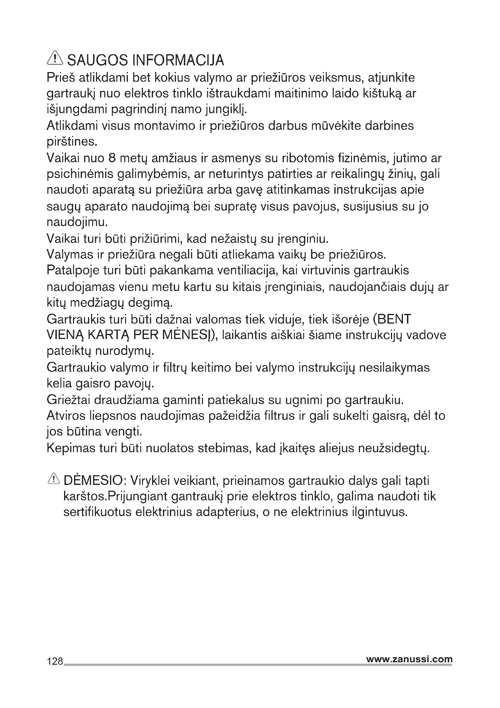 iesūkšanas jauda. Izmantot augstāku ātrumu īpašas virtuves dūmu koncentrācijas gadījumā. Iesakām ieslēgt iesūkšanu 5 minūtes pirms ēdiena gatavošanas sākšanas un neslēgt to ārā vēl 15 minūtes pēc ēdiena gatavošanas pabeigšanas. APGAISMOJUMS Gaisa nosūcējs ir aprīkots ar apgaismošanas sistēmu, kas pamatojas uz LED tehnoloģiju. LED nodrošina optimālu apgaismošanu, kas ilgst 10 reizes vairāk par tradicionālajām spuldzītēm un ļauj ietaupīt 90% elektriskās enerģijas. Uzmanību! Neskatīties pa tiešo uz LED gaismām. Nomainīšanai griezties uz tehniskās apkalpošanas servisu.128 www.zanussi.com SAUGOS INFORMACIJA Prieš atlikdami bet kokius valymo ar priežiūros veiksmus, atjunkite gartraukį nuo elektros tinklo ištraukdami maitinimo laido kištuką ar išjungdami pagrindinį namo jungiklį. Atlikdami visus montavimo ir priežiūros darbus mūvėkite darbines pirštines. Vaikai nuo 8 metų amžiaus ir asmenys su ribotomis fizinėmis, jutimo ar psichinėmis galimybėmis, ar neturintys patirties ar reikalingų žinių, gali naudoti aparatą su priežiūra arba gavę atitinkamas instrukcijas apie saugų aparato naudojimą bei supratę visus pavojus, susijusius su jo naudojimu. Vaikai turi būti prižiūrimi, kad nežaistų su įrenginiu. Valymas ir priežiūra negali būti atliekama vaikų be priežiūros. Patalpoje turi būti pakankama ventiliacija, kai virtuvinis gartraukis naudojamas vienu metu kartu su kitais įrenginiais, naudojančiais dujų ar kitų medžiagų degimą. Gartraukis turi būti dažnai valomas tiek viduje, tiek išorėje (BENT VIENĄ KARTĄ PER MĖNESĮ), laikantis aiškiai šiame instrukcijų vadove pateiktų nurodymų. Gartraukio valymo ir filtrų keitimo bei valymo instrukcijų nesilaikymas kelia gaisro pavojų. Griežtai draudžiama gaminti patiekalus su ugnimi po gartraukiu. Atviros liepsnos naudojimas pažeidžia filtrus ir gali sukelti gaisrą, dėl to jos būtina vengti. Kepimas turi būti nuolatos stebimas, kad įkaitęs aliejus neužsidegtų. DĖMESIO: Viryklei veikiant, prieinamos gartraukio dalys gali tapti karštos.Prijungiant gantraukį prie elektros tinklo, galima naudoti tik sertifikuotus elektrinius adapterius, o ne elektrinius ilgintuvus.129 www.zanussi.com SAUGOS INSTRUKCIJOS Lempos keitimui naudokite tik šių instrukcijų vadove esančiame priežiūros skyriuje nurodytus lempų tipus. Dėmesio! Nejunkite įrenginio prie elektros tinklo, kol jis nėra visiškai sumontuotas. Griežtai laikykitės vietinės valdžios pateiktų taisyklių dėl išmetamų dūmų techninių matmenų ir saugumo. Įsiurbiamas oras negali būti išleidžiamas į vamzdyną naudojamą dūmų, susidariusių dėl dujų ar kitų medžiagų degimo, išmetimui. Nenaudokite ir nepalikite gartraukio tinkamai nesumontavę lempų, nes rizikuojate elektros nutrenkimu. Niekuomet nenaudokite gartraukio tinkamai nesumontavę grotelių! Gartraukis JOKIAIS BŪDAIS negali būti naudojamas, kaip atrama, nebent aiškiai nurodyta kitaip. Montavimui naudokite tik kartu su gaminiu gautus tvirtinimo varžtus, o jeigu jų negavote, naudokite tinkamo tipo varžtus. Naudokite tinkamo ilgio varžtus, kuris nurodytas Montavimo vadove. Iškilus dvejonėms, kreipkitės į įgaliotą aptarnavimo centrą ar panašų kvalifikuotą personalą. DĖMESIO! Netinkamai sumontavus varžtus ir kitas tvirtinimo detales nurodytas šiose instrukcijose, gali kilti pavojų su elektra. APLINKOS APSAUGA Atiduokite perdirbti medžiagas, pažymėtas šiuo ženklu . Išmeskite pakuotę į atitinkamą atliekų surinkimo konteinerį, kad ji būtų perdirbta. Padėkite saugoti aplinką bei žmonių sveikatą ir surinkti bei perdirbti elektros ir elektronikos prietaisų atliekas. Neišmeskite šiuo ženklu pažymėtų prietaisų kartu su kitomis buitinėmis atliekomis. Atiduokite šį gaminį į vietos atliekų surinkimo punktą arba susisiekite su vietnos savivaldybe dėl papildomos informacijos. NAUDOJIMAS Sukurtos dvi gaubto naudojimo versijos: įtraukiamoji, kai oras pašalinamas į išorę , ir filtruojamoji, kai vykdoma vidinė oro recirkuliacija