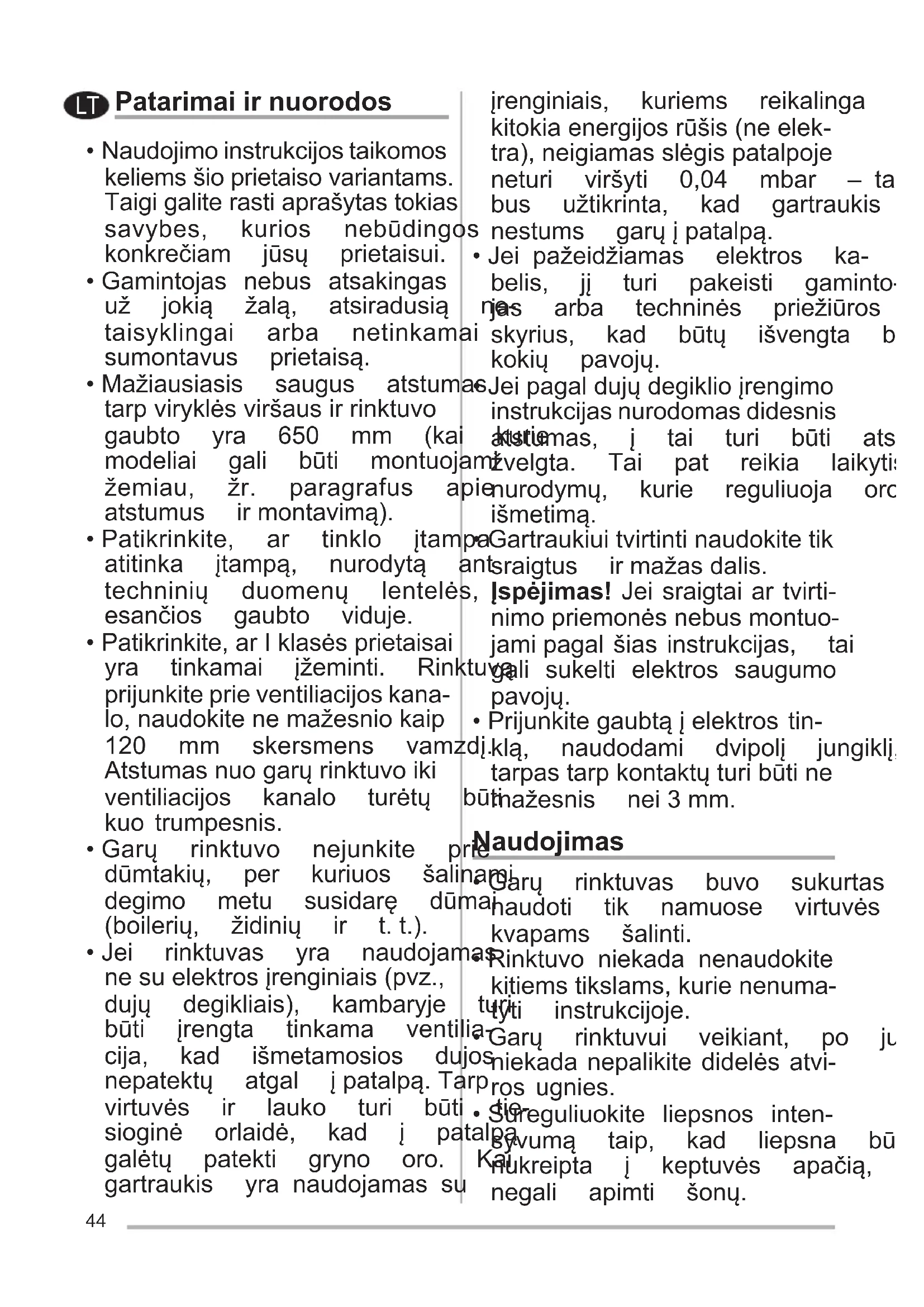 - Garų rinktuvo nejunkite prie dūmtakių, per kuriuos šalinami degimo metu susidarę dūmai (boilerių, židinių ir t.t.).