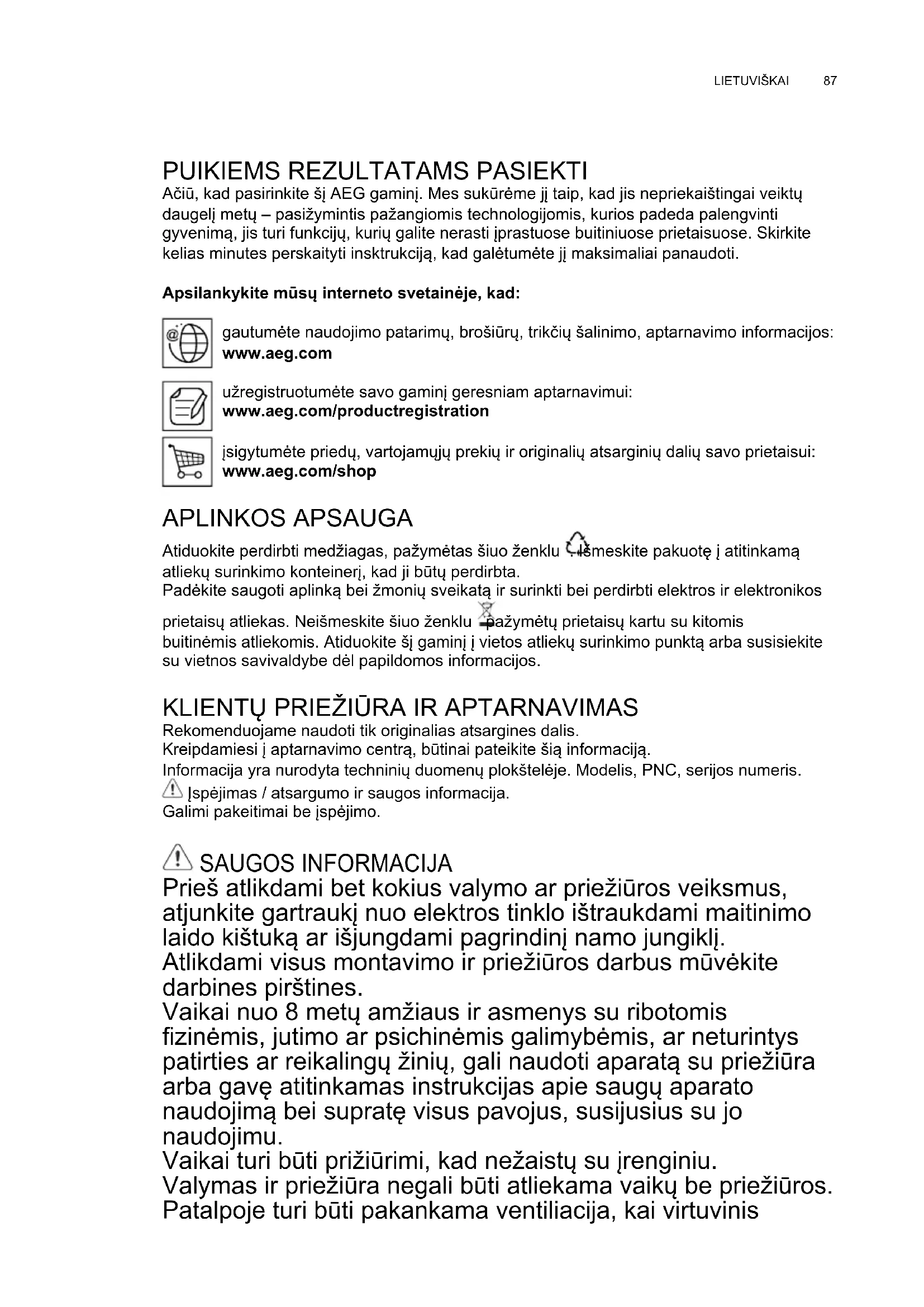 Ačiū, kad pasirinkite šį AEG gaminį. Mes sukūrėme jį taip, kad jis nepriekaištingai veiktų daugelį metų – pasižymintis pažangiomis technologijomis, kurios padeda palengvinti gyvenimą, jis turi funkcijų, kurių galite nerasti įprastuose buitiniuose prietaisuose. Skirkite kelias minutes perskaityti insktrukciją, kad galėtumėte jį maksimaliai panaudoti. Apsilankykite mūsų interneto svetainėje, kad: gautumėte naudojimo patarimų, brošiūrų, trikčių šalinimo, aptarnavimo informacijos: www.aeg.com užregistruotumėte savo gaminį geresniam aptarnavimui: www.aeg.com/productregistration įsigytumėte priedų, vartojamųjų prekių ir originalių atsarginių dalių savo prietaisui: www.aeg.com/shop APLINKOS APSAUGA Atiduokite perdirbti medžiagas, pažymėtas šiuo ženklu . Išmeskite pakuotę į atitinkamą atliekų surinkimo konteinerį, kad ji būtų perdirbta. Padėkite saugoti aplinką bei žmonių sveikatą ir surinkti bei perdirbti elektros ir elektronikos prietaisų atliekas. Neišmeskite šiuo ženklu pažymėtų prietaisų kartu su kitomis buitinėmis atliekomis. Atiduokite šį gaminį į vietos atliekų surinkimo punktą arba susisiekite su vietnos savivaldybe dėl papildomos informacijos.