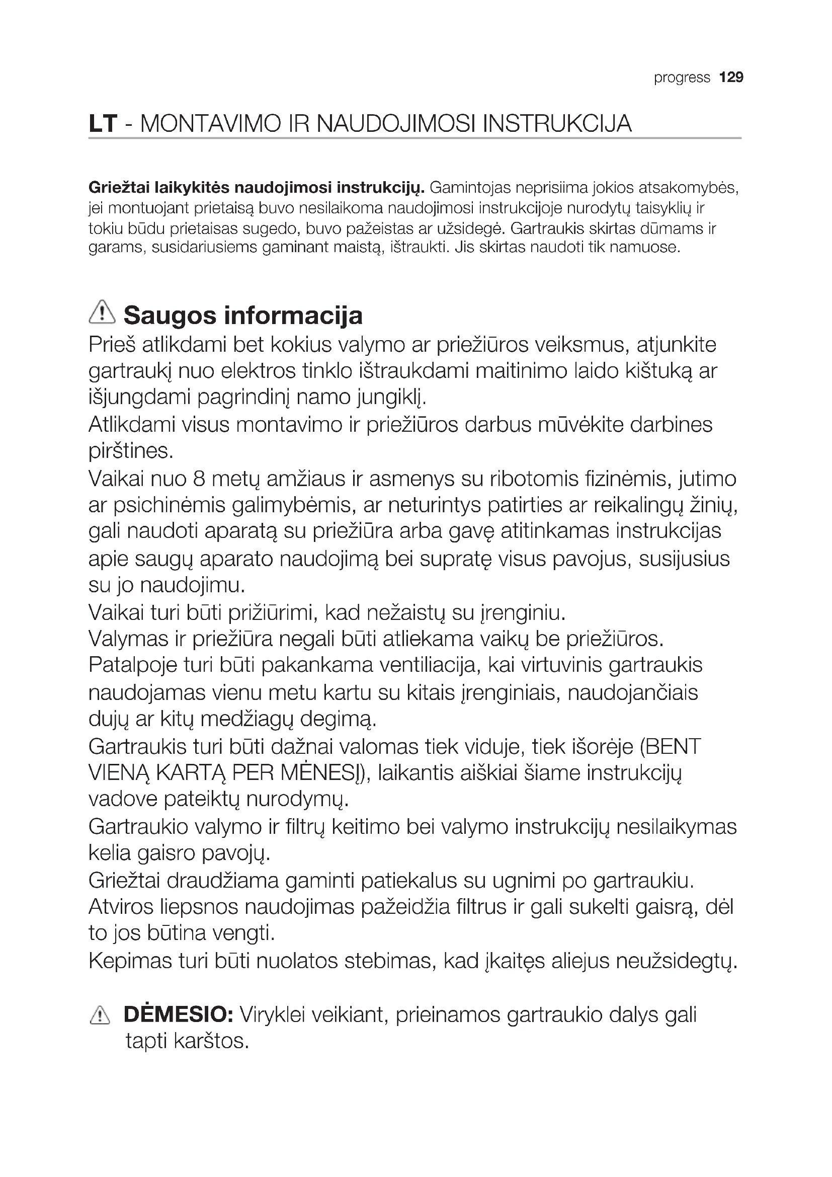 Griežtai laikykitės naudojimosi instrukcijų. Gamintojas neprisiima jokios atsakomybės, jei montuojant prietaisą buvo nesilaikoma naudojimosi instrukcijoje nurodytų taisyklių ir tokiu būdu prietaisas sugedo, buvo pažeistas ar užsidegė. Gartraukis skirtas dūmams ir garams, susidariusiems gaminant maistą, ištraukti. Jis skirtas naudoti tik namuose. Saugos informacija Prieš atlikdami bet kokius valymo ar priežiūros veiksmus, atjunkite gartraukį nuo elektros tinklo ištraukdami maitinimo laido kištuką ar išjungdami pagrindinį namo jungiklį. Atlikdami visus montavimo ir priežiūros darbus mūvėkite darbines pirštines. Vaikai nuo 8 metų amžiaus ir asmenys su ribotomis fizinėmis, jutimo ar psichinėmis galimybėmis, ar neturintys patirties ar reikalingų žinių, gali naudoti aparatą su priežiūra arba gavę atitinkamas instrukcijas apie saugų aparato naudojimą bei supratę visus pavojus, susijusius su jo naudojimu. Vaikai turi būti prižiūrimi, kad nežaistų su įrenginiu. Valymas ir priežiūra negali būti atliekama vaikų be priežiūros. Patalpoje turi būti pakankama ventiliacija, kai virtuvinis gartraukis naudojamas vienu metu kartu su kitais įrenginiais, naudojančiais dujų ar kitų medžiagų degimą. Gartraukis turi būti dažnai valomas tiek viduje, tiek išorėje (BENT VIENĄ KARTĄ PER MĖNESĮ), laikantis aiškiai šiame instrukcijų vadove pateiktų nurodymų. Gartraukio valymo ir filtrų keitimo bei valymo instrukcijų nesilaikymas kelia gaisro pavojų. Griežtai draudžiama gaminti patiekalus su ugnimi po gartraukiu. Atviros liepsnos naudojimas pažeidžia filtrus ir gali sukelti gaisrą, dėl to jos būtina vengti. Kepimas turi būti nuolatos stebimas, kad įkaitęs aliejus neužsidegtų. DĖMESIO: Viryklei veikiant, prieinamos gartraukio dalys gali tapti karštos.130 progress Saugos instrukcijos Lempos keitimui naudokite tik šių instrukcijų vadove esančiame priežiūros skyriuje nurodytus lempų tipus. Dėmesio! Nejunkite įrenginio prie elektros tinklo, kol jis nėra visiškai sumontuotas. Griežtai laikykitės vietinės valdžios pateiktų taisyklių dėl išmetamų dūmų techninių matmenų ir saugumo. Įsiurbiamas oras negali būti išleidžiamas į vamzdyną naudojamą dūmų, susidariusių dėl dujų ar kitų medžiagų degimo, išmetimui. Nenaudokite ir nepalikite gartraukio tinkamai nesumontavę lempų, nes rizikuojate elektros nutrenkimu. Niekuomet nenaudokite gartraukio tinkamai nesumontavę grotelių! Gartraukis JOKIAIS BŪDAIS negali būti naudojamas, kaip atrama, nebent aiškiai nurodyta kitaip. Montavimui naudokite tik kartu su gaminiu gautus tvirtinimo varžtus, o jeigu jų negavote, naudokite tinkamo tipo varžtus. Naudokite tinkamo ilgio varžtus, kuris nurodytas Montavimo vadove. Iškilus dvejonėms, kreipkitės į įgaliotą aptarnavimo centrą ar panašų kvalifikuotą personalą. DĖMESIO! Netinkamai sumontavus varžtus ir kitas tvirtinimo detales nurodytas šiose instrukcijose, gali kilti pavojų su elektra. Aplinkos apsauga Atiduokite perdirbti medžiagas, pažymėtas šiuo ženklu . Išmeskite pakuotę į atitinkamą atliekų surinkimo konteinerį, kad ji būtų perdirbta. Padėkite saugoti aplinką bei žmonių sveikatą ir surinkti bei perdirbti elektros ir elektronikos prietaisų atliekas. Neišmeskite šiuo ženklu pažymėtų prietaisų kartu su kitomis buitinėmis atliekomis. Atiduokite šį gaminį į vietos atliekų surinkimo punktą arba susisiekite su vietnos savivaldybe dėl papildomos informacijos. Naudojimas Sukurtos dvi gaubto naudojimo versijos: įtraukiamoji, kai oras pašalinamas į išorę , ir filtruojamoji, kai vykdoma vidinė oro recirkuliacija . Įrengimas Įtampa elektros tinkle turi atitikti įtampą, nurodytą etiketėje, priklijuotoje gaubto viduje. Jei yra kištukas, reikia įjungti gaubtą į rozetę, atitinkančią galiojančius nuostatus ir esančią prieinamoje vietoje net ir po gaubto įdiegimo. Jeigu kištuko (yra numatytas tiesioginis prijungimas prie elektros srovės) arba nėra rozetės prieinamoje vietoje net ir po gaubto įdiegimo, yra naudojamas dvipolis jungiklis, pagal visas įdiegimo taisykles užtikrinantis visišką atsijungimą nuo elektros tinklo per aukštos įtampos atveju. Dėmesio! Prieš vėl prijungdami gaubtą prie elektros maitinimo tinklo ir patikrindami, ar jis tinkamai veikia, visada įsitikinkite, ar tinklo kabelis tinkamai įmontuotas.progress 131 Prie gaubto pridedamas specialus maitinimo kabelis. Jei pastebėjote, kad kabelis yra pažeistas, nedelsiant kreipkitės į techninės pagalbos centrą dėl kabelio keitimo. Jei viryklė elektrinė, mažiausias atstumas tarp viryklės kaitlentės paviršiaus ir žemiausios virtuvinio gaubto dalies turi būti 50cm, o jei viryklė dujinė ar kombinuota – 65cmo jei viryklė dujinė ar kombinuota. Jei dujinės viryklės įrengimo instrukcijoje nurodomas didesnis atstumas, būtina į tai atsižvelgti. Veikimas Virtuvėje susikaupus dideliam garų kiekiui, naudokite didžiausią greitį. Patartina įjungti ištraukimą prieš 5 minutes pradedant gaminti, o baigus gaminti palikti veikti dar apie 15 minučių.