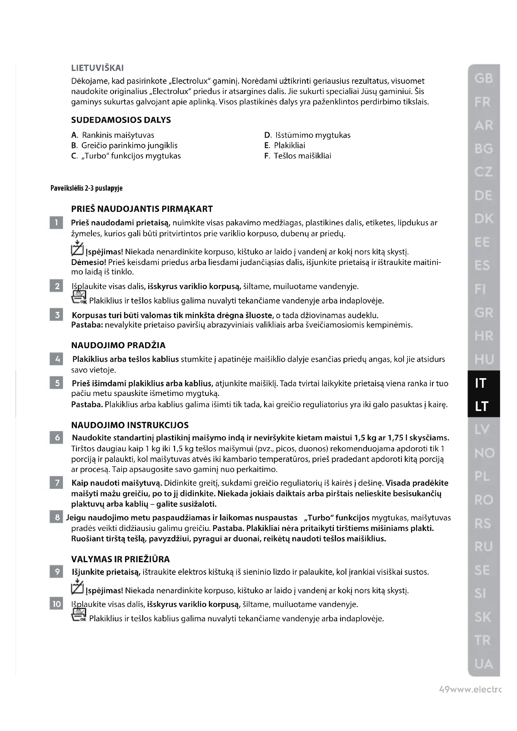 LIETUVIŠKAI Dėkojame, kad pasirinkote „Electrolux“ gaminį. Norėdami užtikrinti geriausius rezultatus, visuomet naudokite originalius „Electrolux“ priedus ir atsargines dalis. Jie sukurti specialiai Jūsų gaminiui. Šis gaminys sukurtas galvojant apie aplinką. Visos plastikinės dalys yra paženklintos perdirbimo tikslais. SUDEDAMOSIOS DALYS A. Rankinis maišytuvas B. Greičio parinkimo jungiklis C. „Turbo“ funkcijos mygtukas D. Išstūmimo mygtukas E. Plakikliai F. Tešlos maišikliai Paveikslėlis 2-3 puslapyje